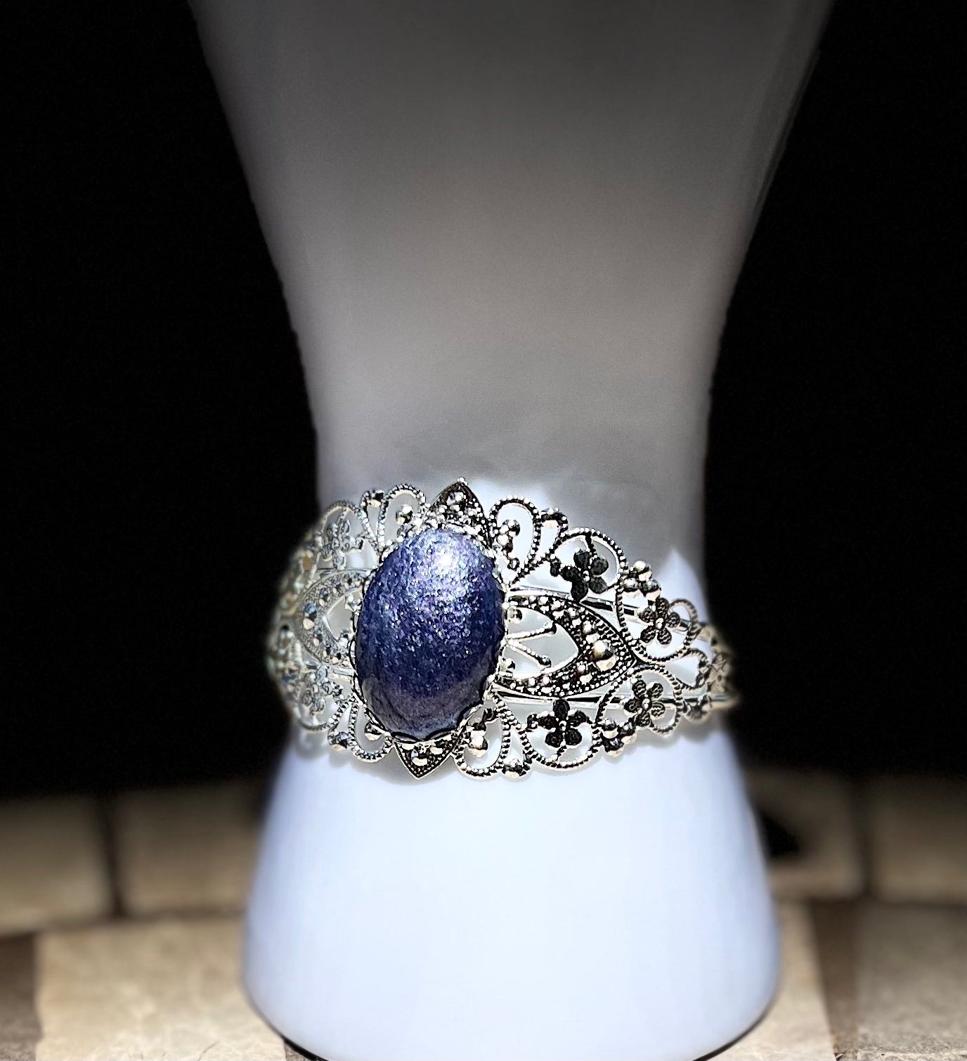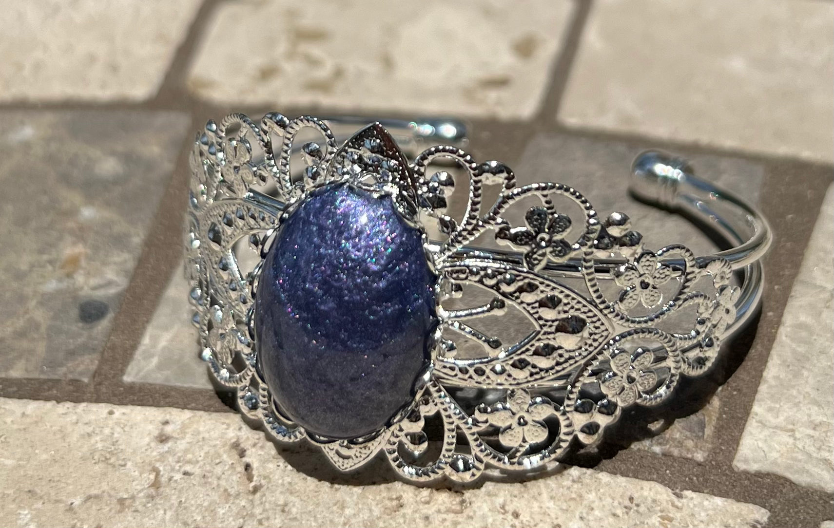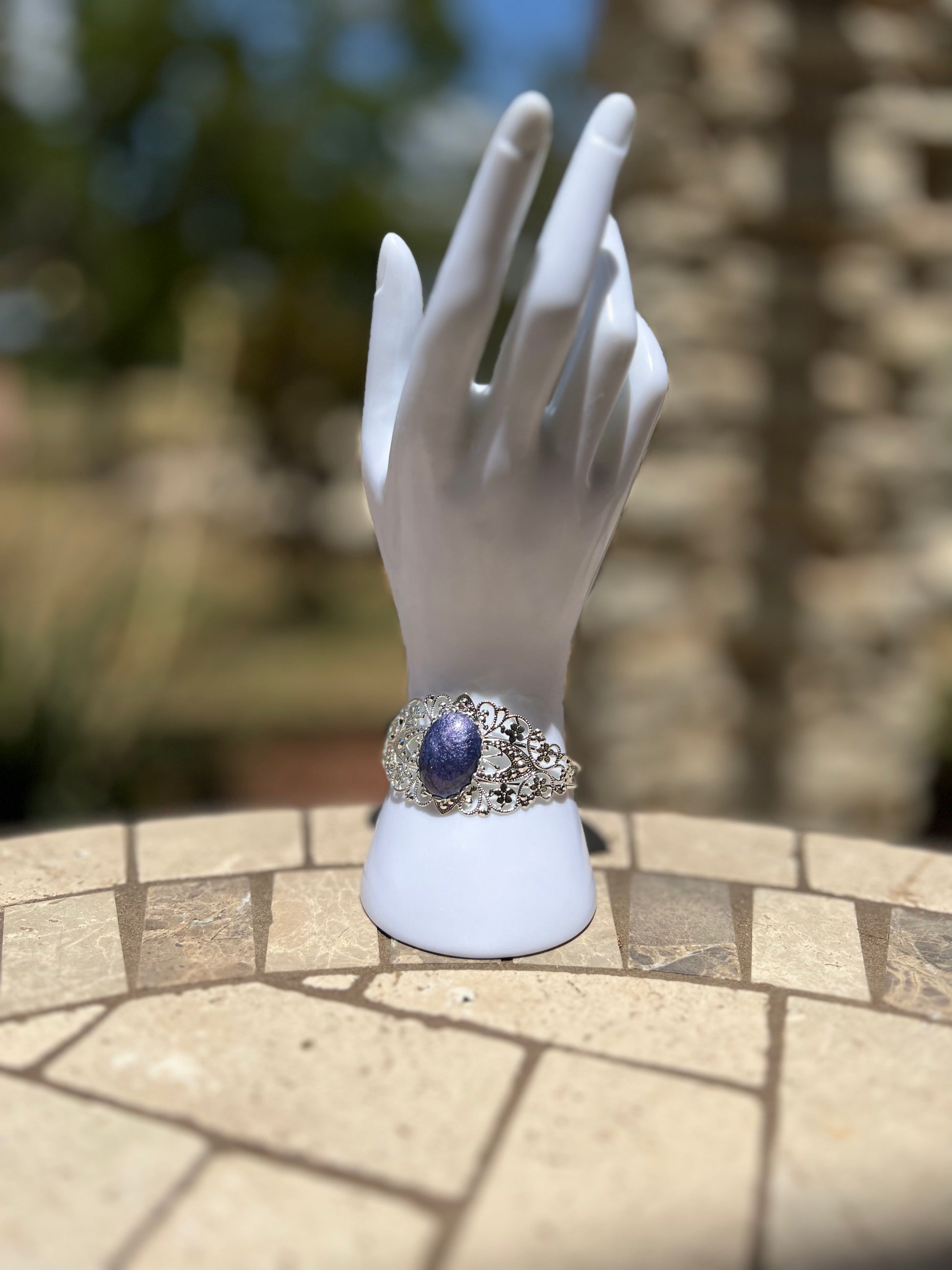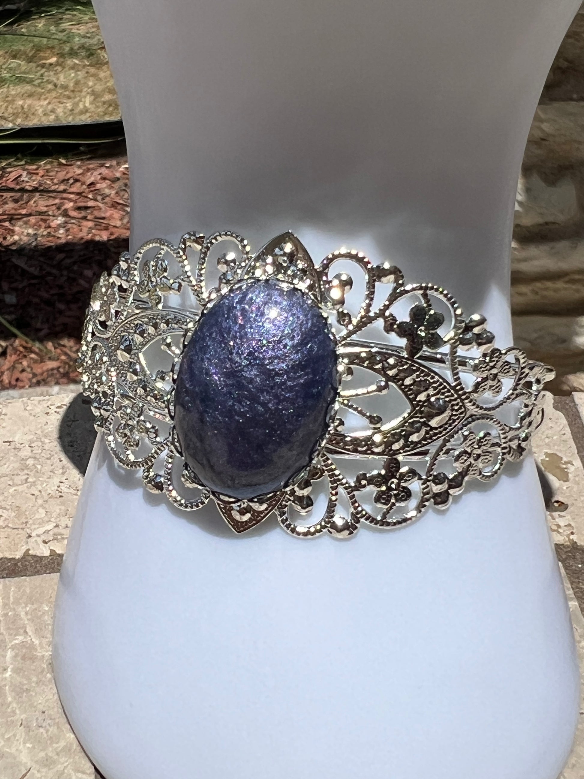 This stunning, one-of-a-kind Bracelet features a gorgeous and stylish silver bracelet with a handmade passion purple pendant. Perfect for any special occasion.