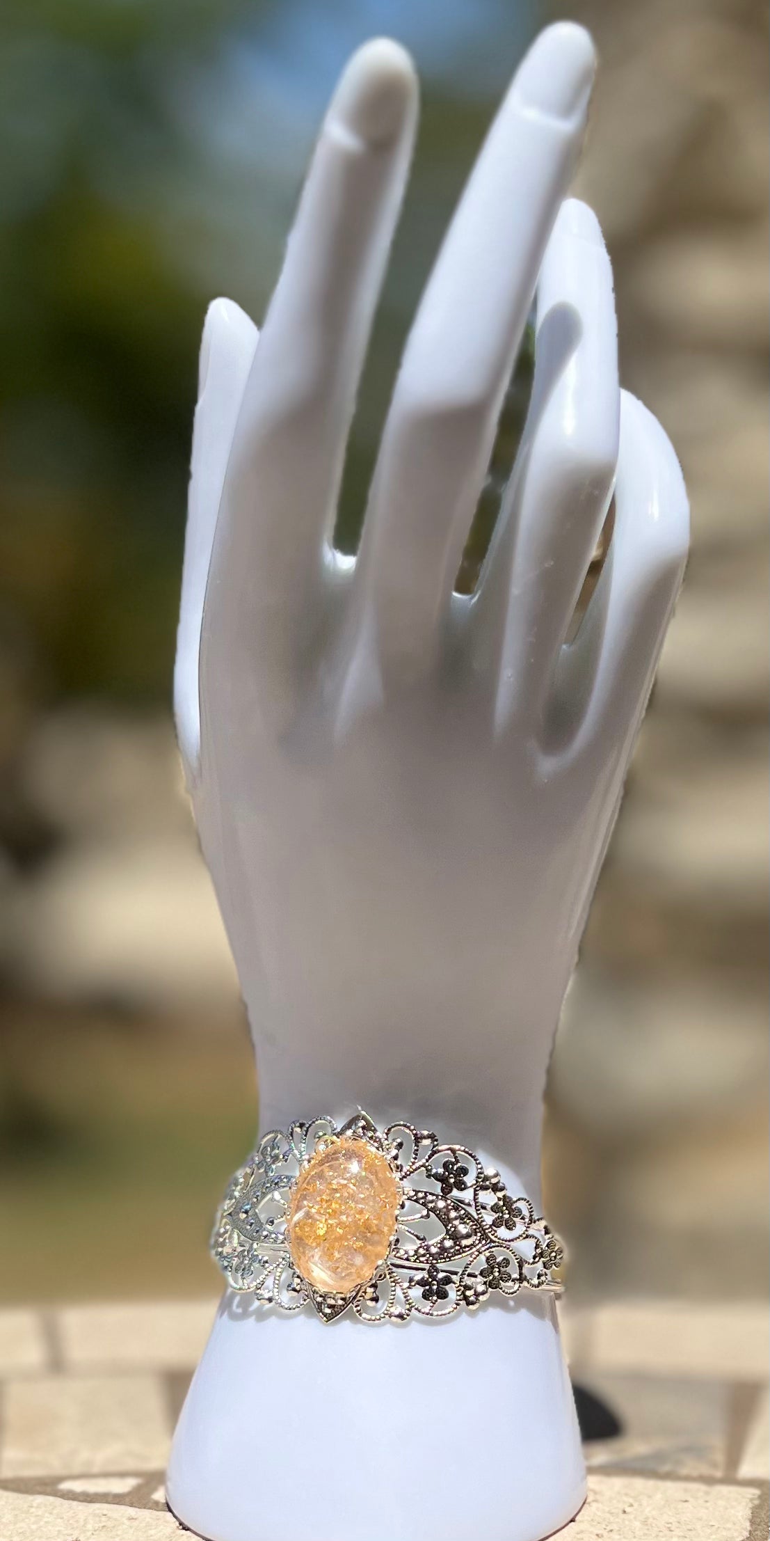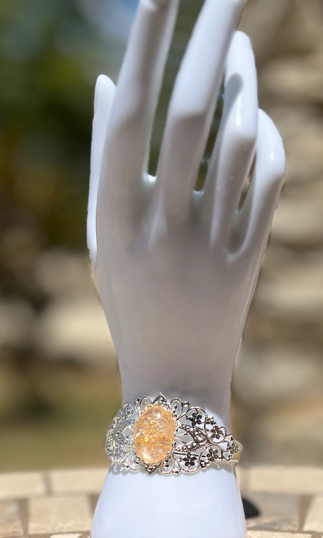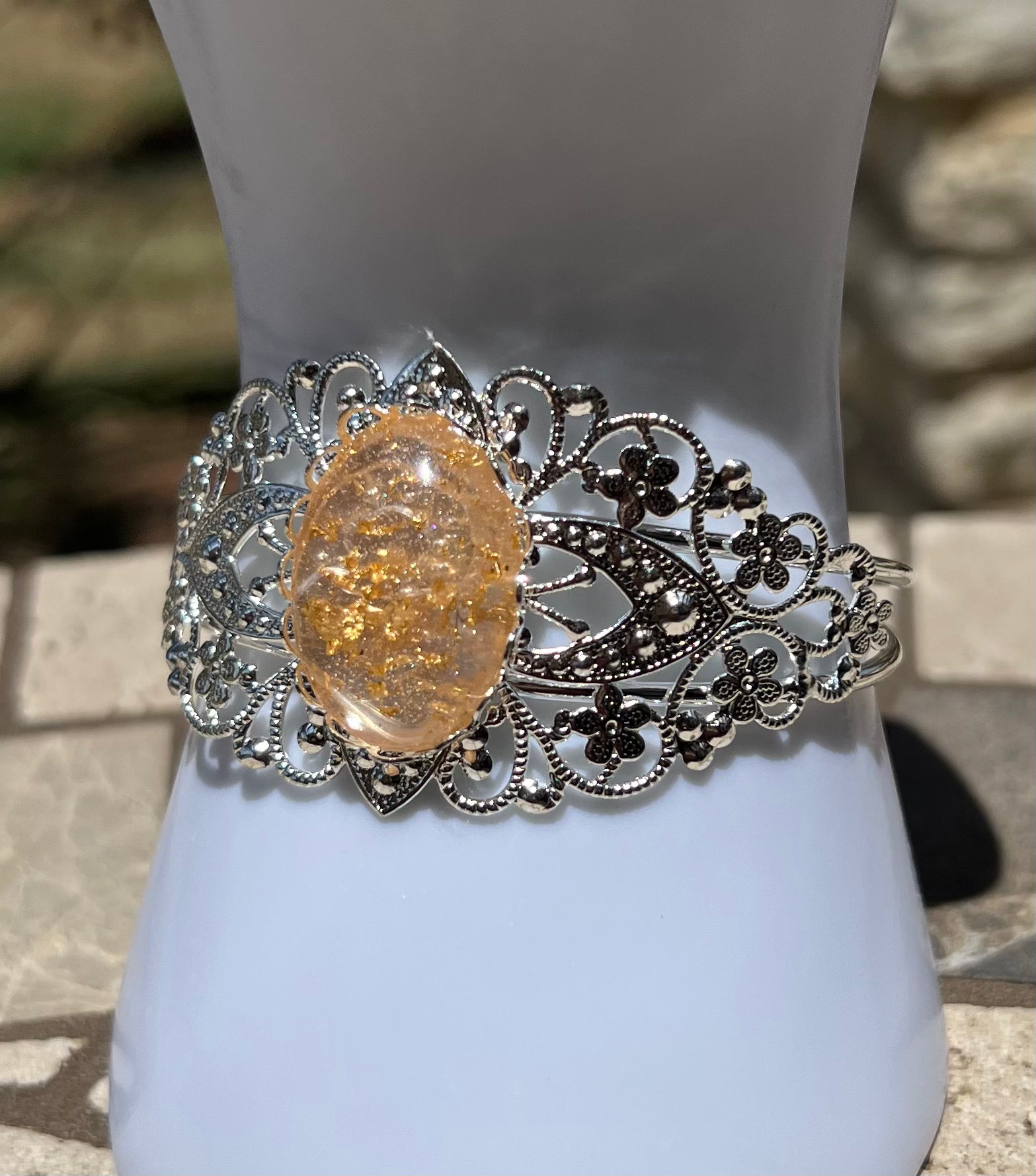 This beautiful silver bracelet is the perfect combination of fine craftsmanship and modern design. Handmade with epoxy, the gem is thoughtfully embedded with classy gold flakes to create a unique statement piece.
