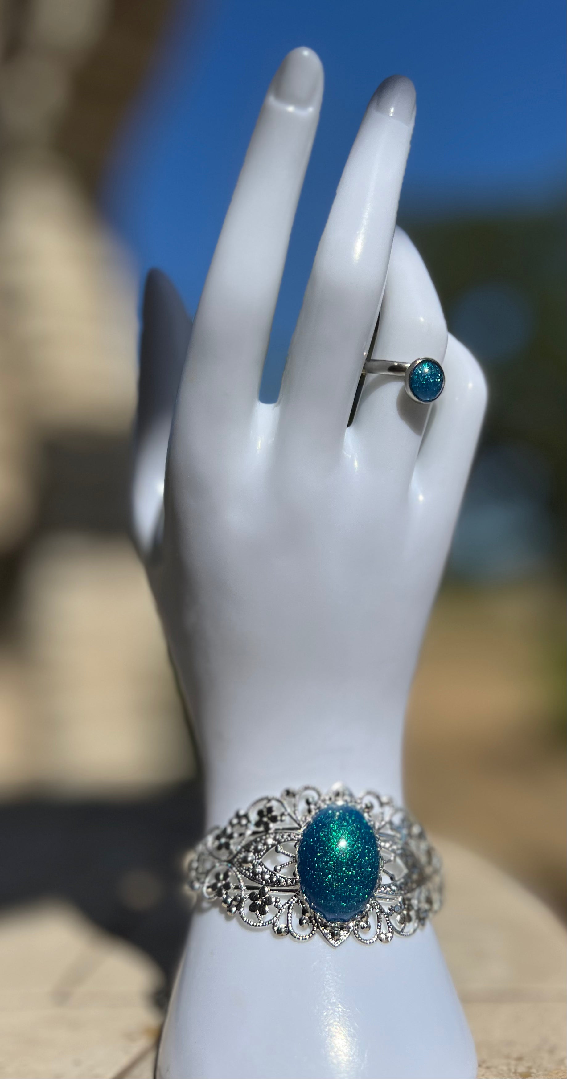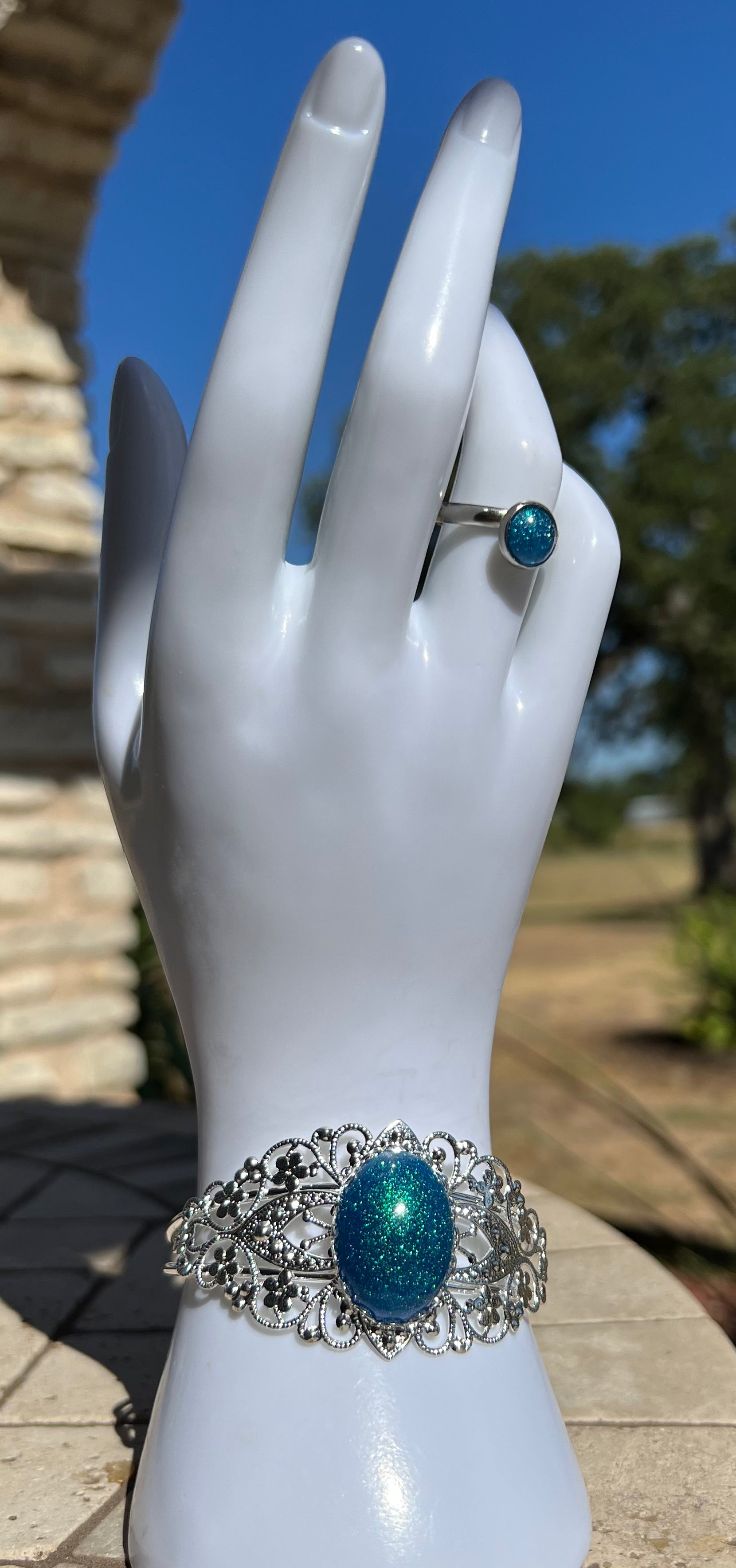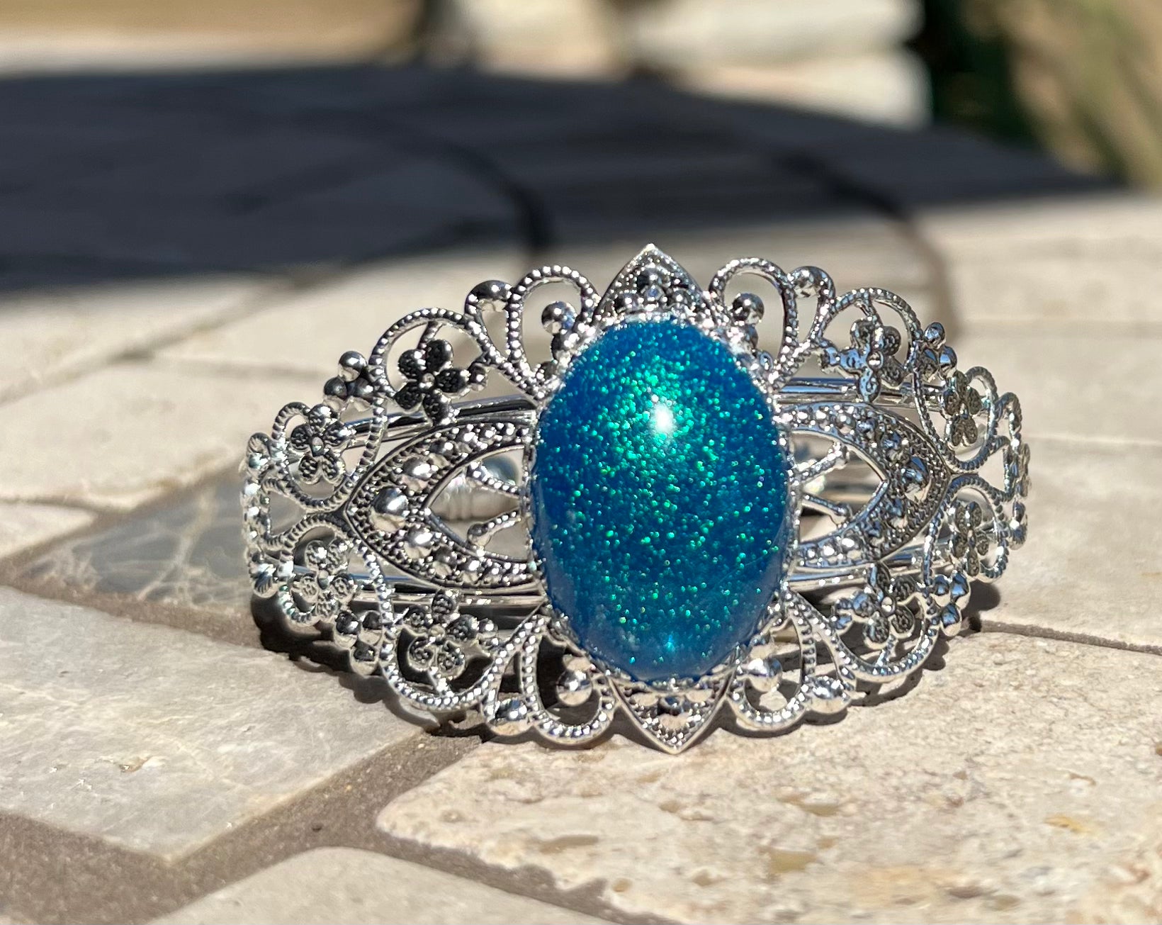 This stunning silver bracelet is handcrafted with a beautiful turquoise blue gem. It's handmade with epoxy for an alluring finish that will be sure to make a statement. Perfect for any outfit, this eye-catching bracelet is sure to add a timeless sophistication to your style.