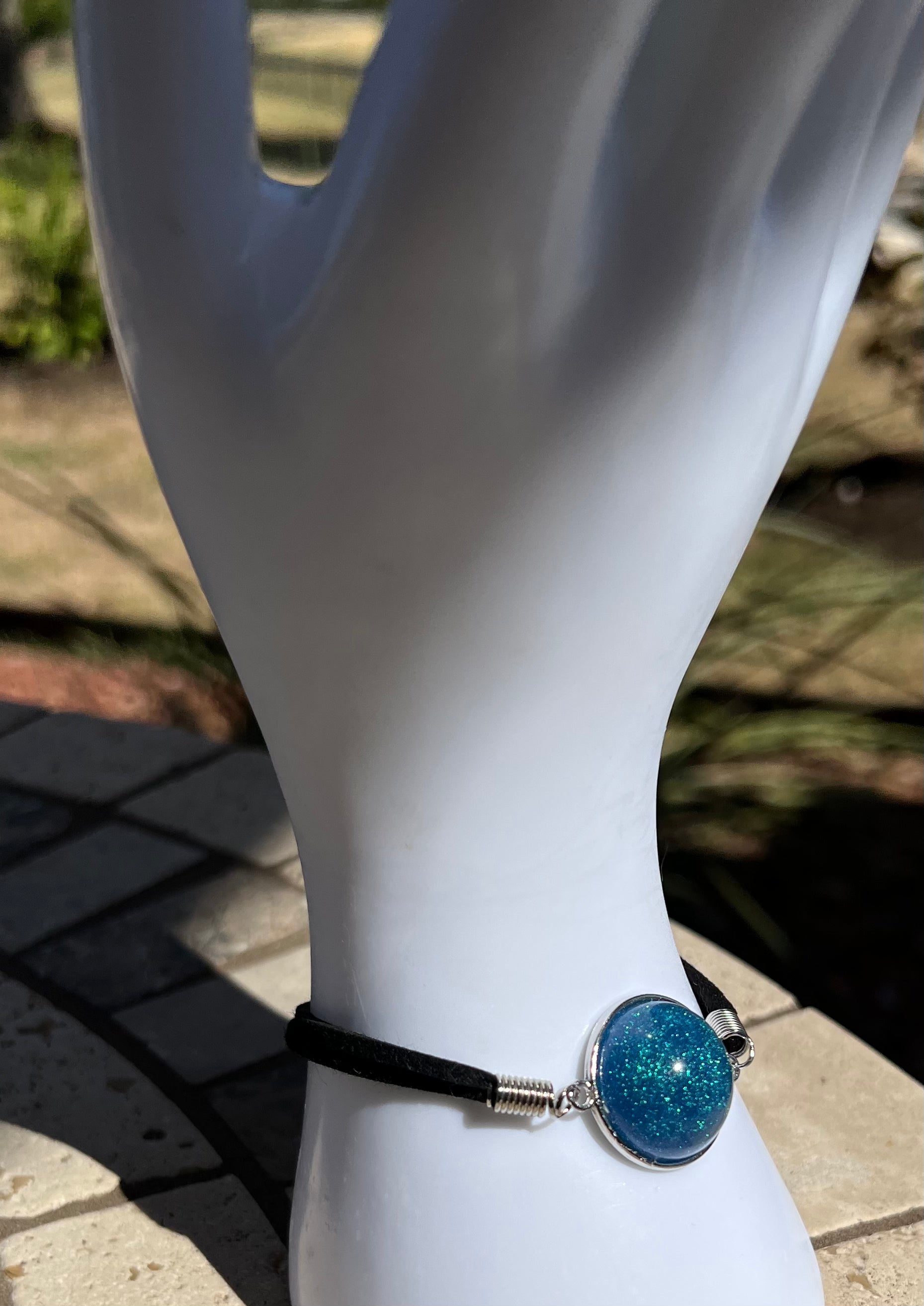 This beautiful turquoise blue gem bracelet is handmade with epoxy to create a dainty and elegant look. The perfect accessory for any occasion, its craftsmanship ensures a unique addition for any collection.