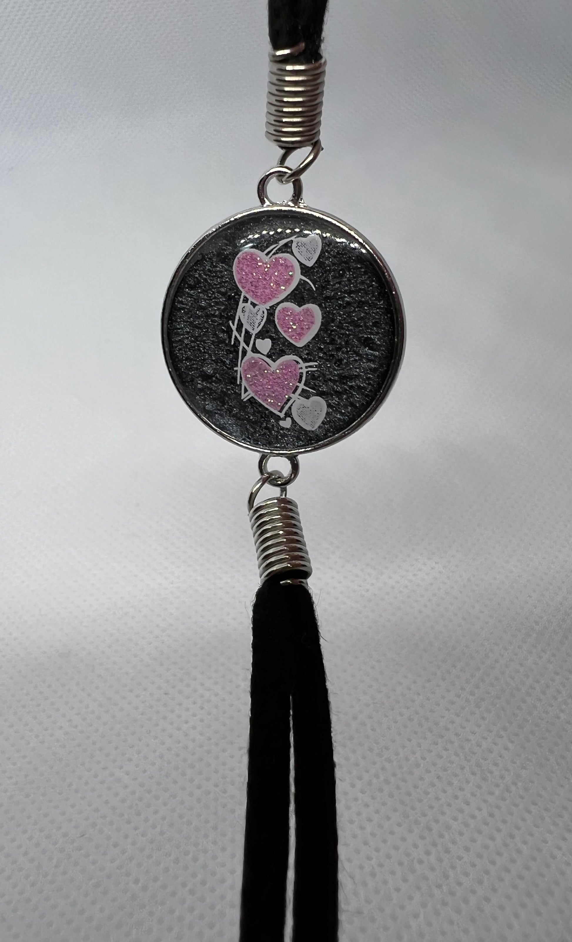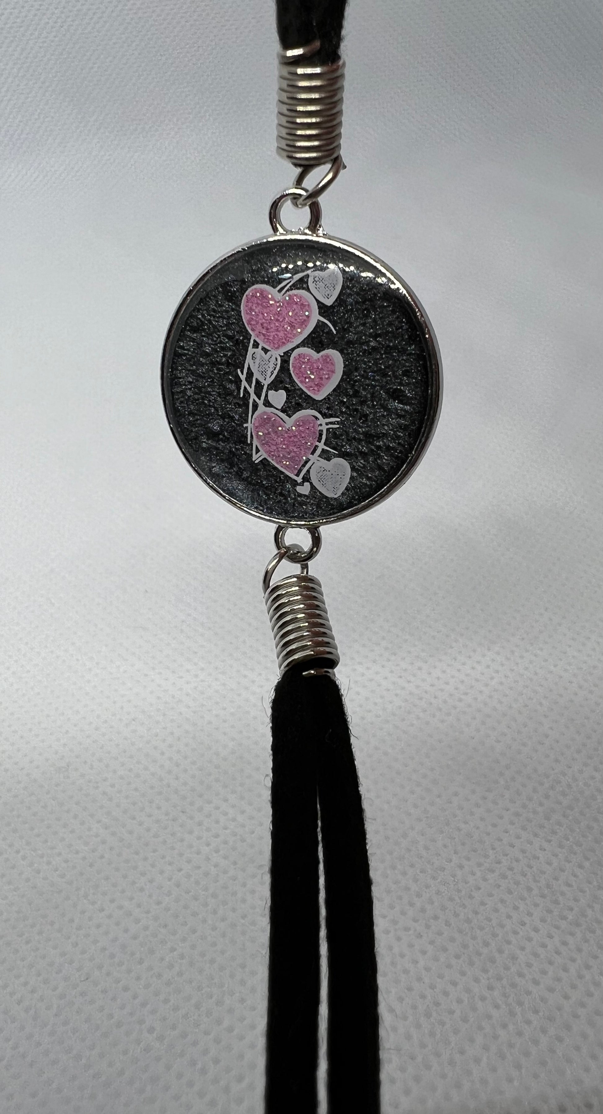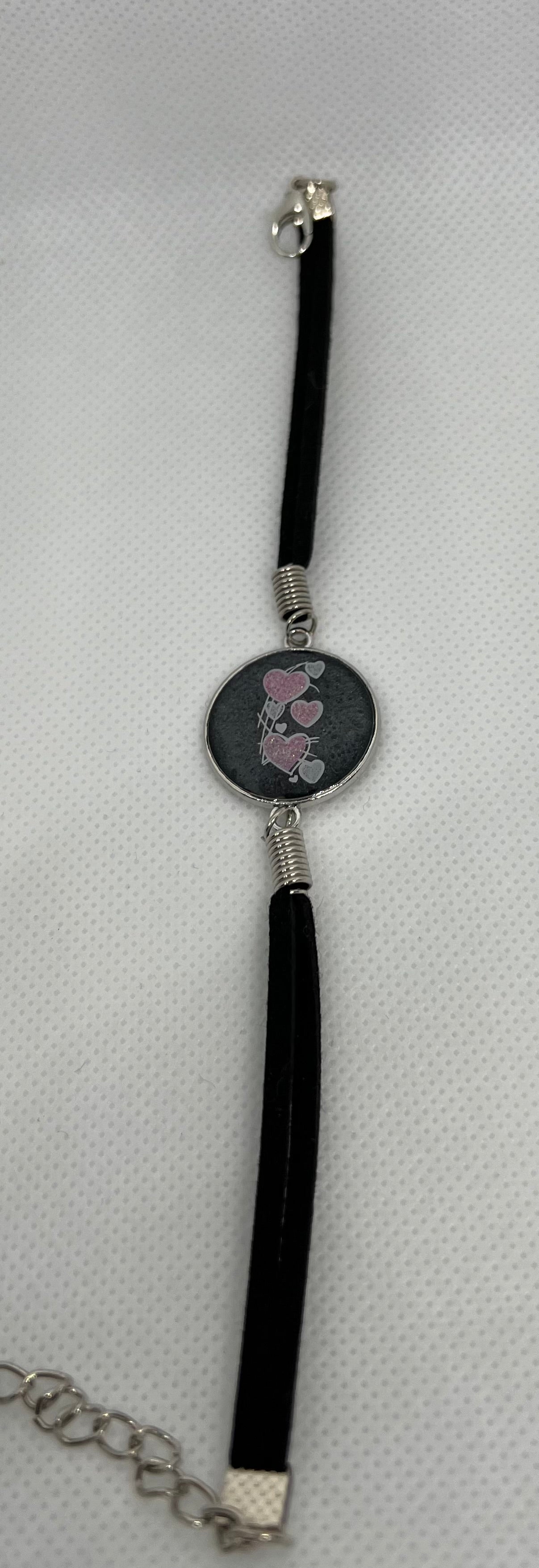 Handmade with epoxy resin, this bracelet boasts a beautiful design of hearts on a soft black background. As a conversation starter, this versatile accessory can effortlessly match any outfit. Its unique material and design make for a standout piece, perfect for any fashion-forward individual.