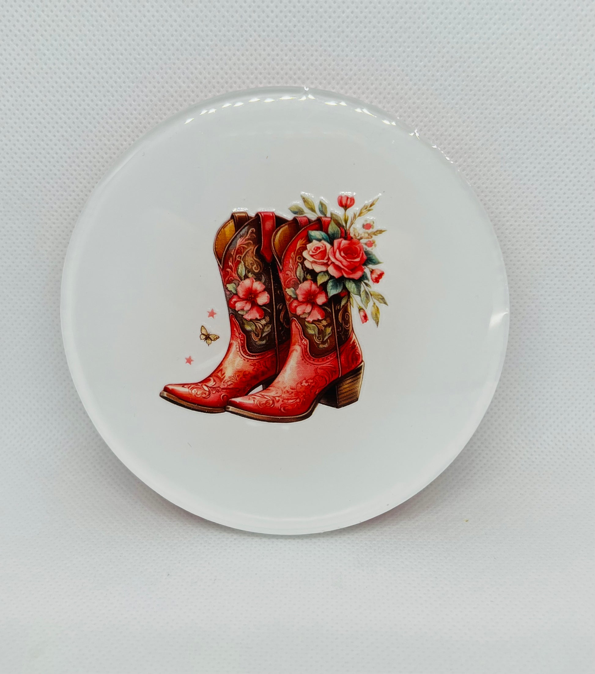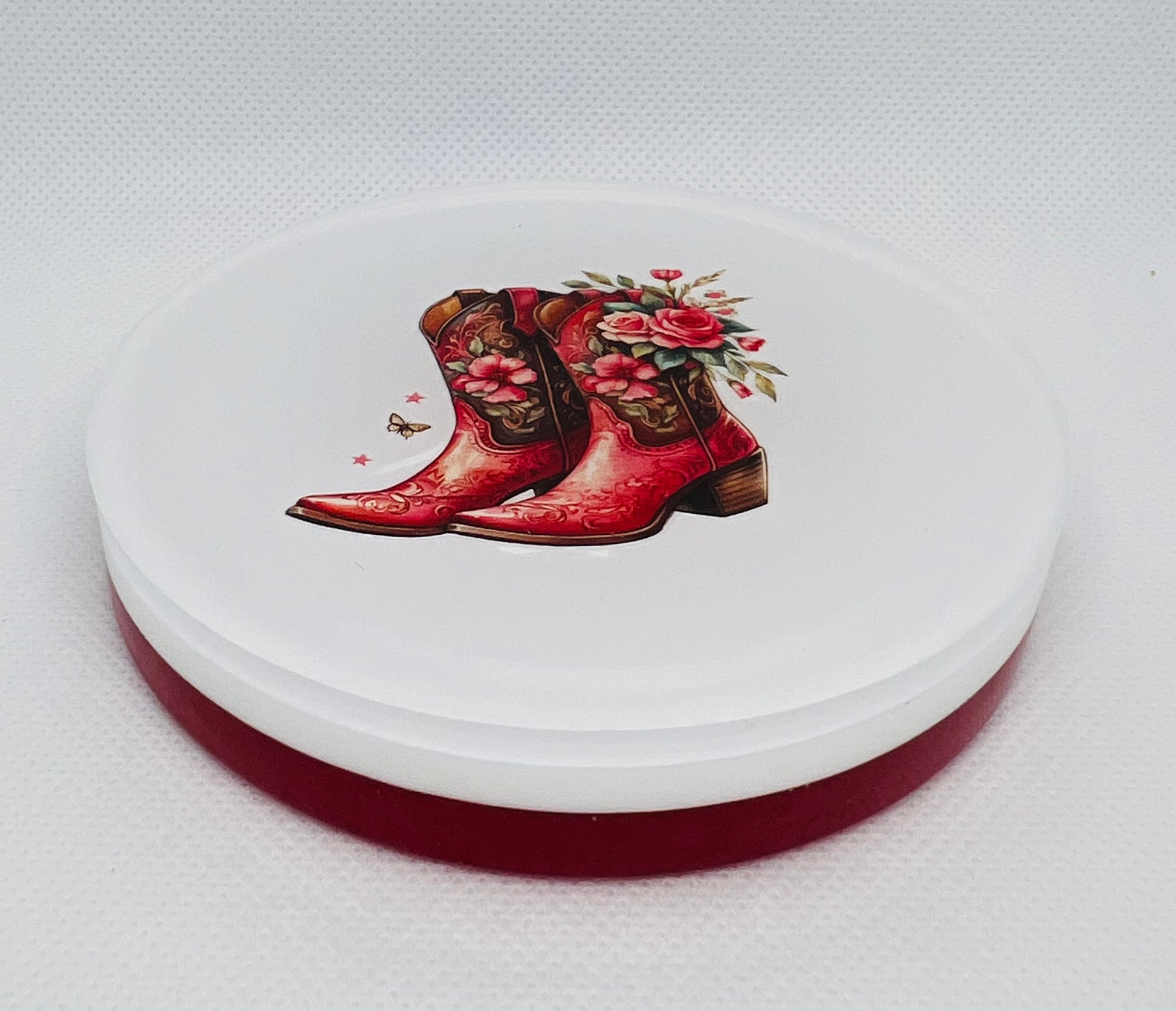 This unique coaster showcases a stunning image of female cowboy boots adorned with vibrant red roses. Made from durable and stylish epoxy resin, it's the perfect addition to any home. A great gift for any Texan or cowboy enthusiast.