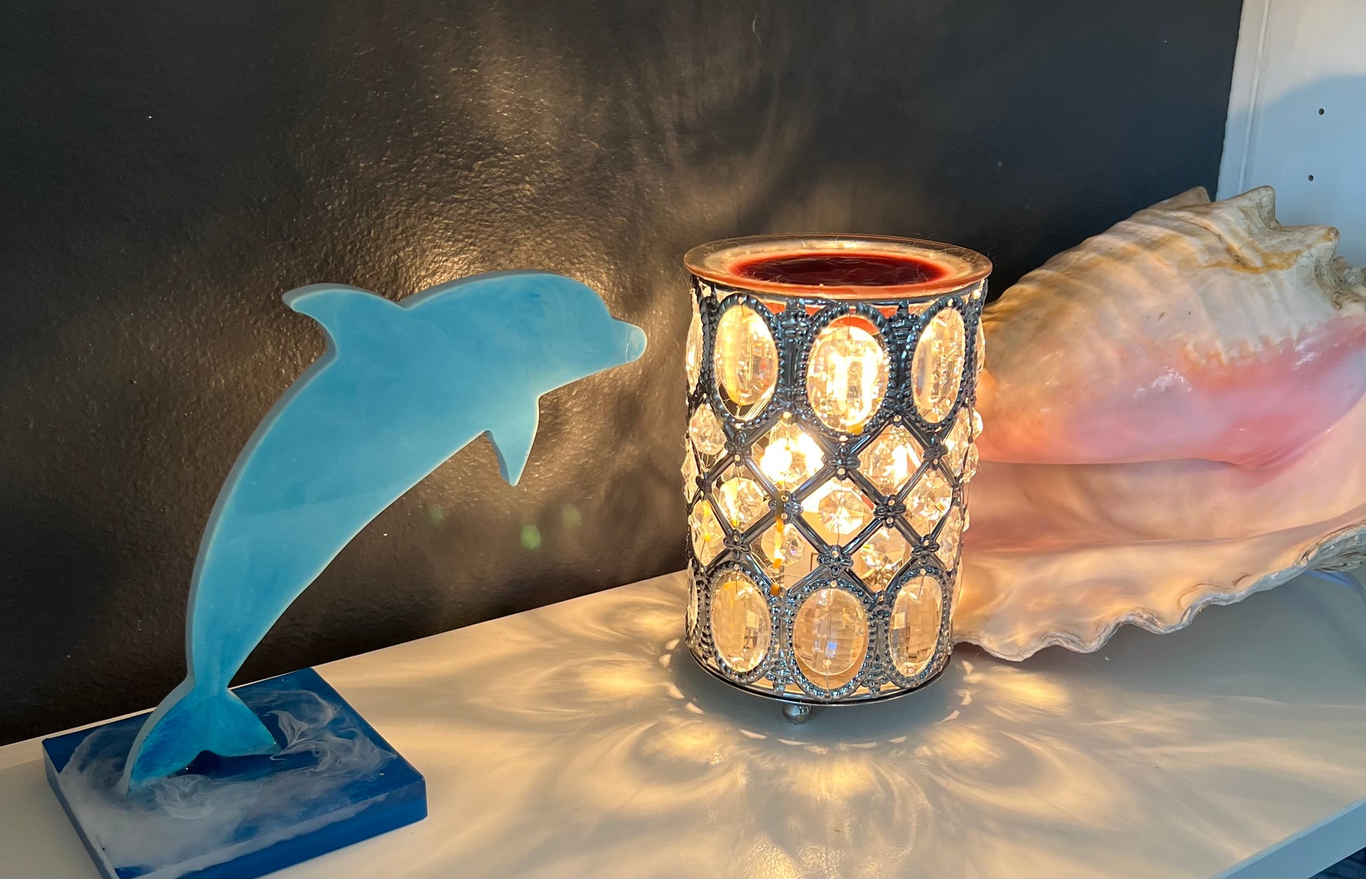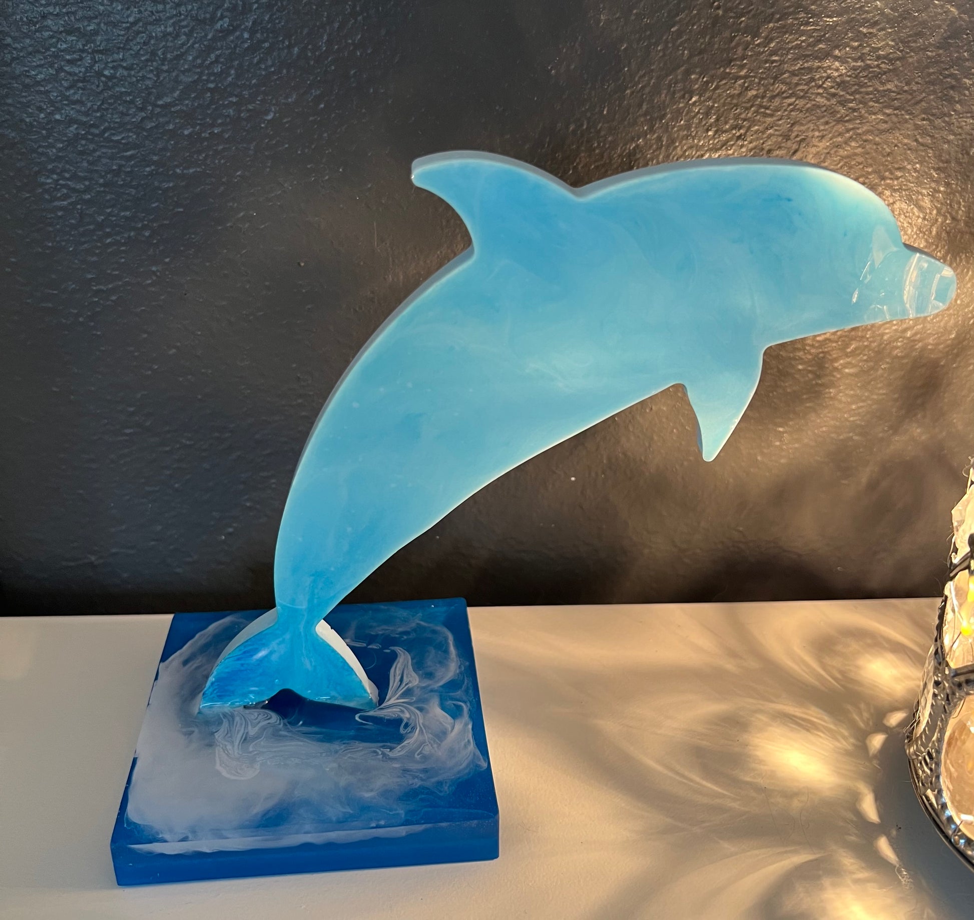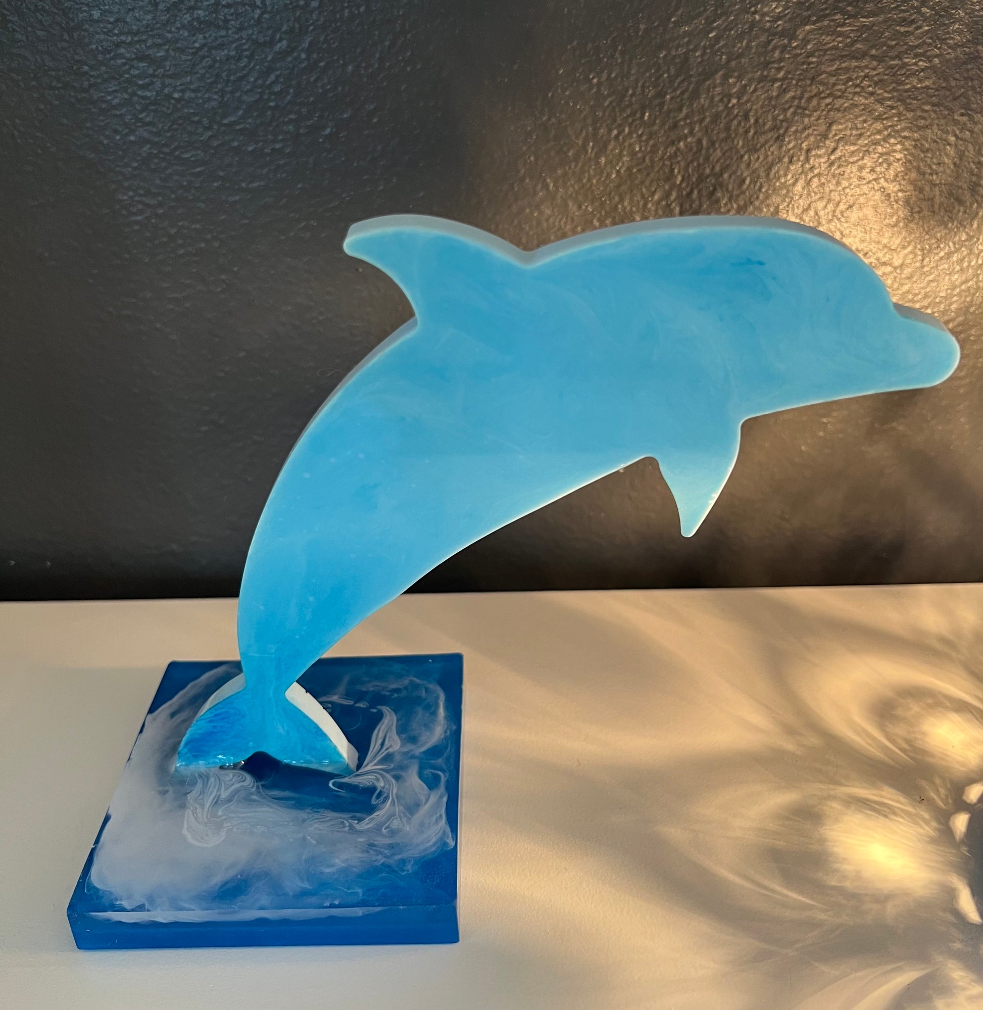 This unique and one-of-a-kind home decor piece is expertly handcrafted with epoxy resin to bring a delightful sea atmosphere to your home. It features a light blue dolphin on a dark blue stand, resembling the colors of the ocean. Its design is sure to bring a sense of beauty and whimsy to any space.