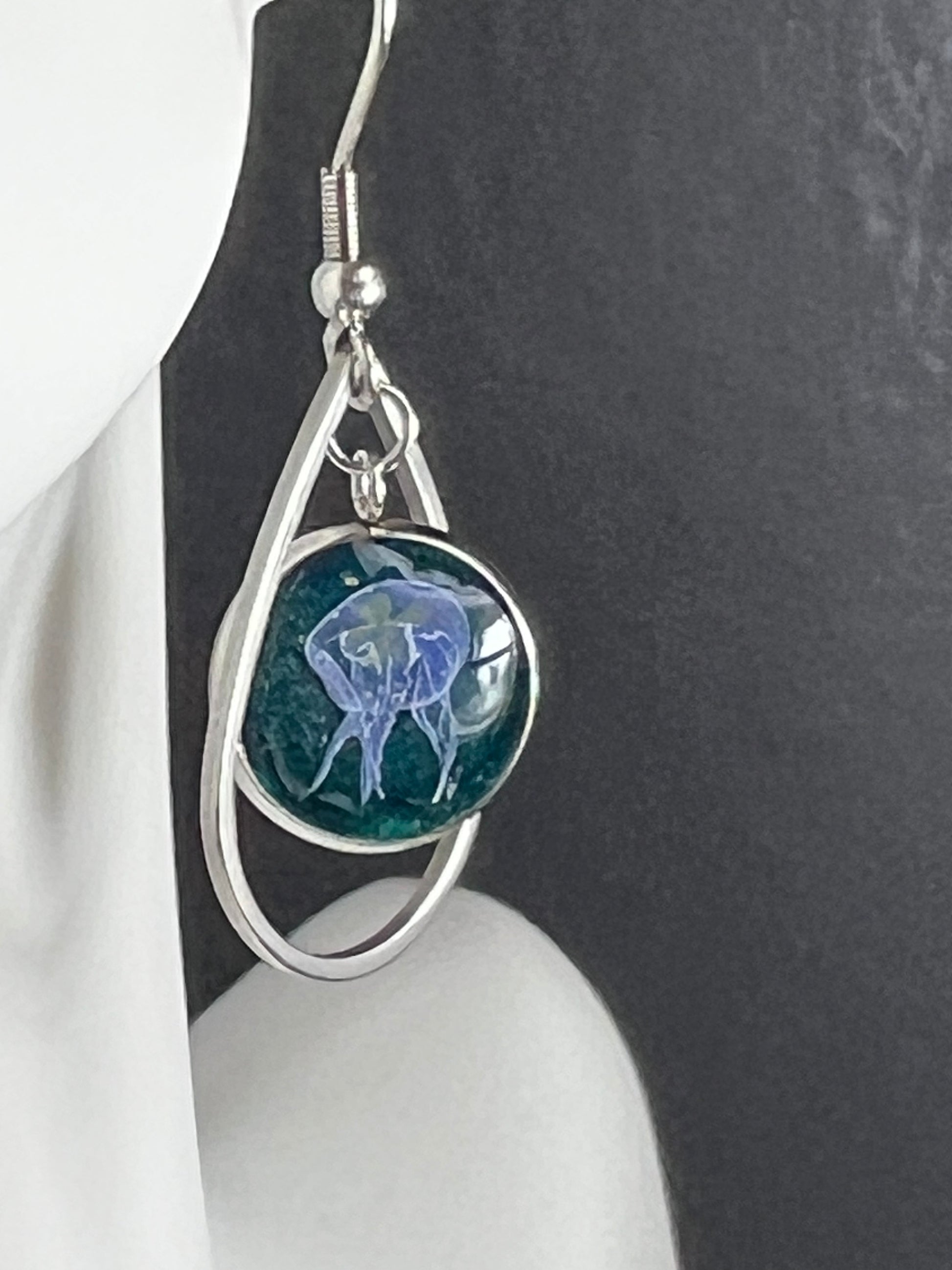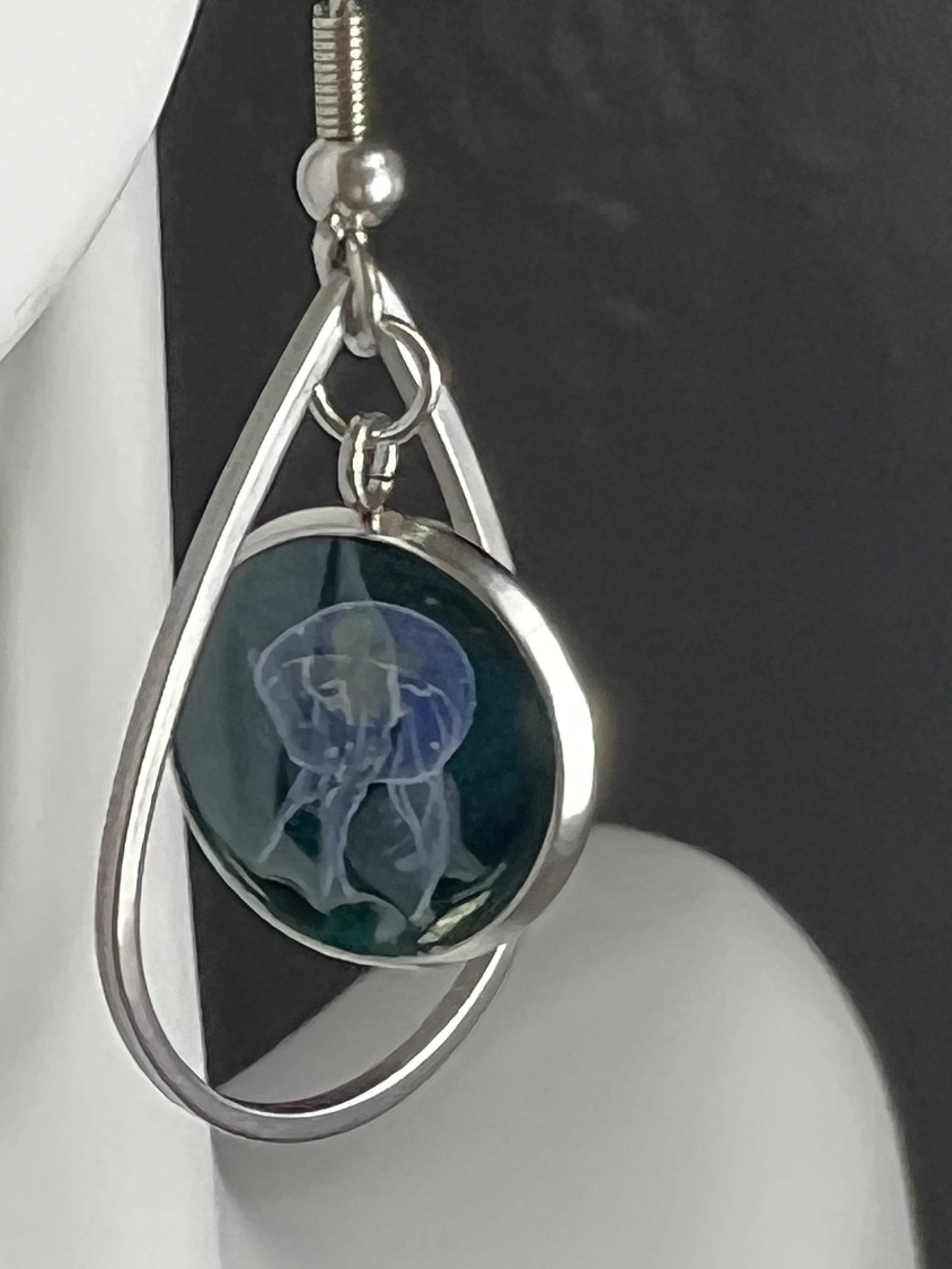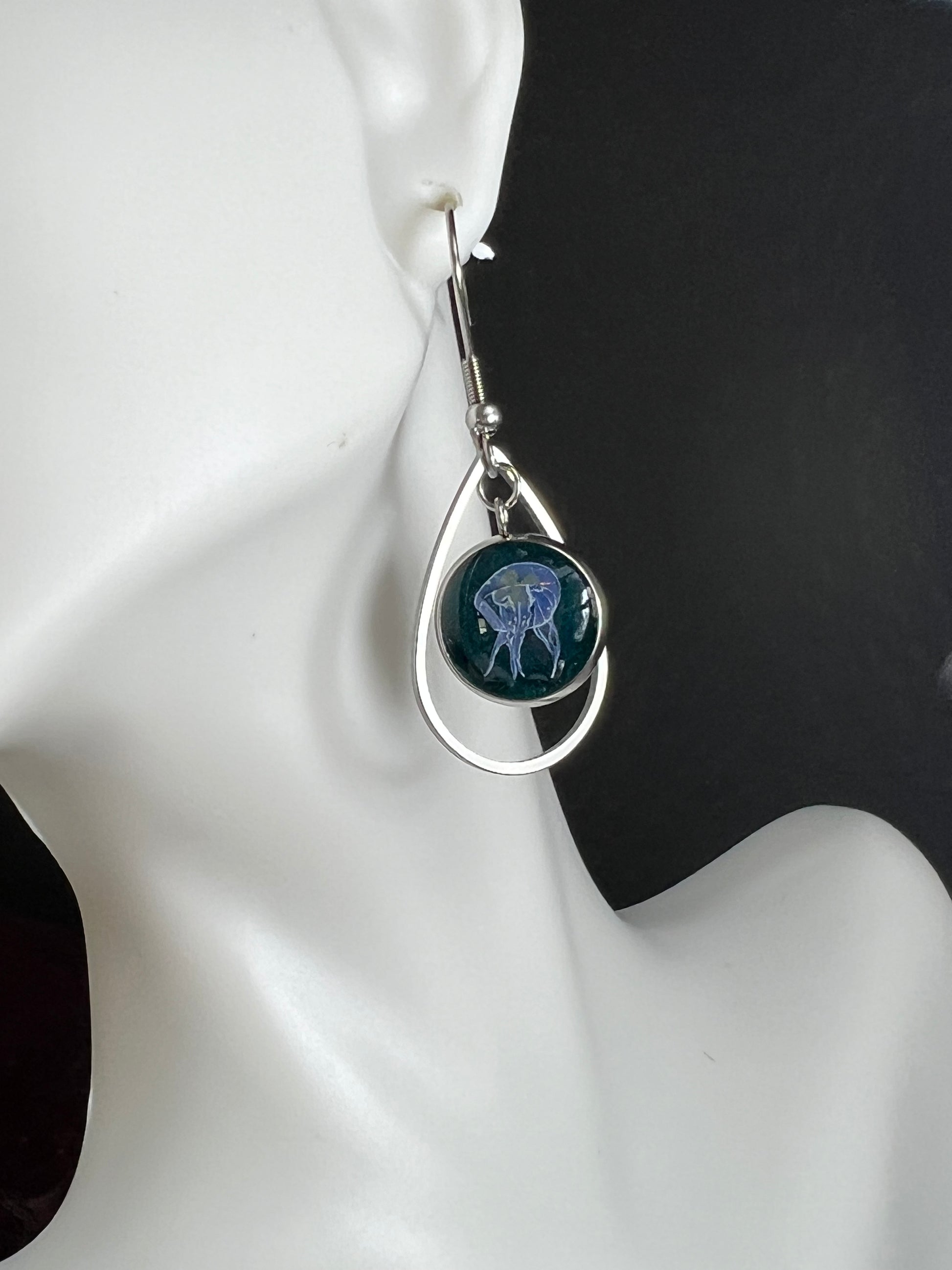 These beautiful handmade silver earrings feature a stunning jellyfish inlaid against a deep emerald green background. The epoxy used to craft the earrings is of the highest quality, ensuring durability and a perfect finish.