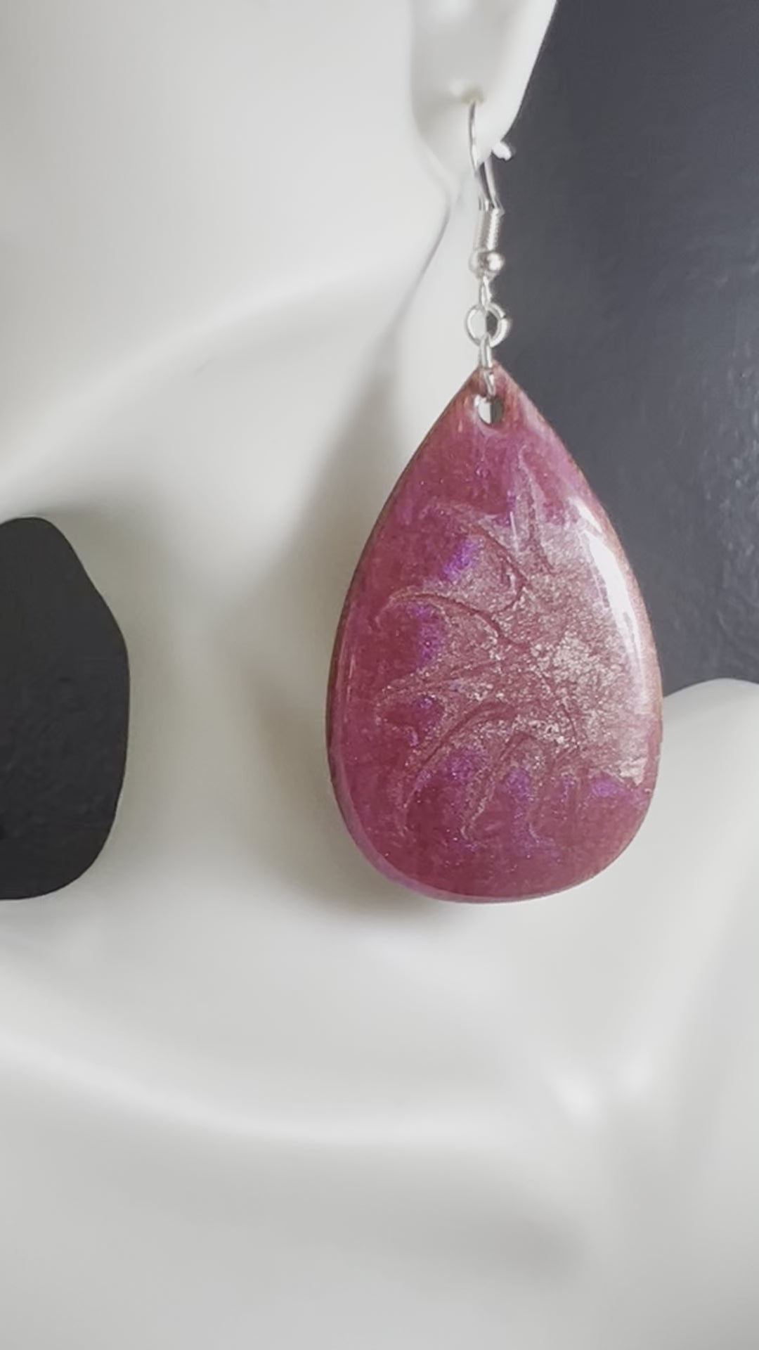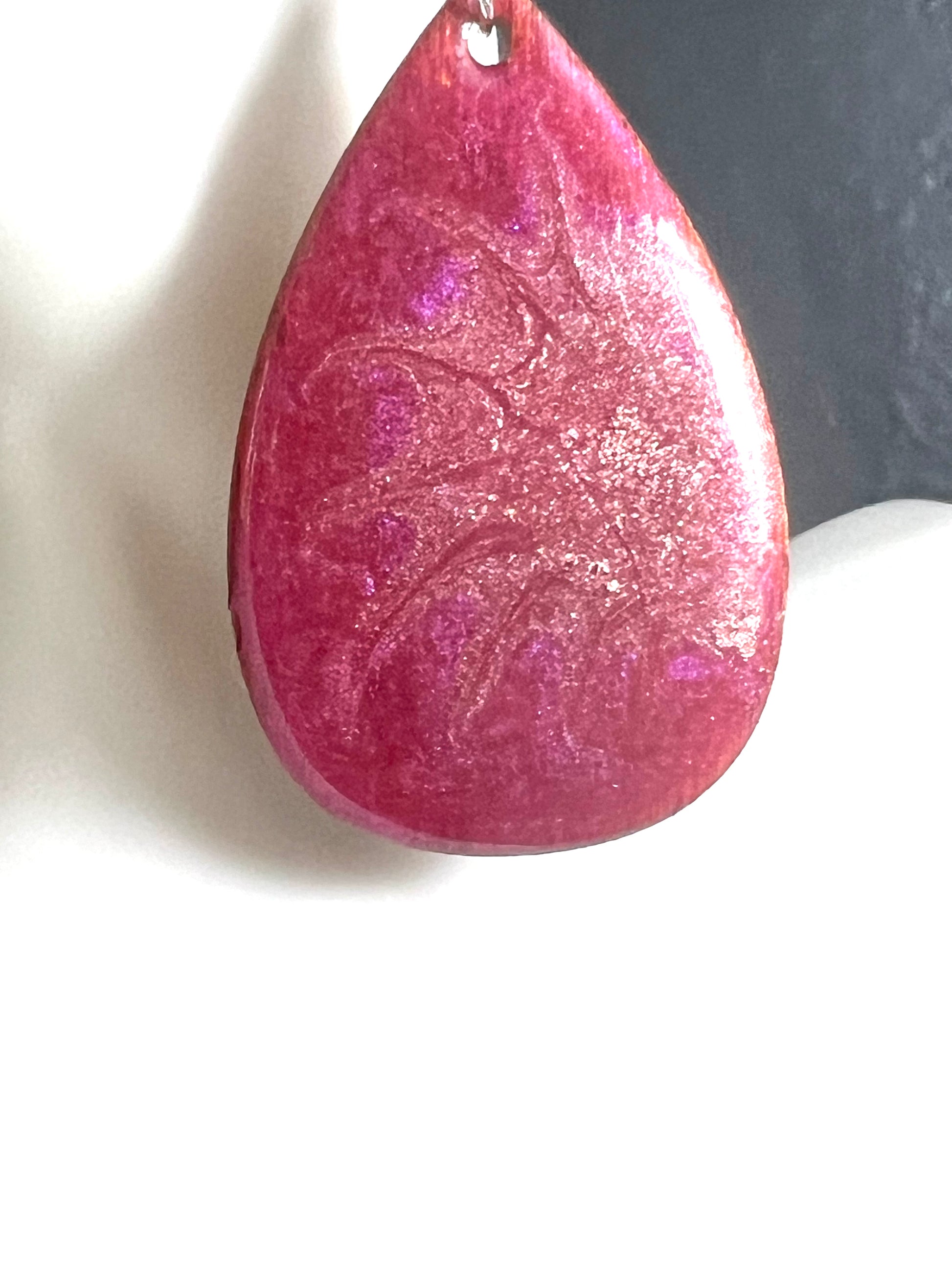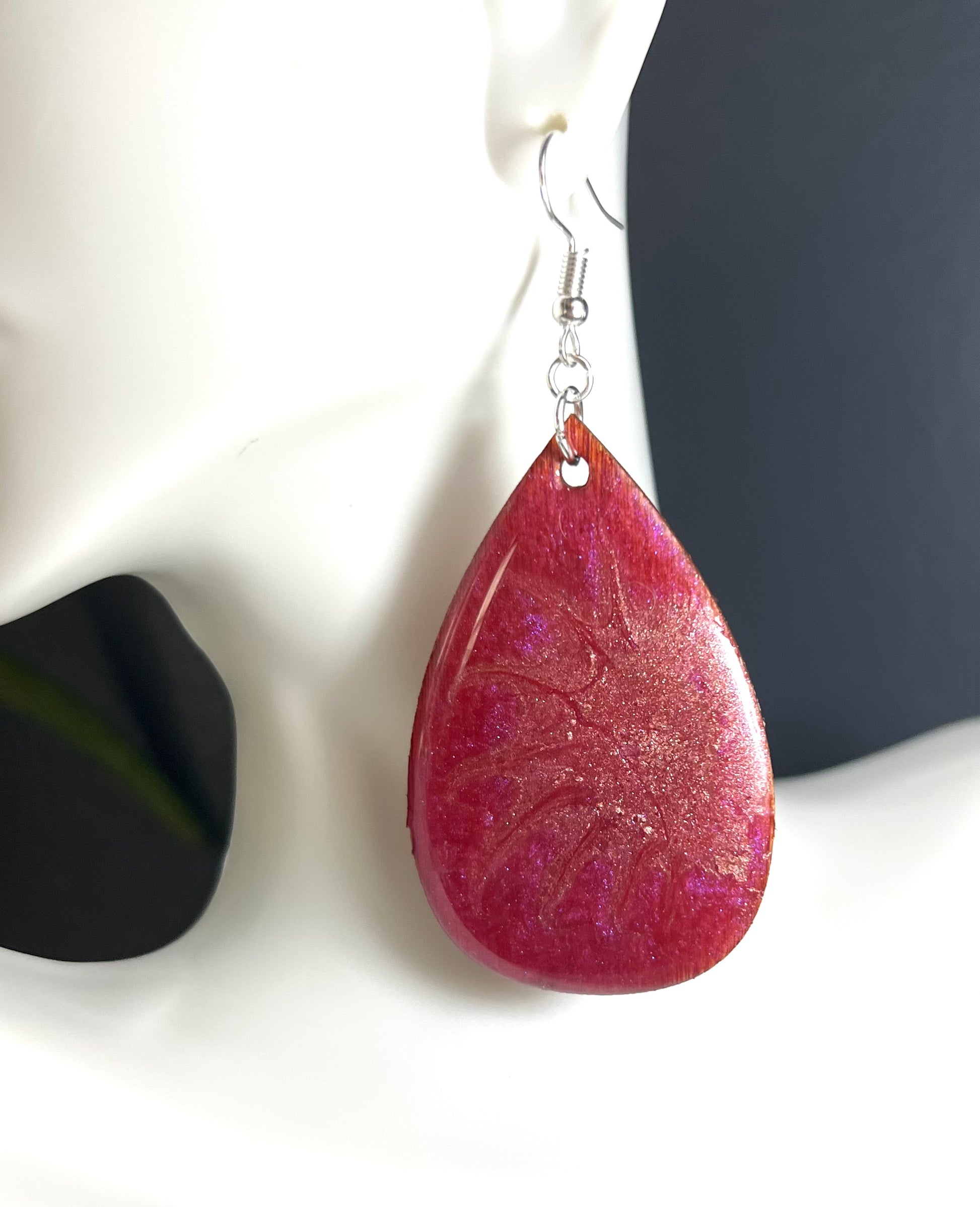 These luxurious earrings are crafted using a mix of red and purple with gold swirls, creating an eye-catching combination. Their wooden construction keeps them lightweight yet durable, making them a great choice for everyday wear. The backing is coated with shimmering gold to make sure that every angle is glistening in the light.