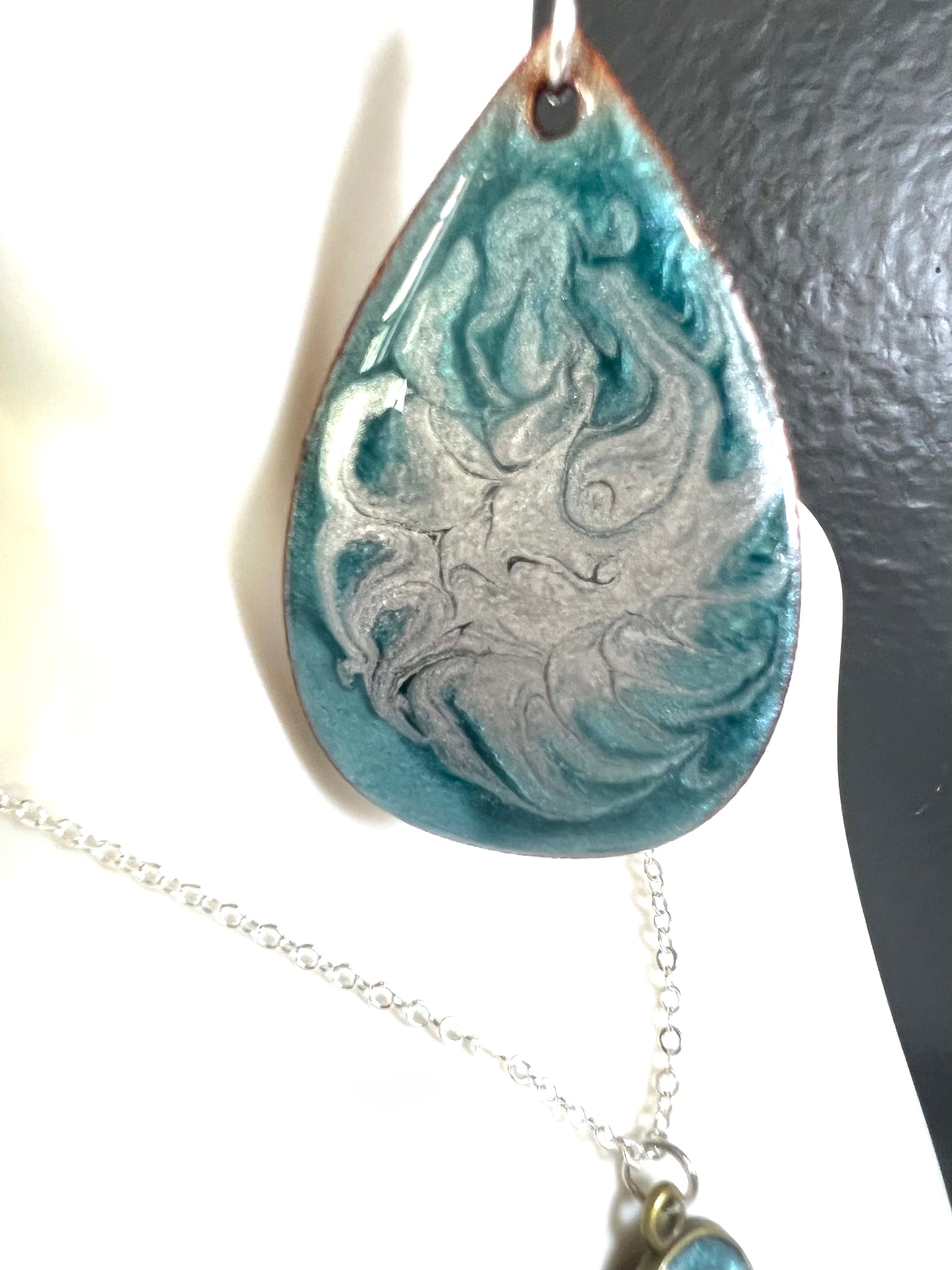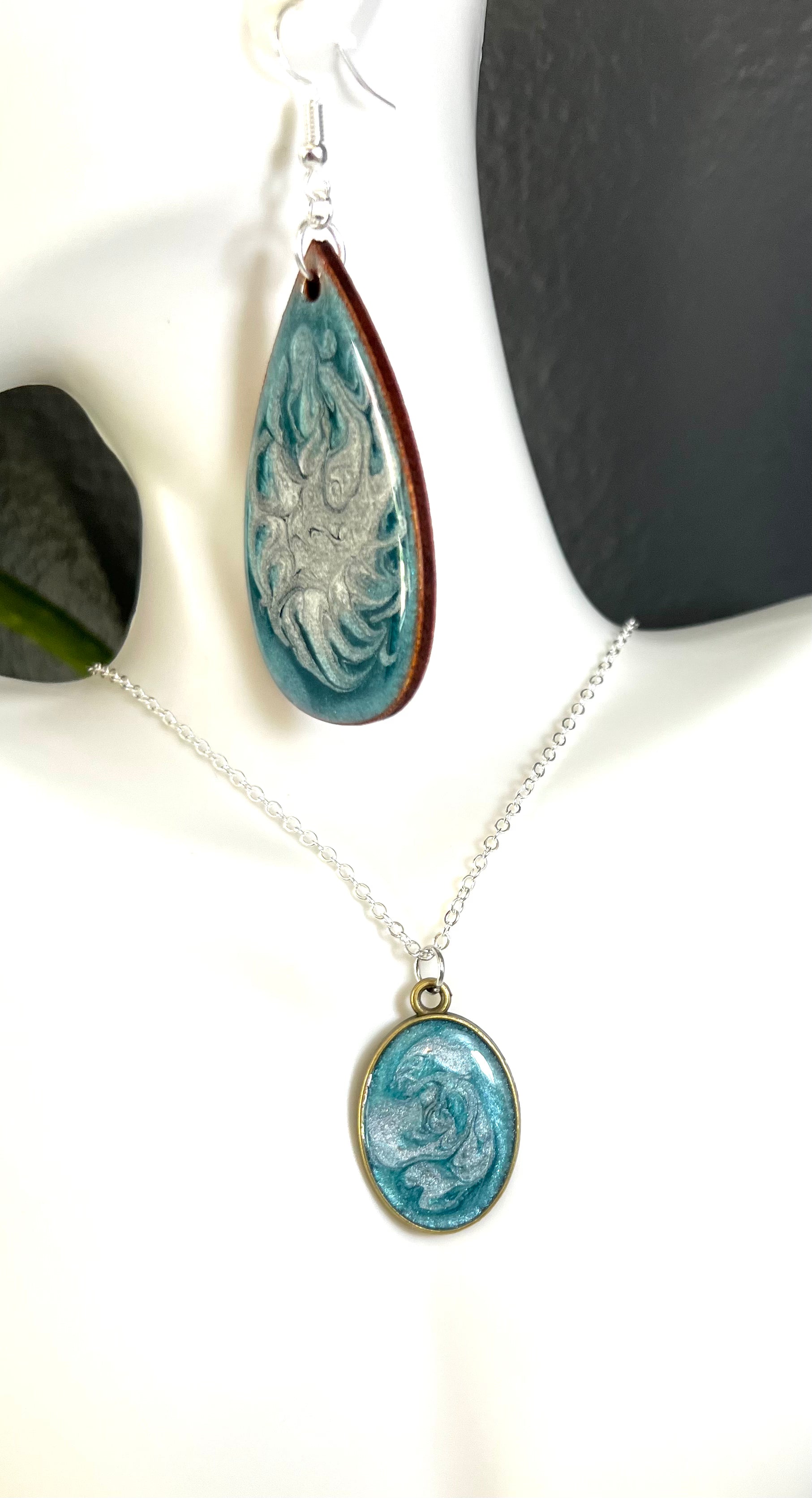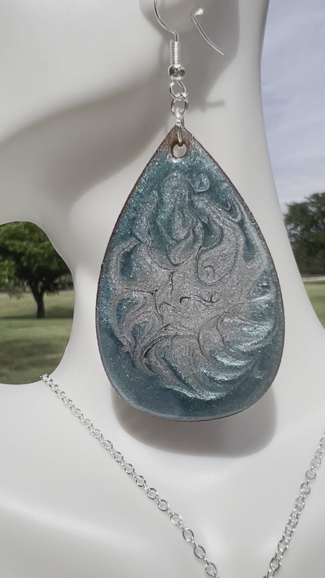 Bring the ocean to your wardrobe with these beautiful wood earrings. Coated in a vivid ocean blue-green, they have a delicate silver lace design to add subtle elegance. Lightweight and comfortable to wear, these wood tear drop earrings are perfect for adding a unique touch to any look.