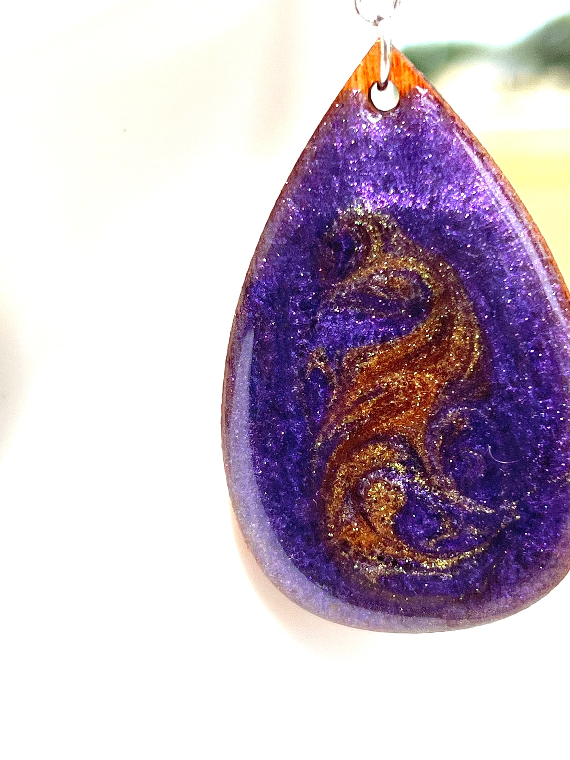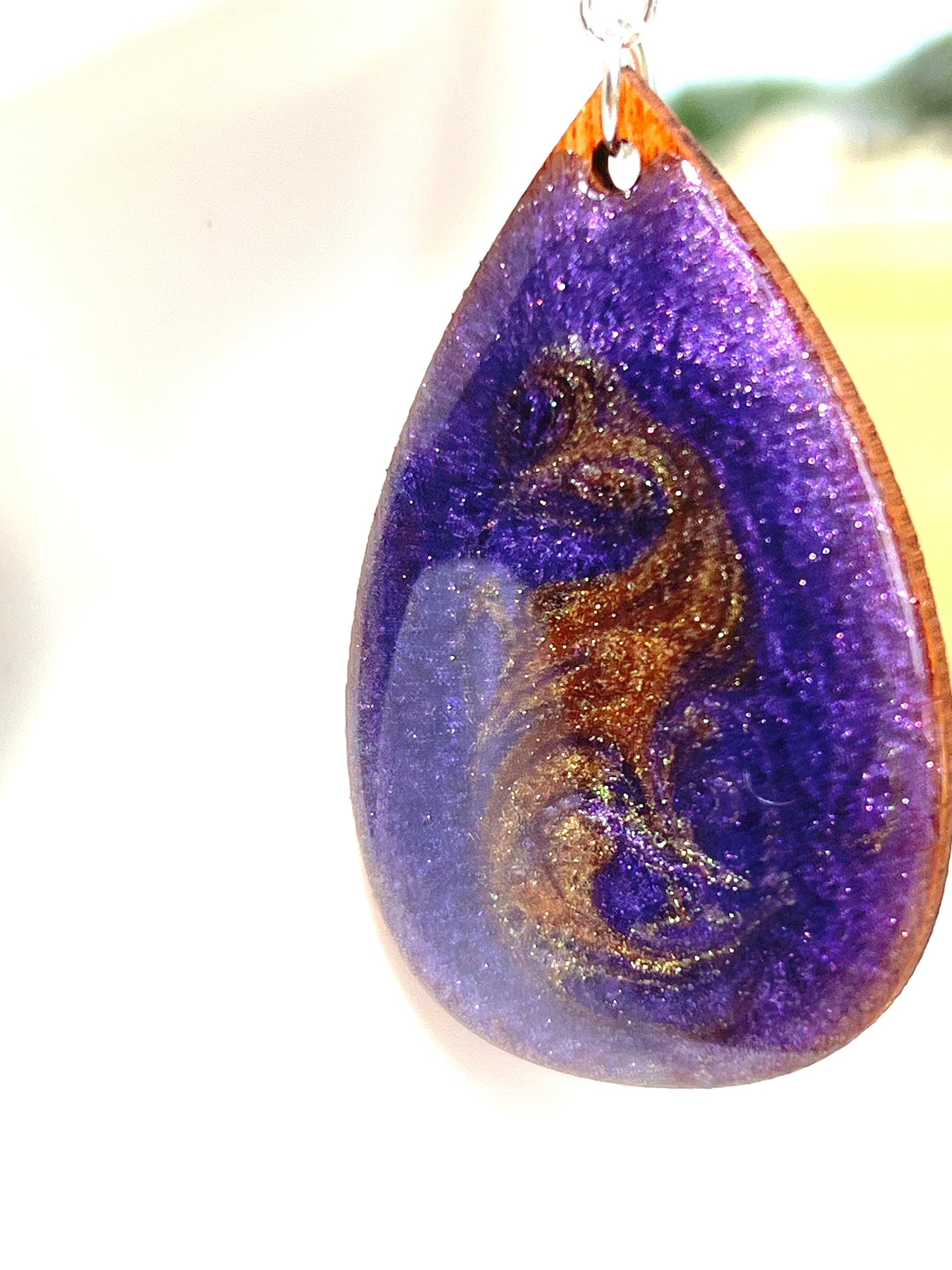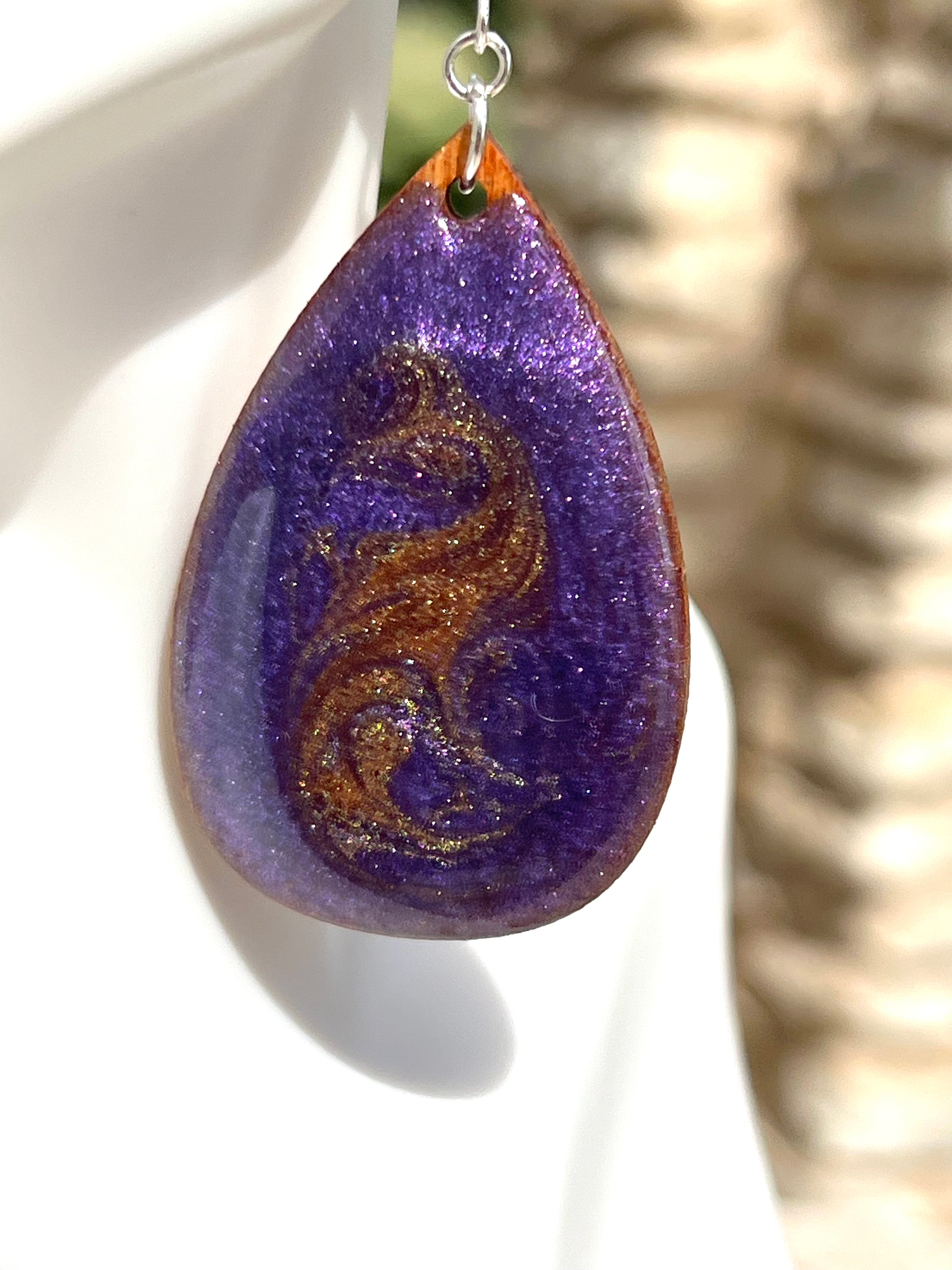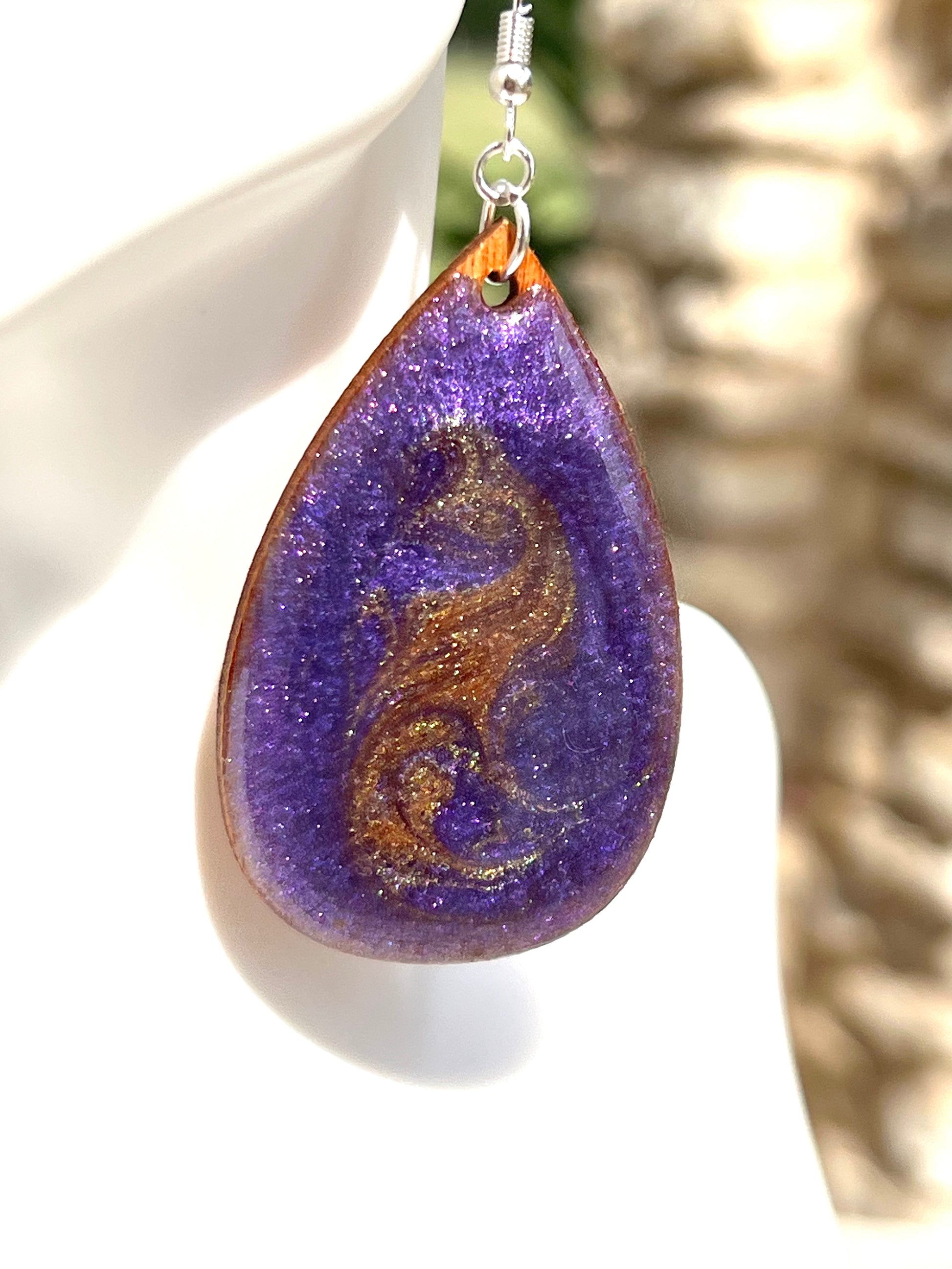 These beautiful earrings will brighten up your wardrobe. Crafted from wood, the teardrop design is stained and coated in a stunning purple with a glistening gold lace design. The backing is a glistening gold to make sure there is beauty from every angle. Add an elegant touch to your look with these unique earrings.