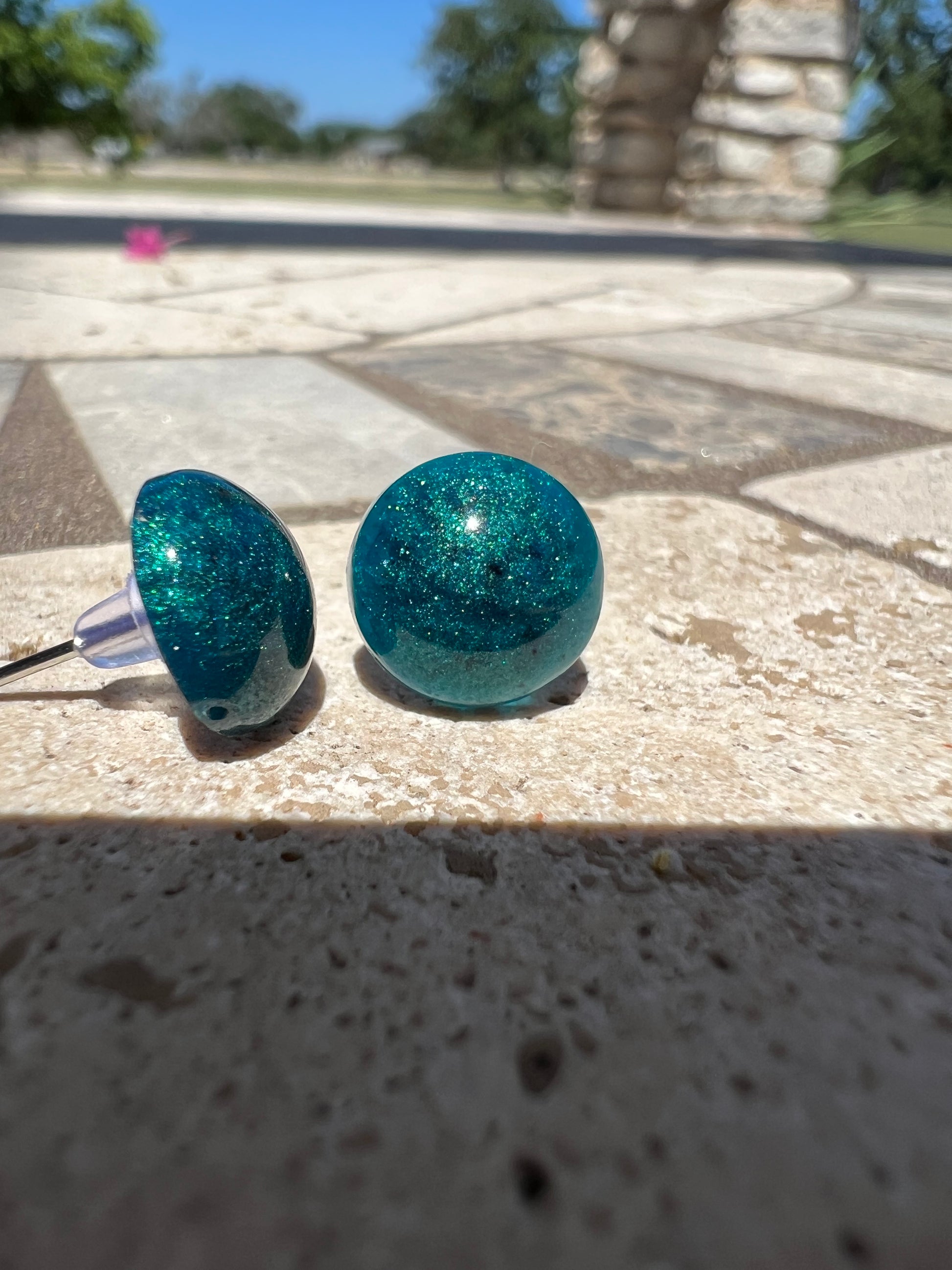These handmade, round earrings are sure to impress with their gorgeous deep emerald green color. Each earring is molded from epoxy for a durable and beautiful finish.
