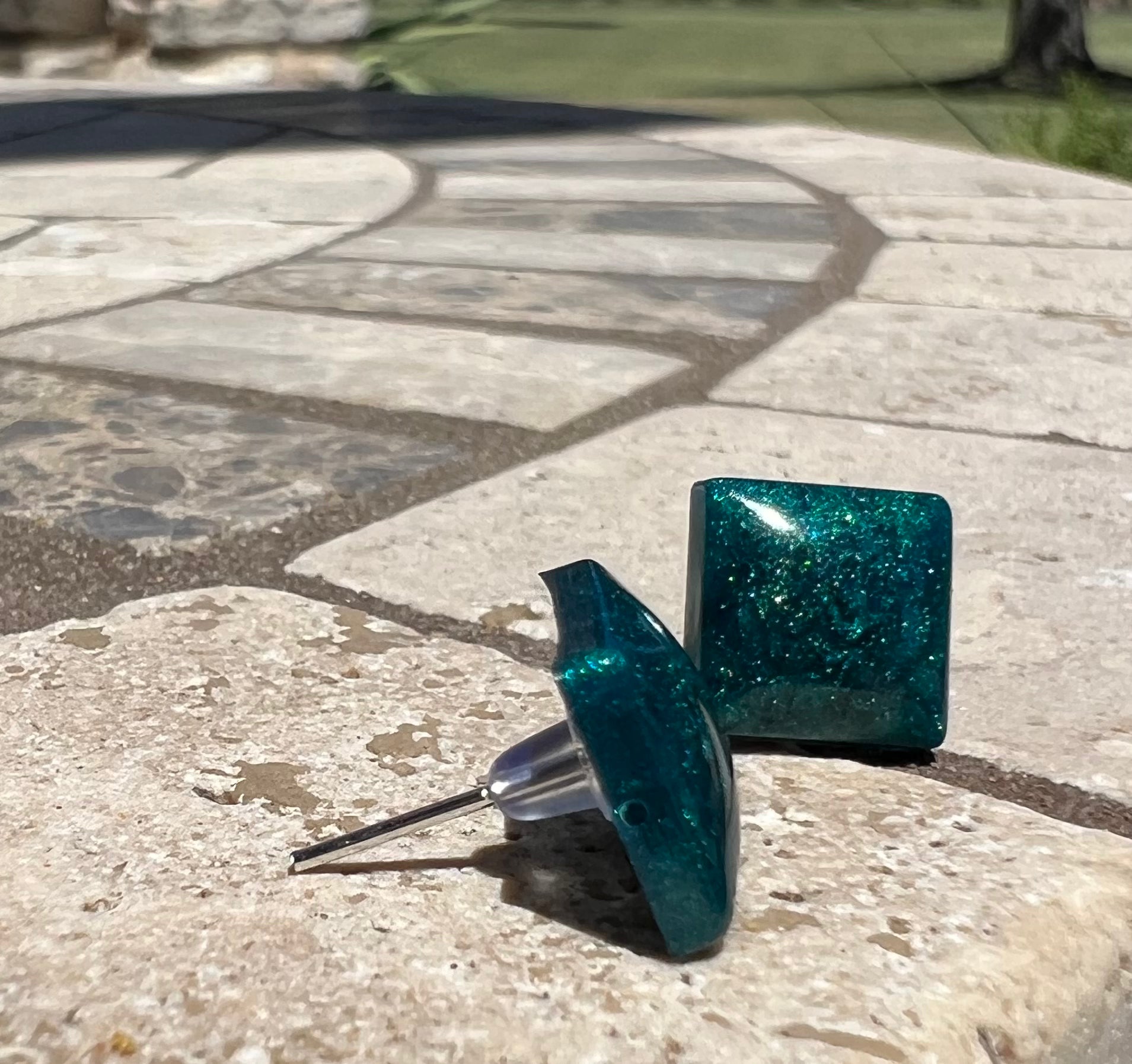 These beautiful handmade earrings are perfect for any special occasion. Crafted from epoxy, they feature a deep emerald green for a stunning effect. The small square shape catches the light in a unique way. Make your outfit shine with these one-of-a-kind earrings.