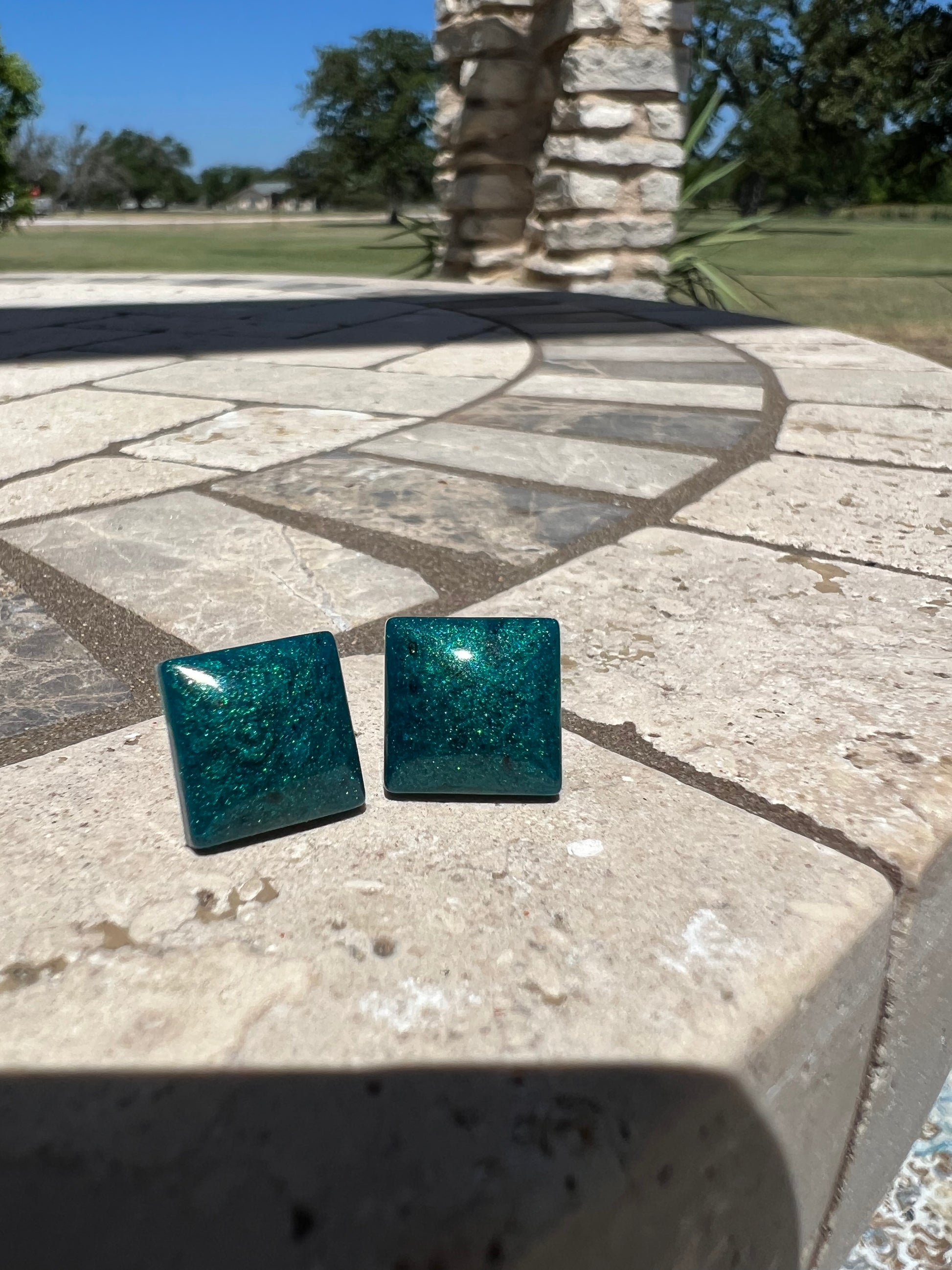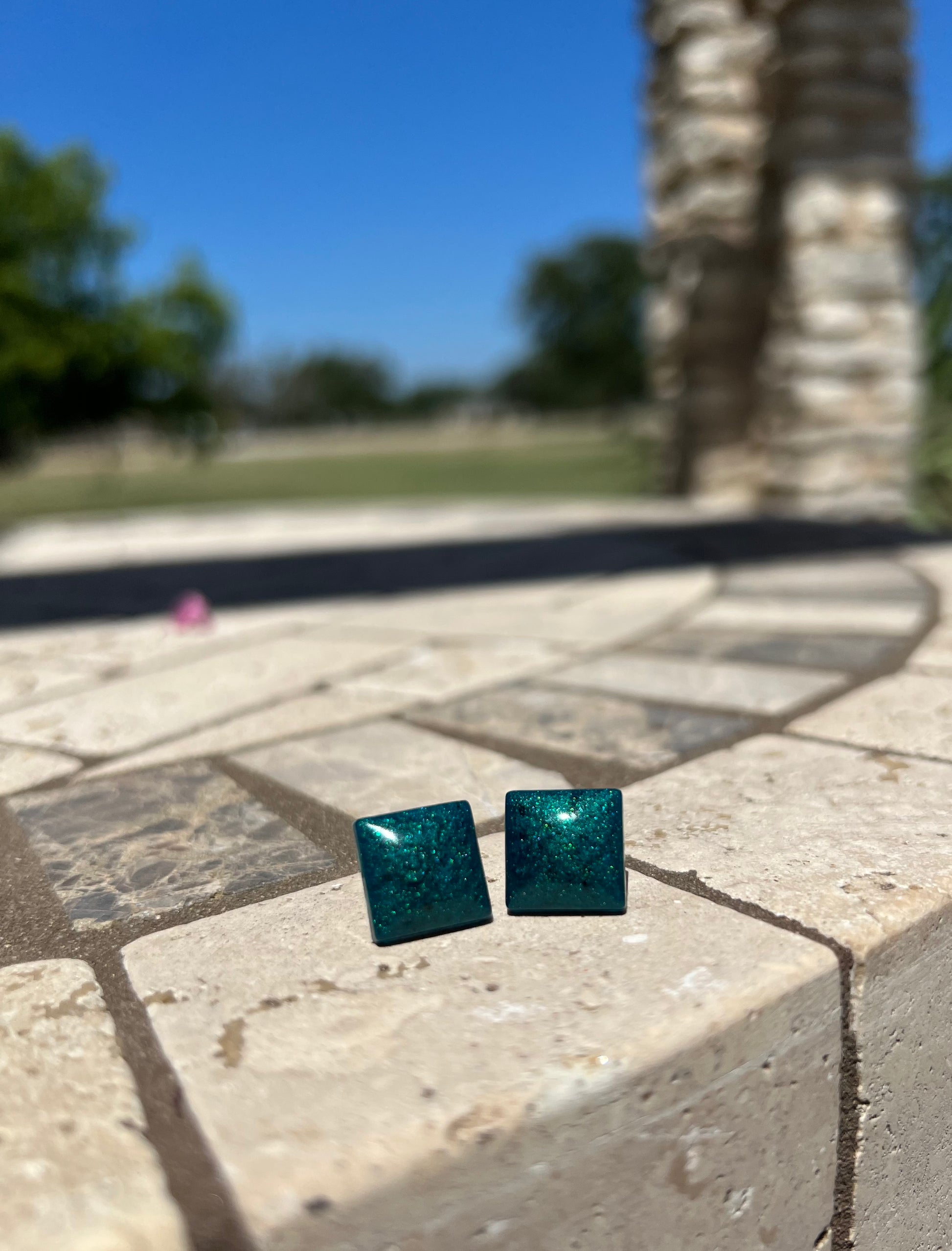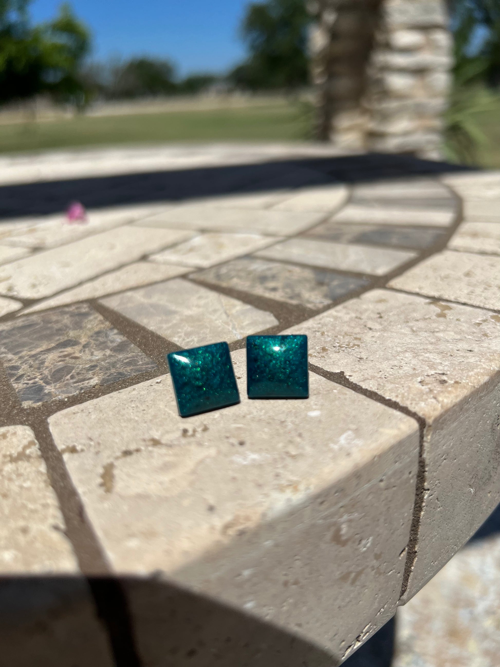 These handmade earrings offer a touch of elegance and sophistication. Their square shape and deep emerald green hue add a beautiful sparkle to any ensemble. Crafted from epoxy for a durable finish that won't tarnish, these earrings make the perfect addition to any jewelry collection.