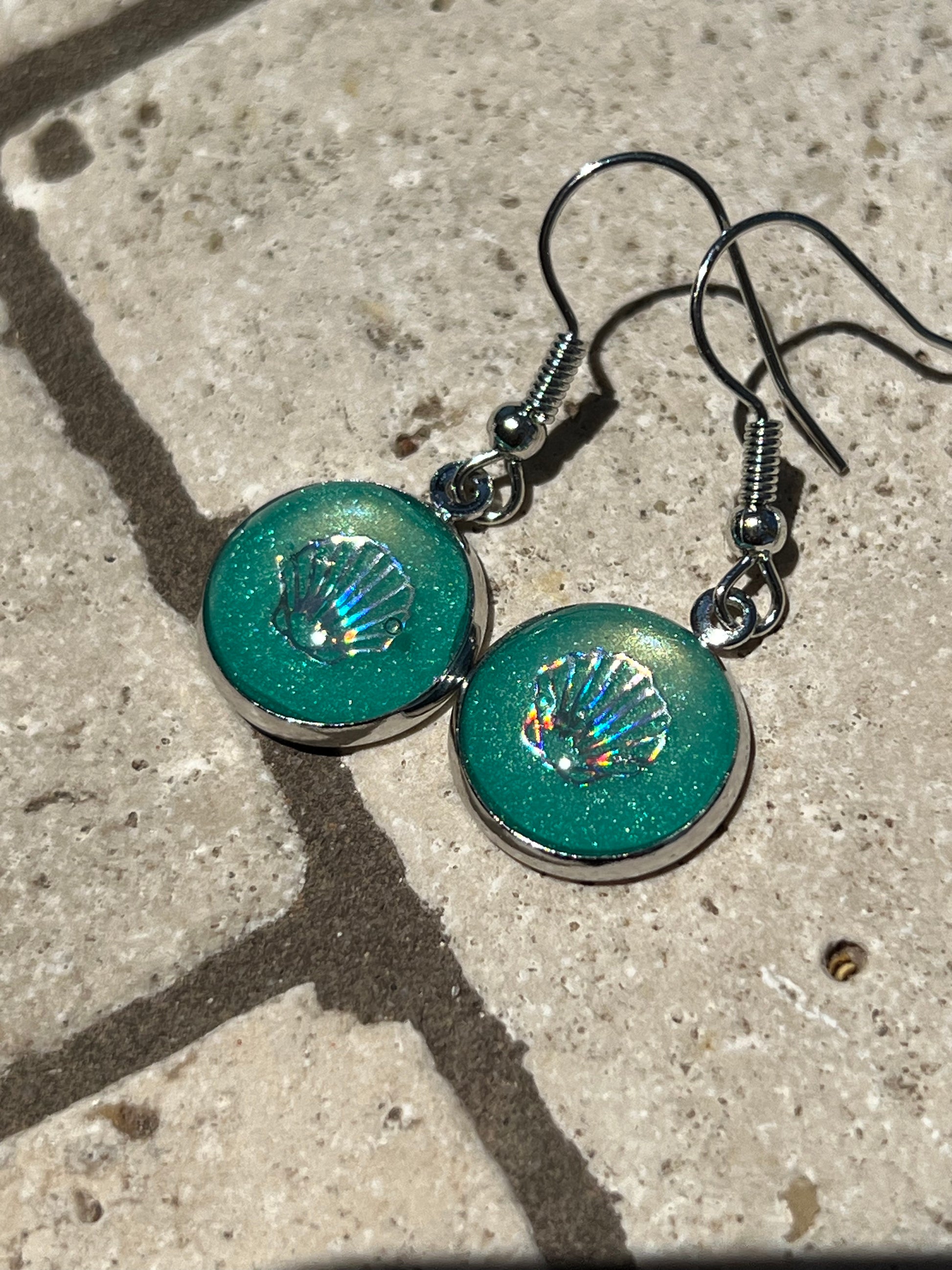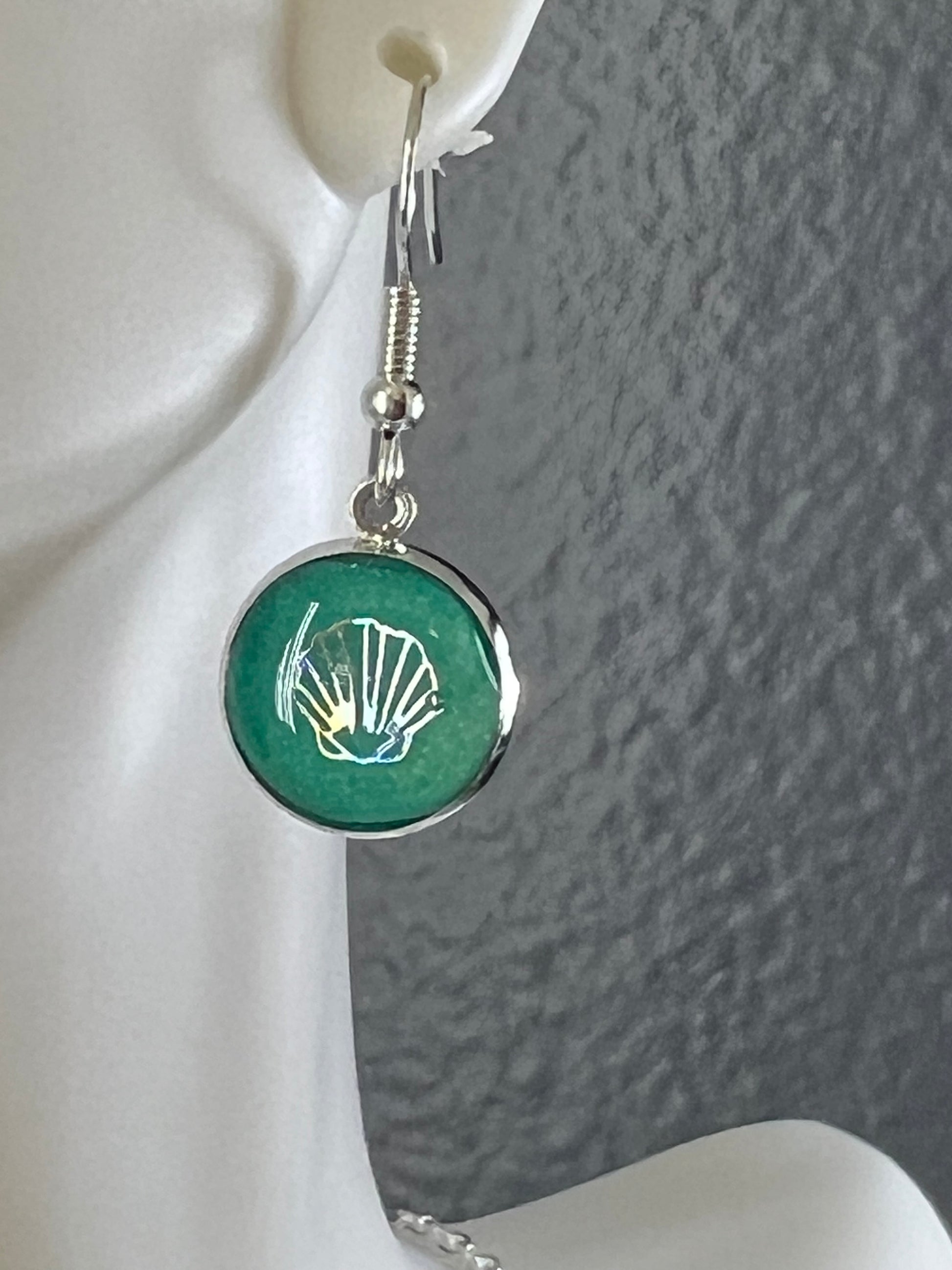 Dimension: stainless steel hooks, earrings center are about 12 mm in inner base, center piece is made of alloy, epoxy, green colorant and a holographic design.