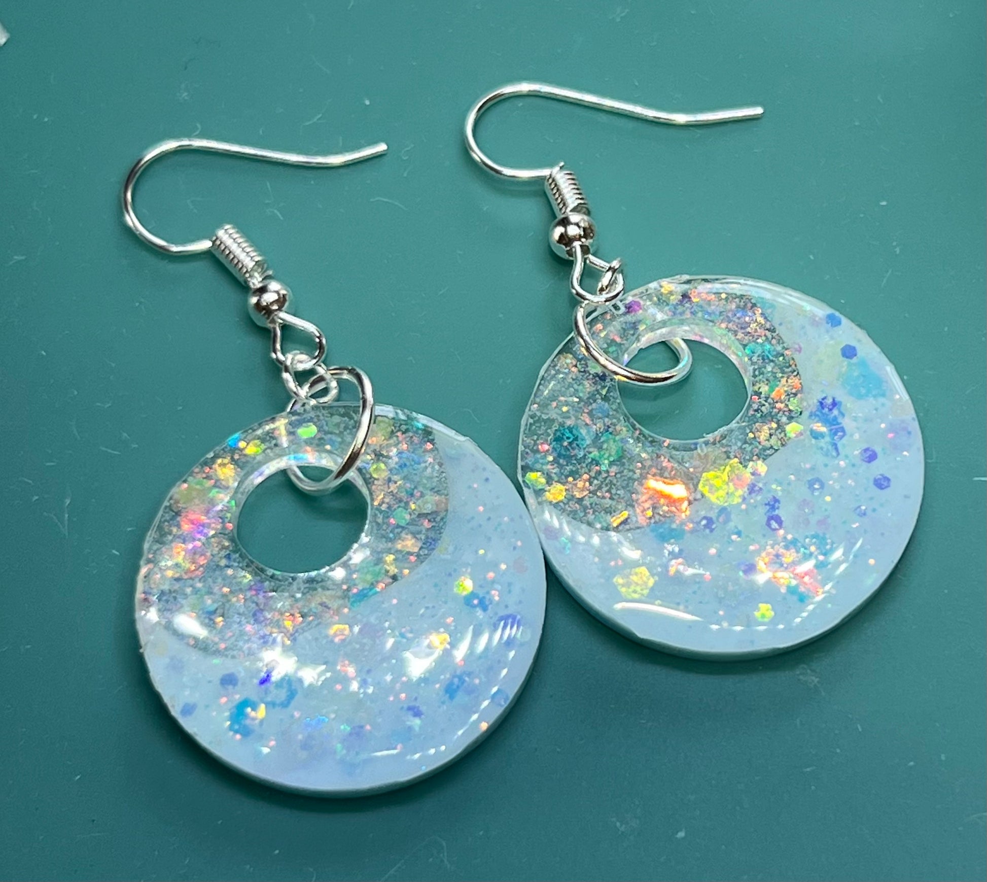 These beautiful earrings feature a unique combination of epoxy and opal affect giving them a timeless shine that is sure to last. The light blue and opal tones will take you on a journey of stylish sophistication.