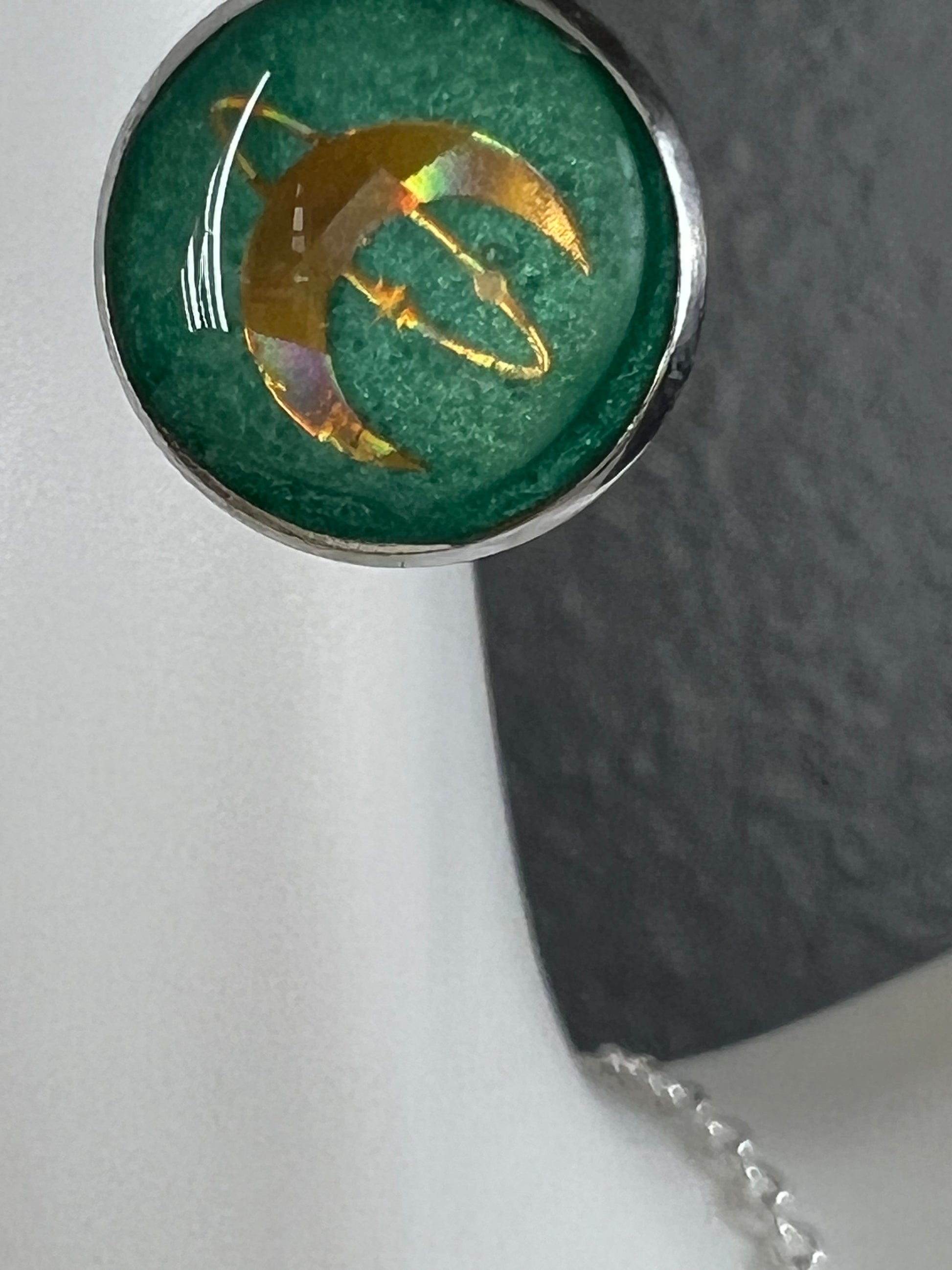 These earrings make a stunning fashion statement with a lush green background and a holographic design in the center. Add a touch of sparkle to your look and stand out from the crowd.