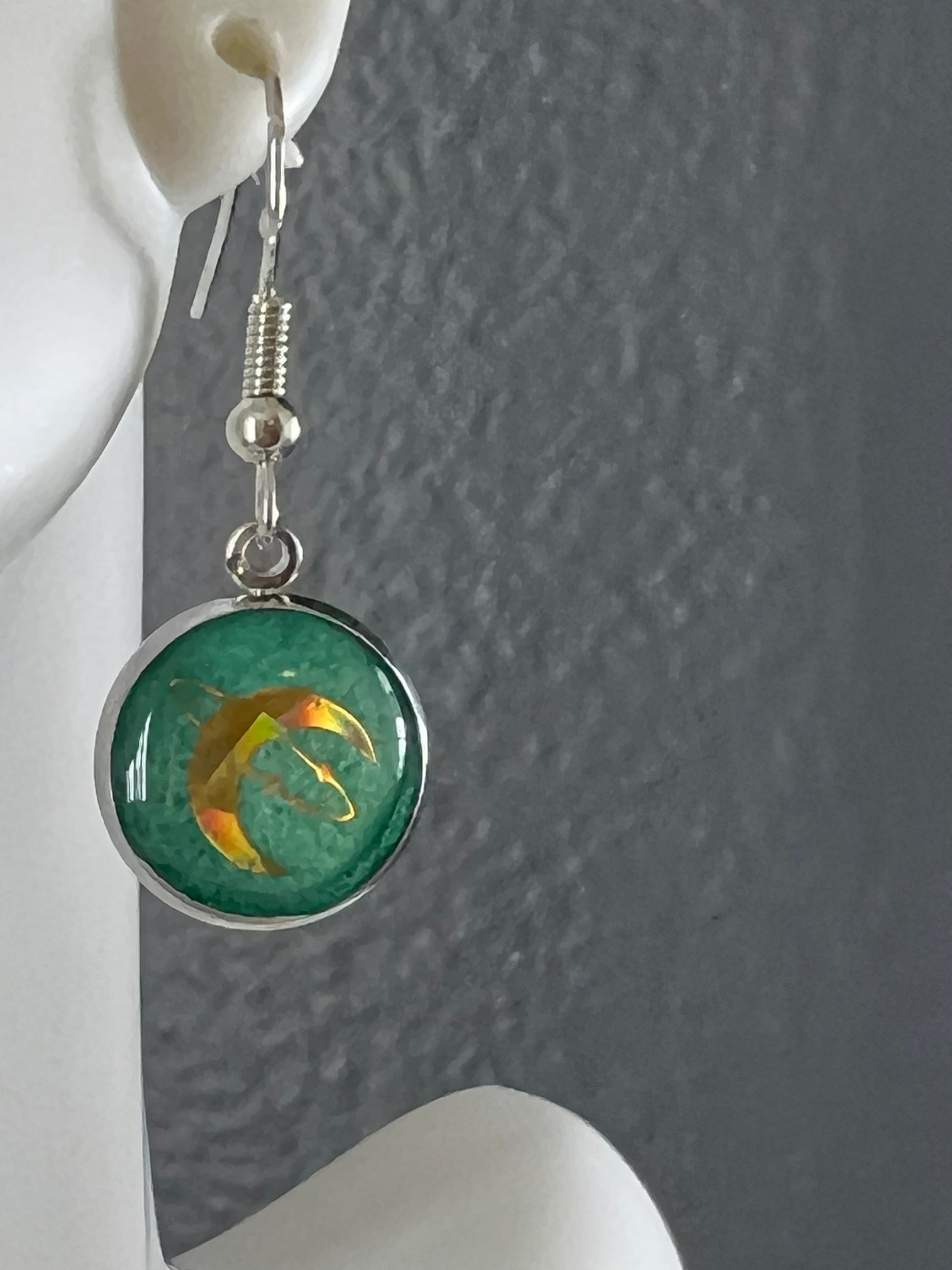 Dimension: stainless steel hooks, earrings center are about 12 mm in inner base, center piece is made of alloy, epoxy, green colorant and a holographic design.