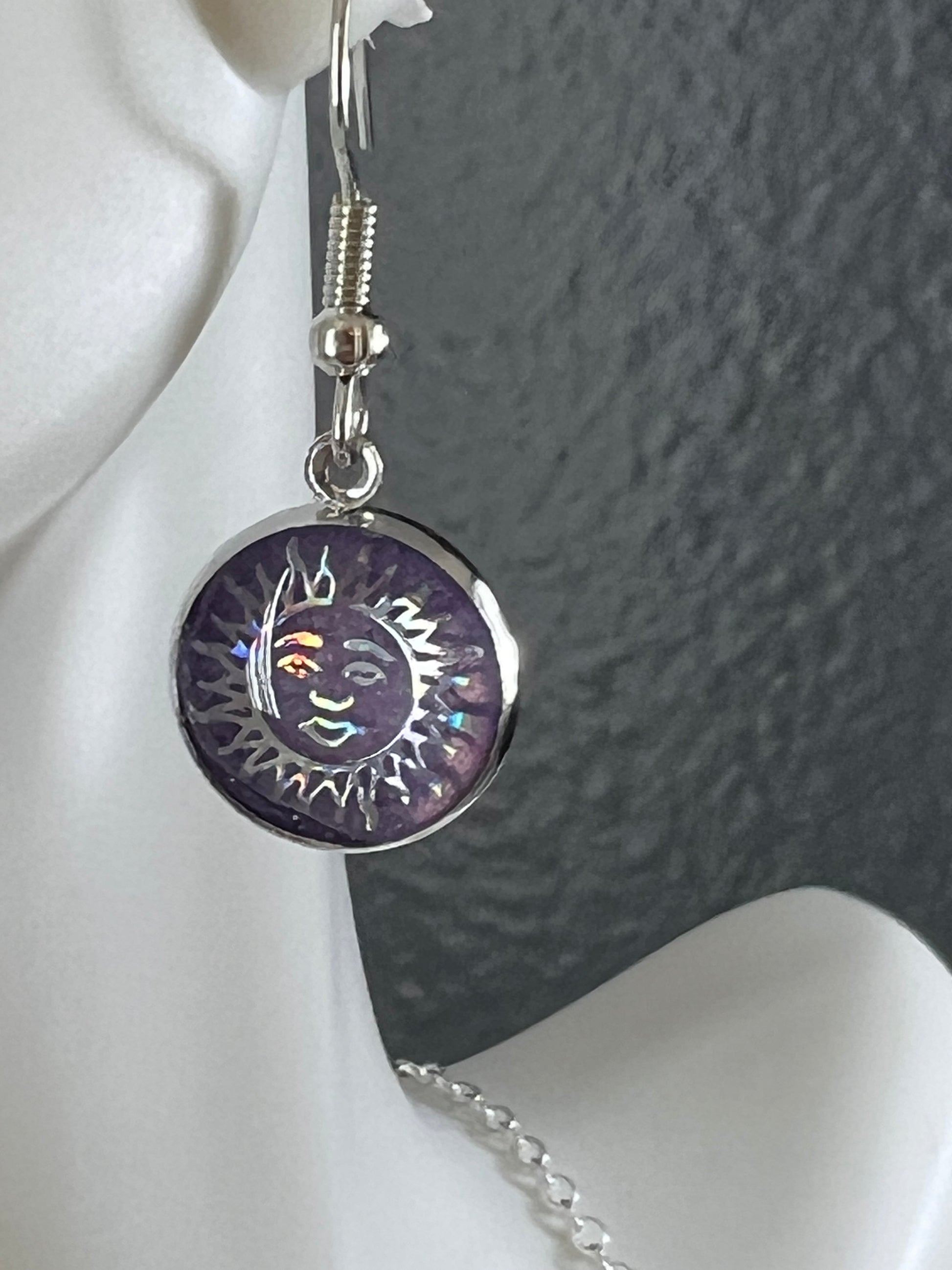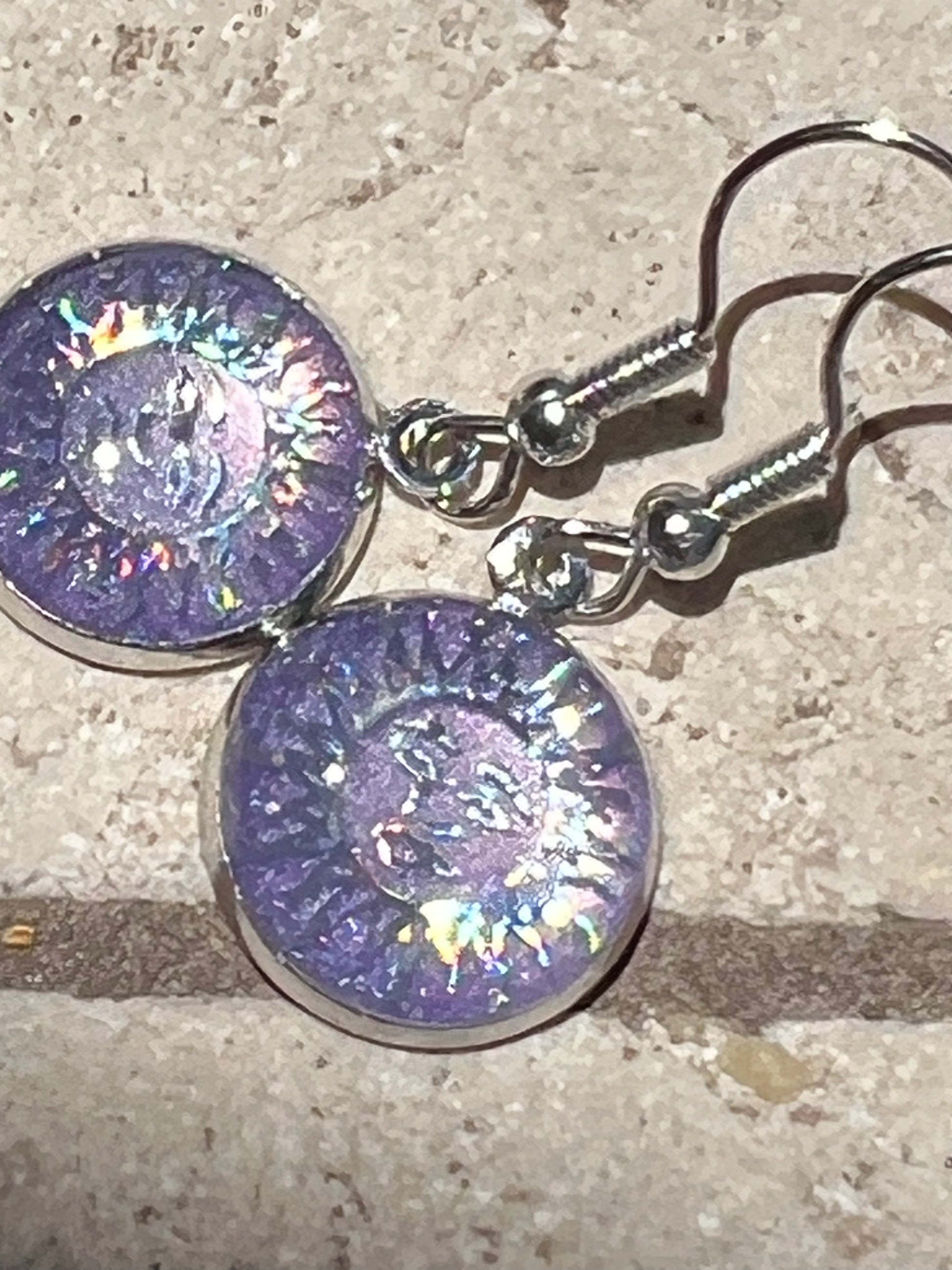 Dimension: stainless steel hooks, earrings center are about 12 mm in inner base, center piece is made of alloy, epoxy, purple colorant and a holographic design.