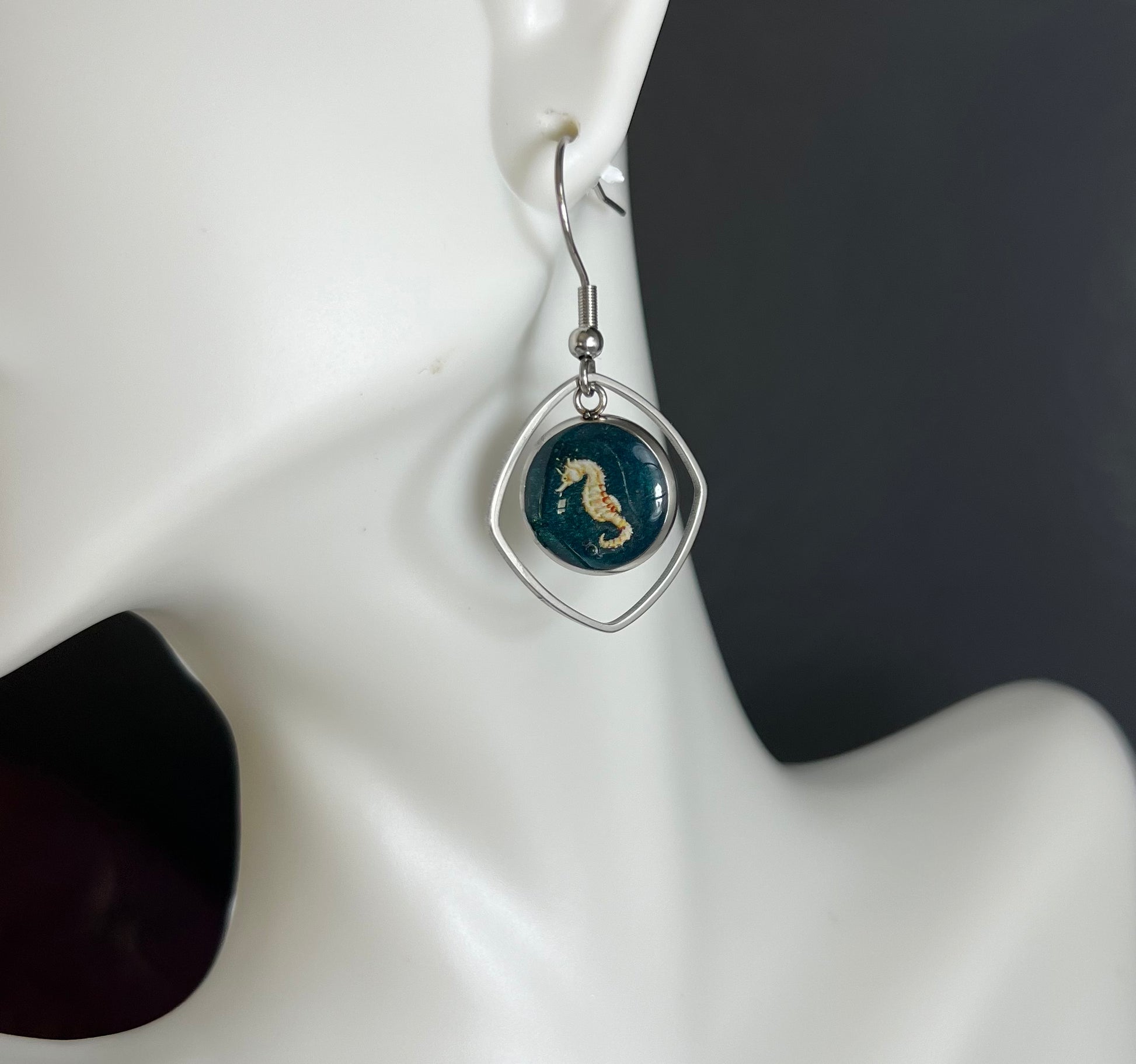 These beautiful silver earrings feature a striking gold seahorse design with a deep green emerald background. The intricate craftsmanship and eye-catching colors will add a touch of elegance to any outfit.