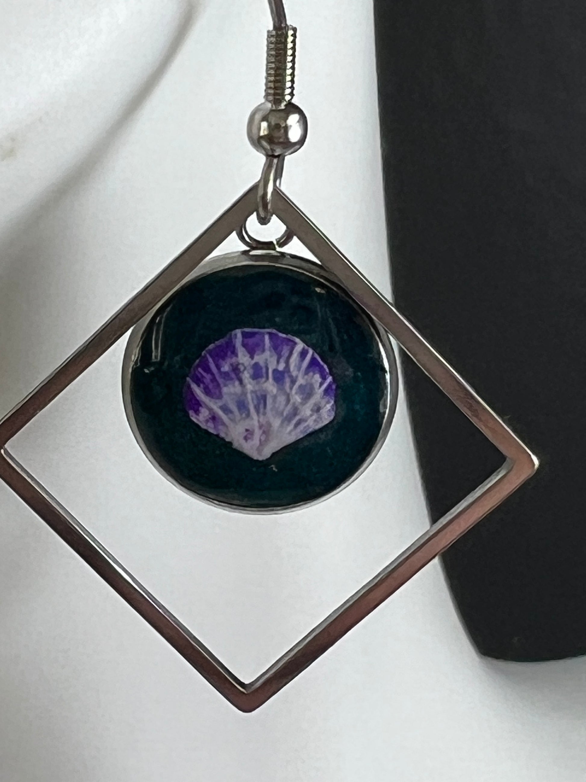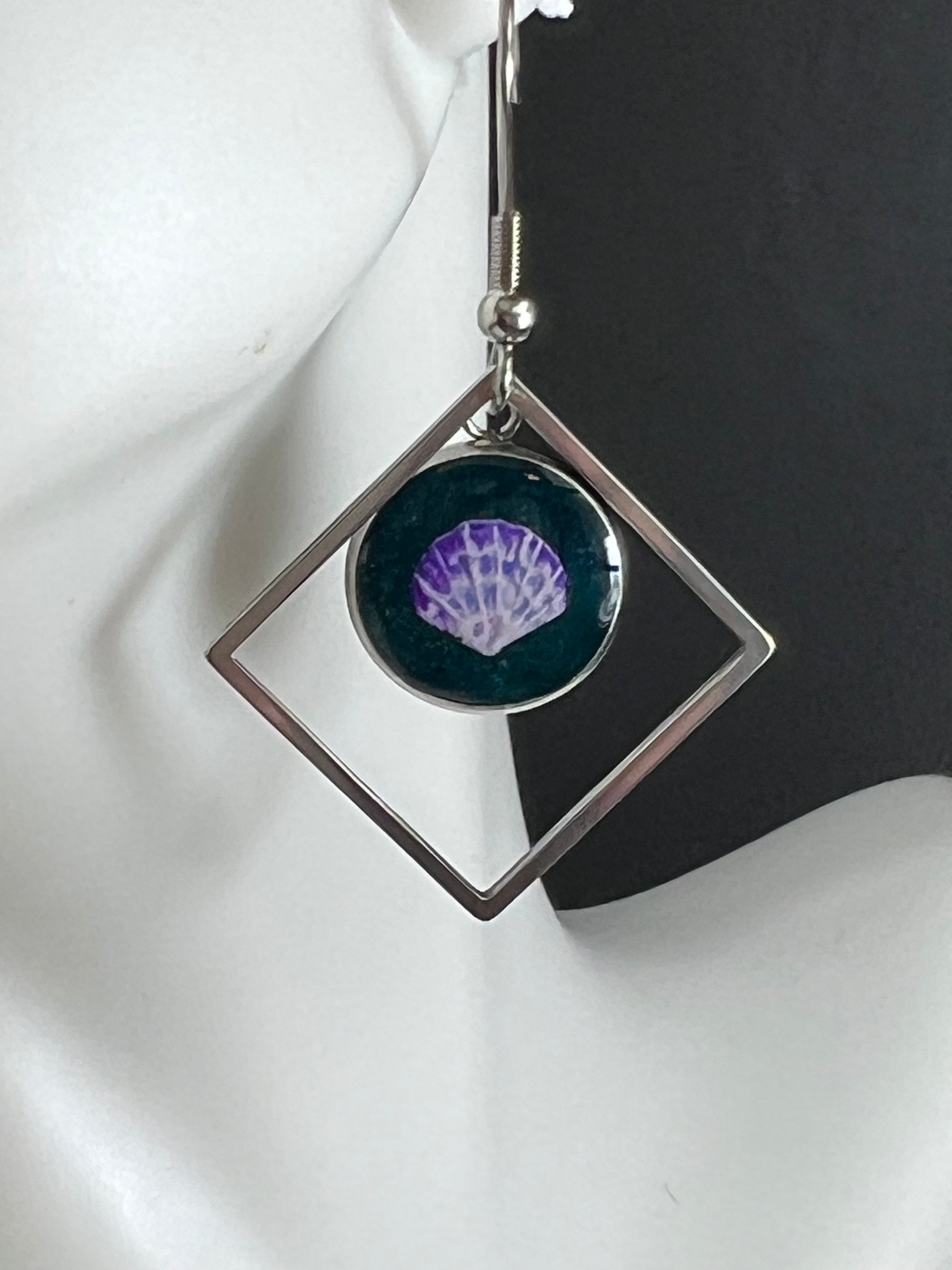These handmade earrings feature a stunning purple shell set on a deep emerald green background. The sterling silver earrings are finished with beautiful epoxy for an eye-catching, luxurious look.