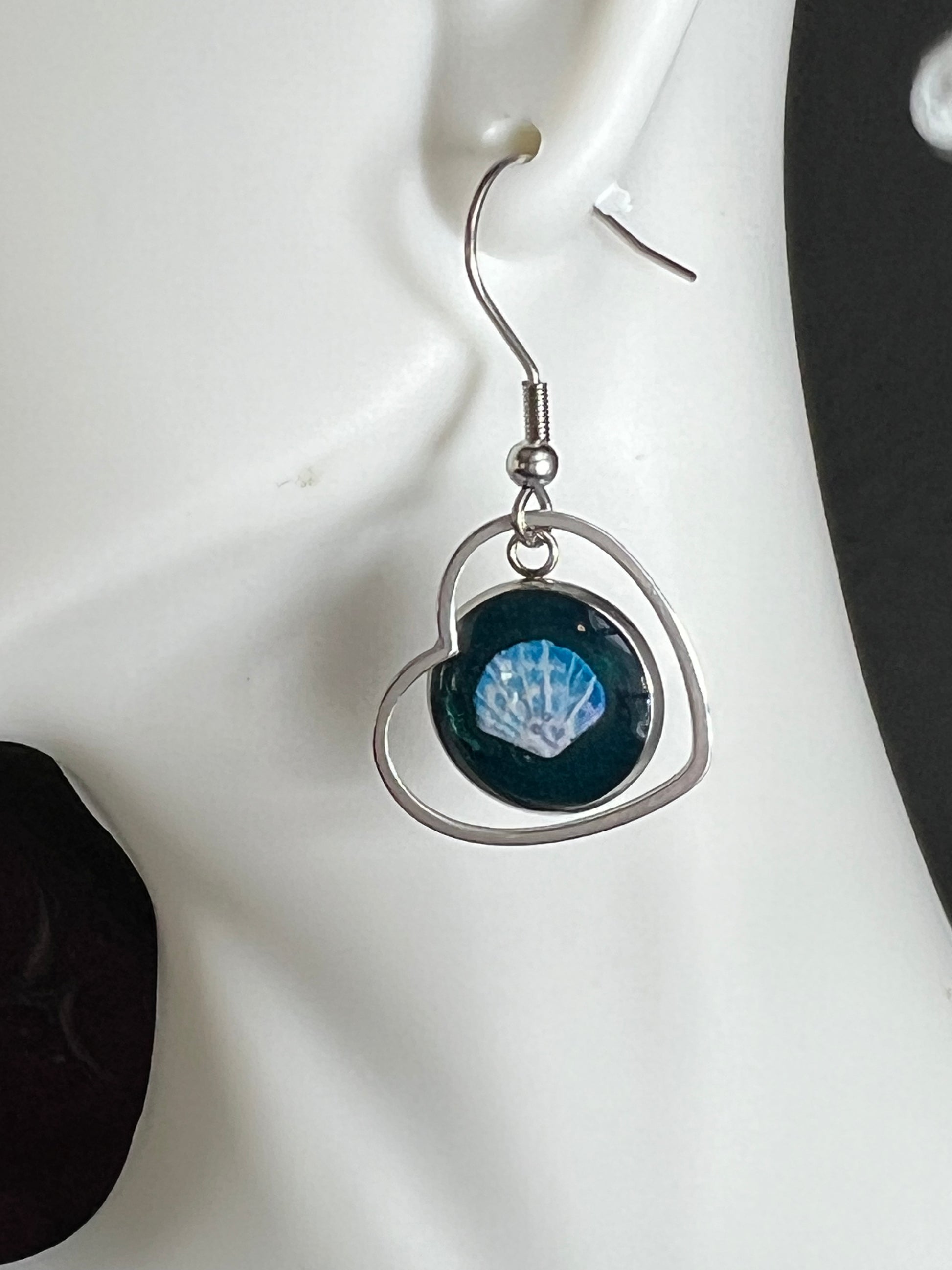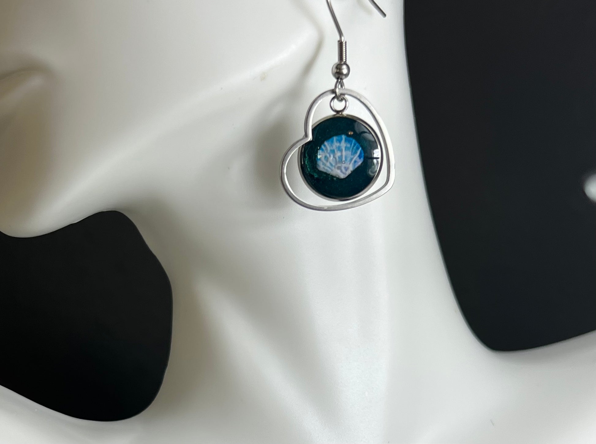 These elegant silver earrings add a touch of sophistication to any look. The handmade epoxy setting showcases a beautiful blue shell with a deep emerald green background, making them the perfect accessory for any occasion.