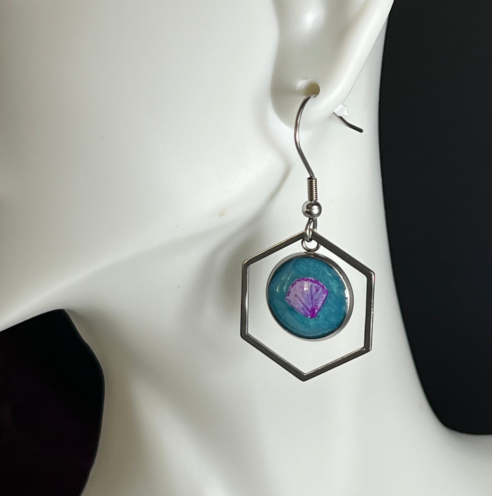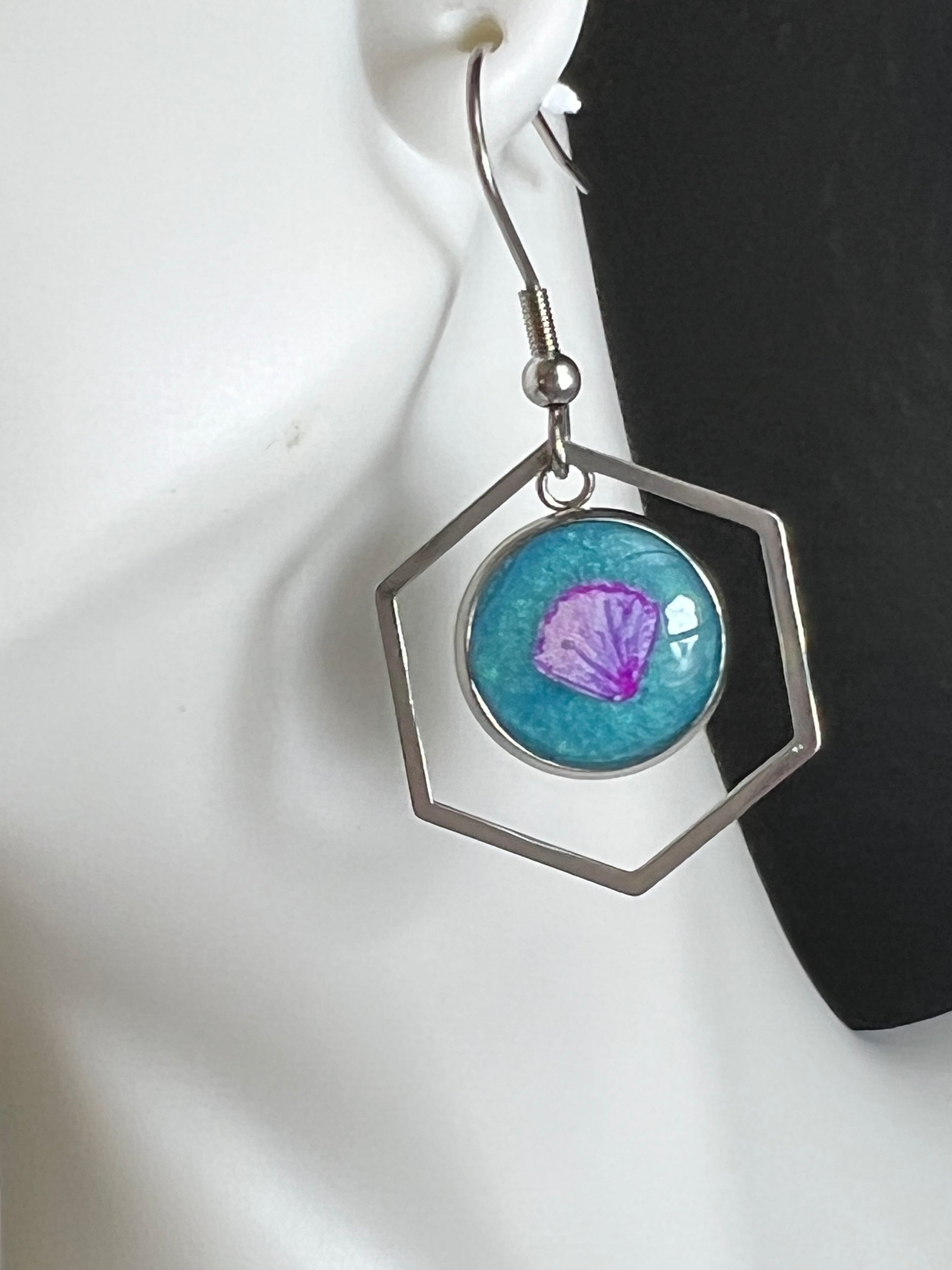 These eye-catching silver earrings are handmade with epoxy and feature a light purple shell set against a sky blue background. Perfect for special occasions or everyday wear, you'll sparkle in these unique, one-of-a-kind earrings.
