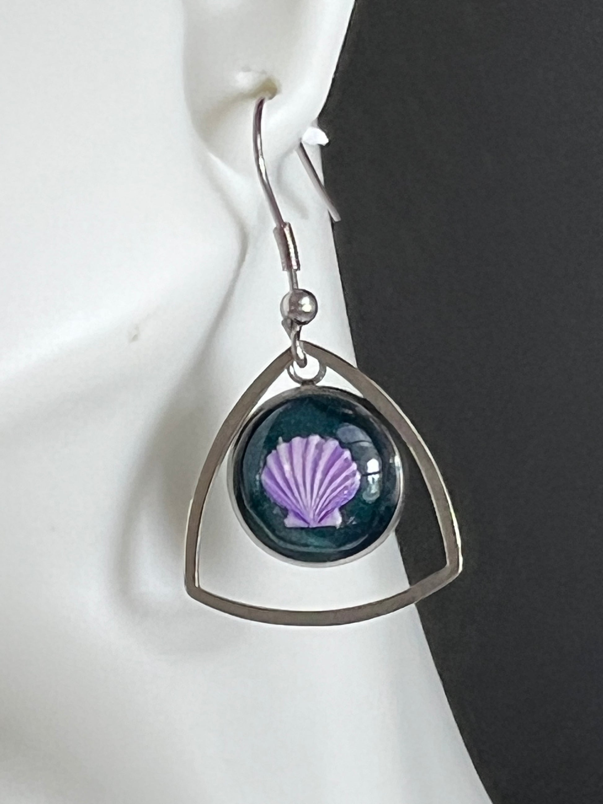 Stylishly unique, these handcrafted earrings feature a beautiful purple shell with a deep emerald green background, set in a silver frame. Show off your individual style with these fashionable silver earrings.