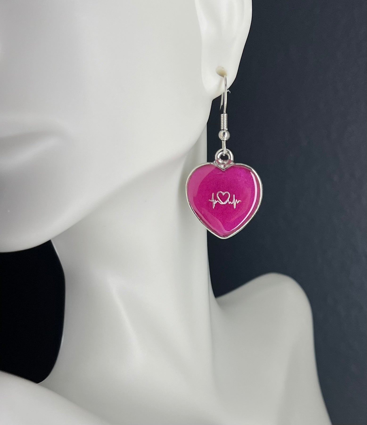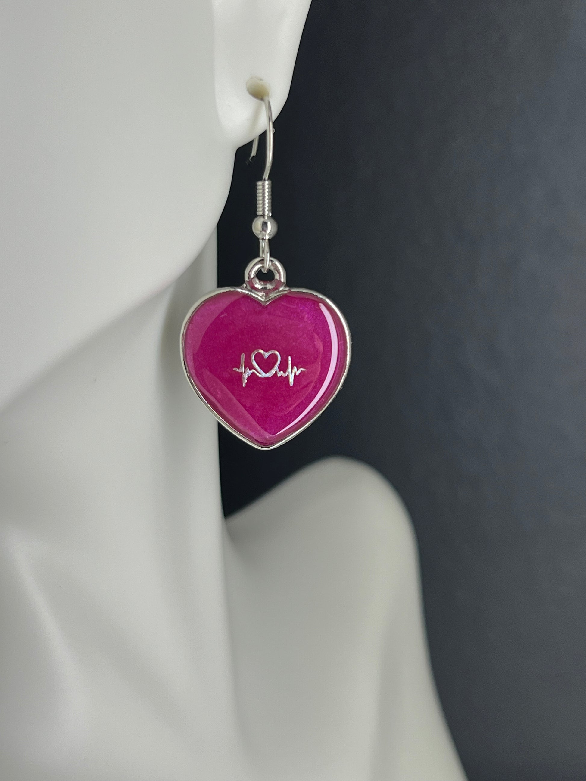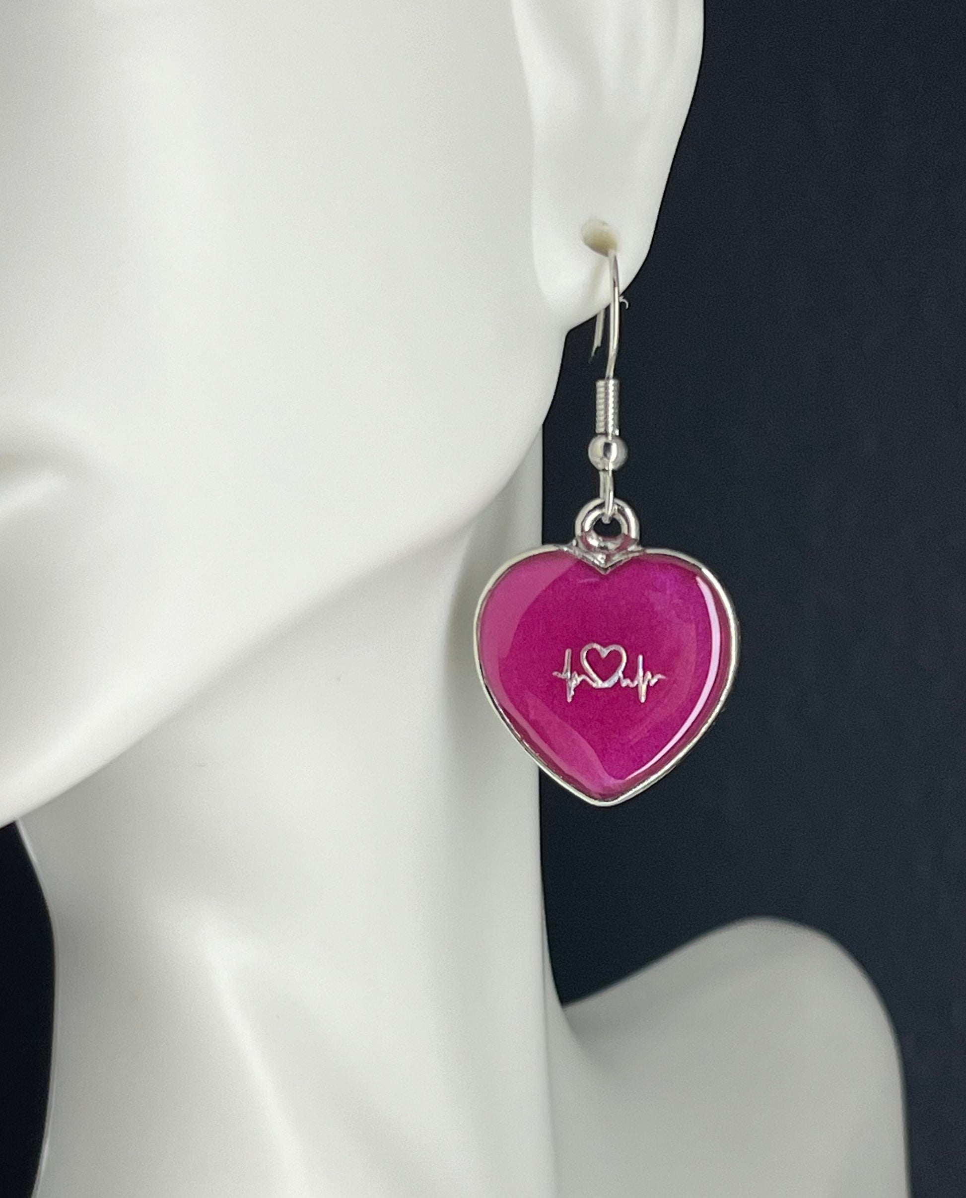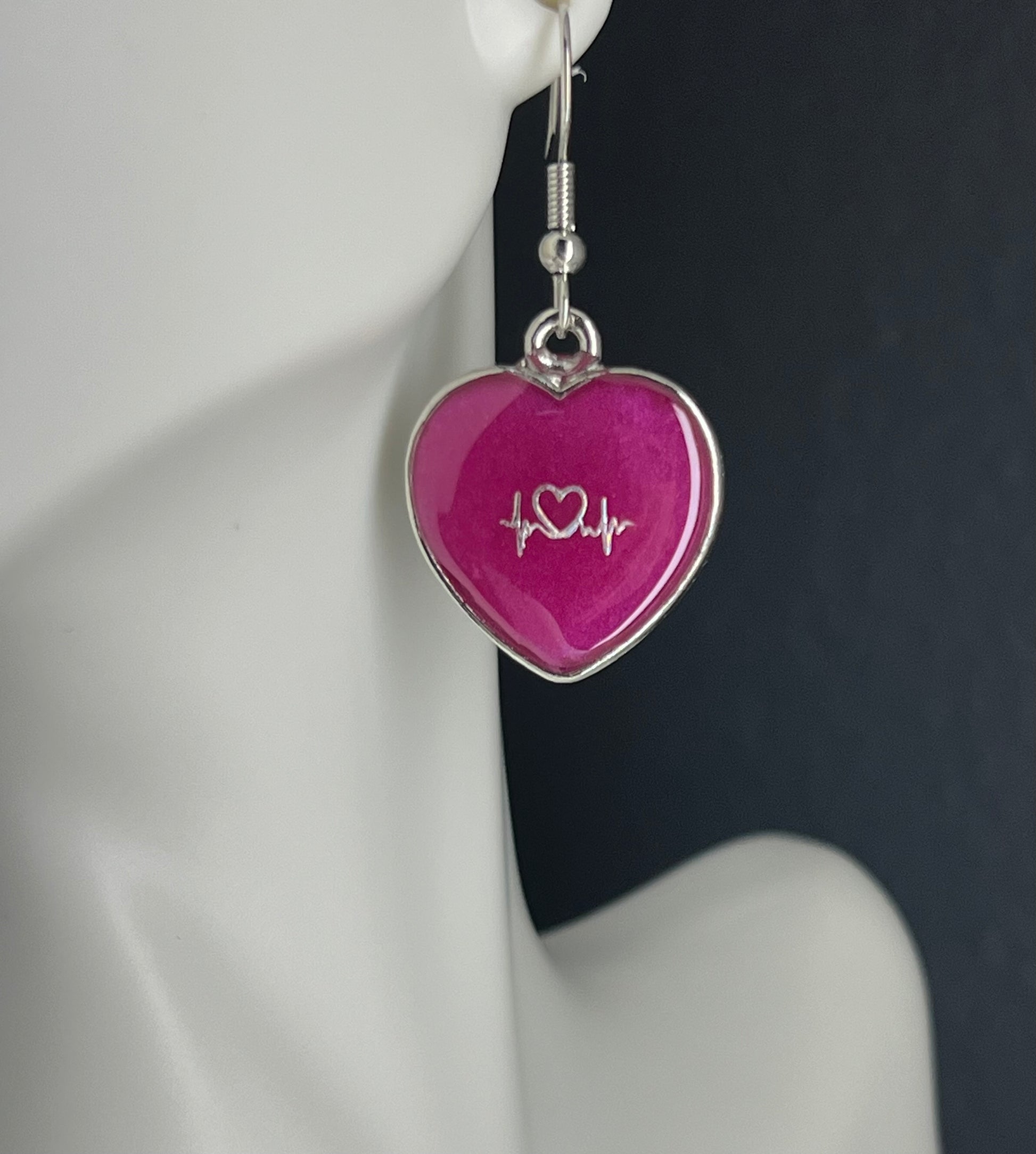 Add an elegant touch to your outfit with our heart-shaped Valentine earrings. The brilliant purple red color is sure to make a statement. Handmade with epoxy, these earrings are crafted with care and precision. Perfect for any occasion.