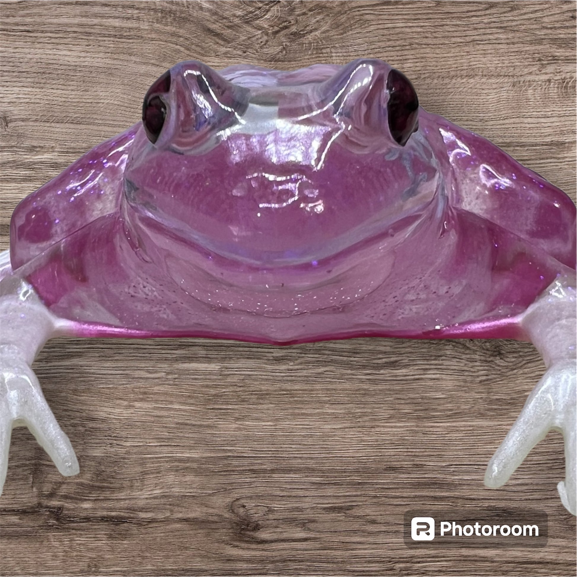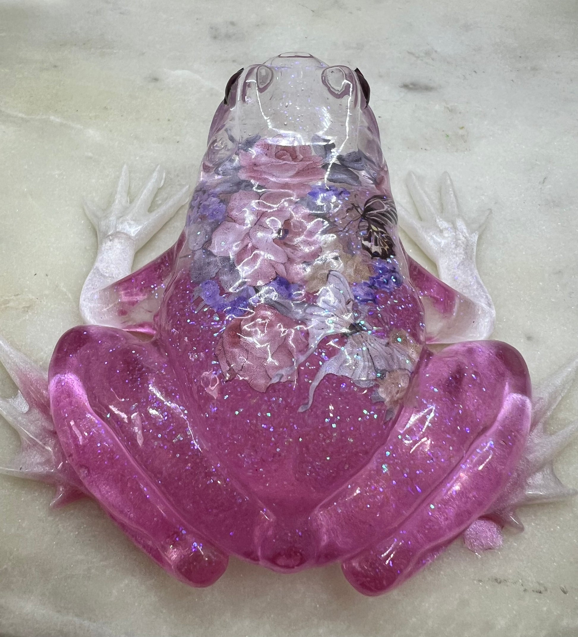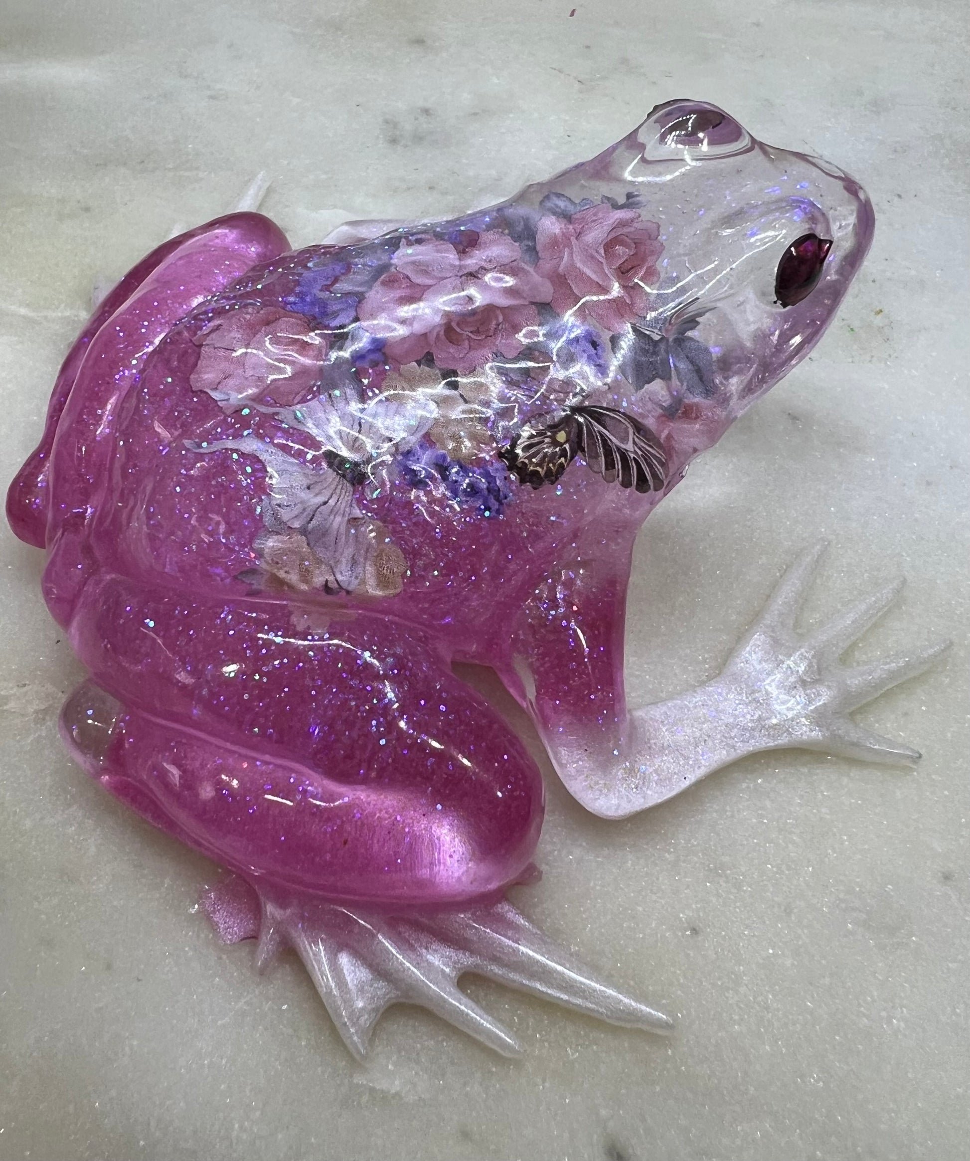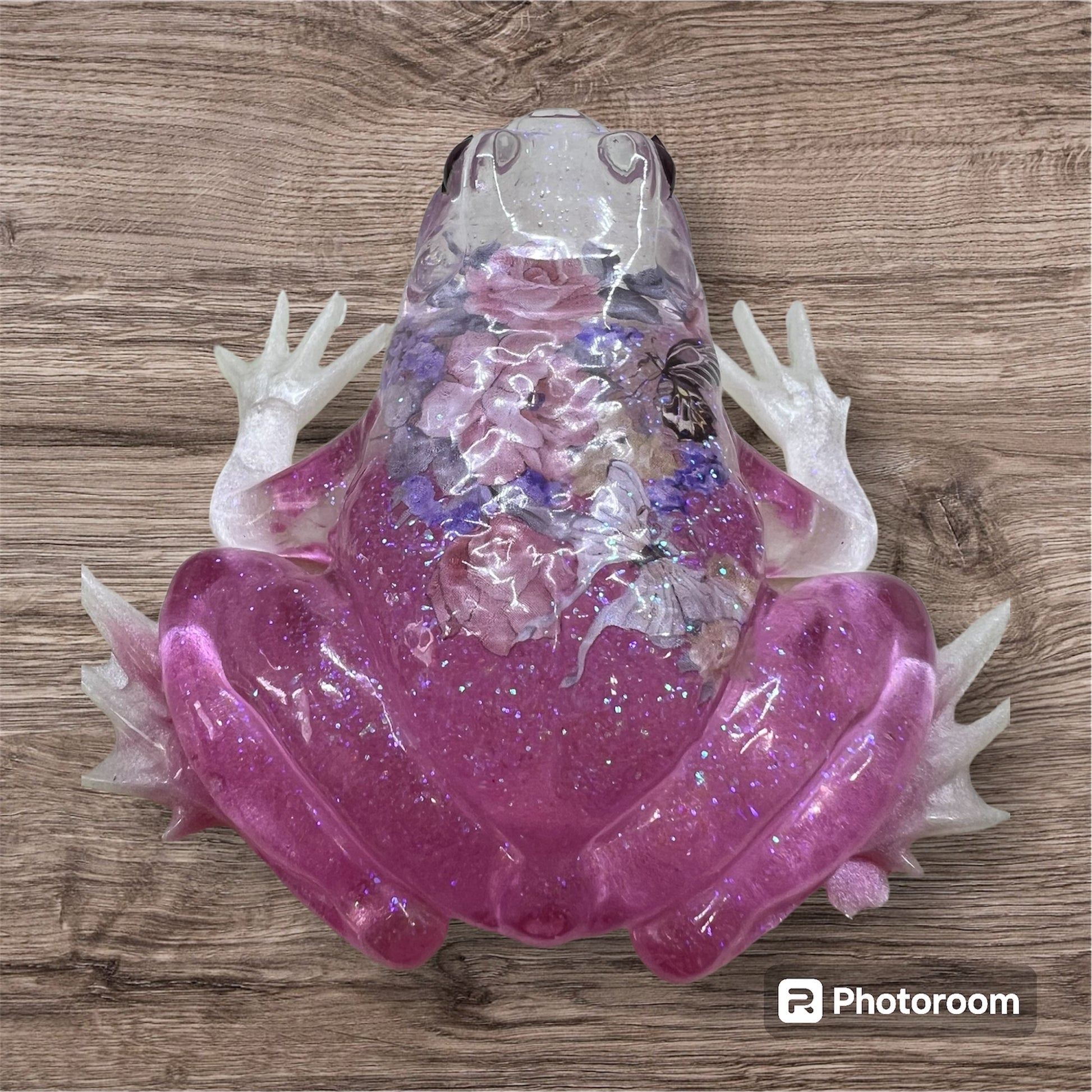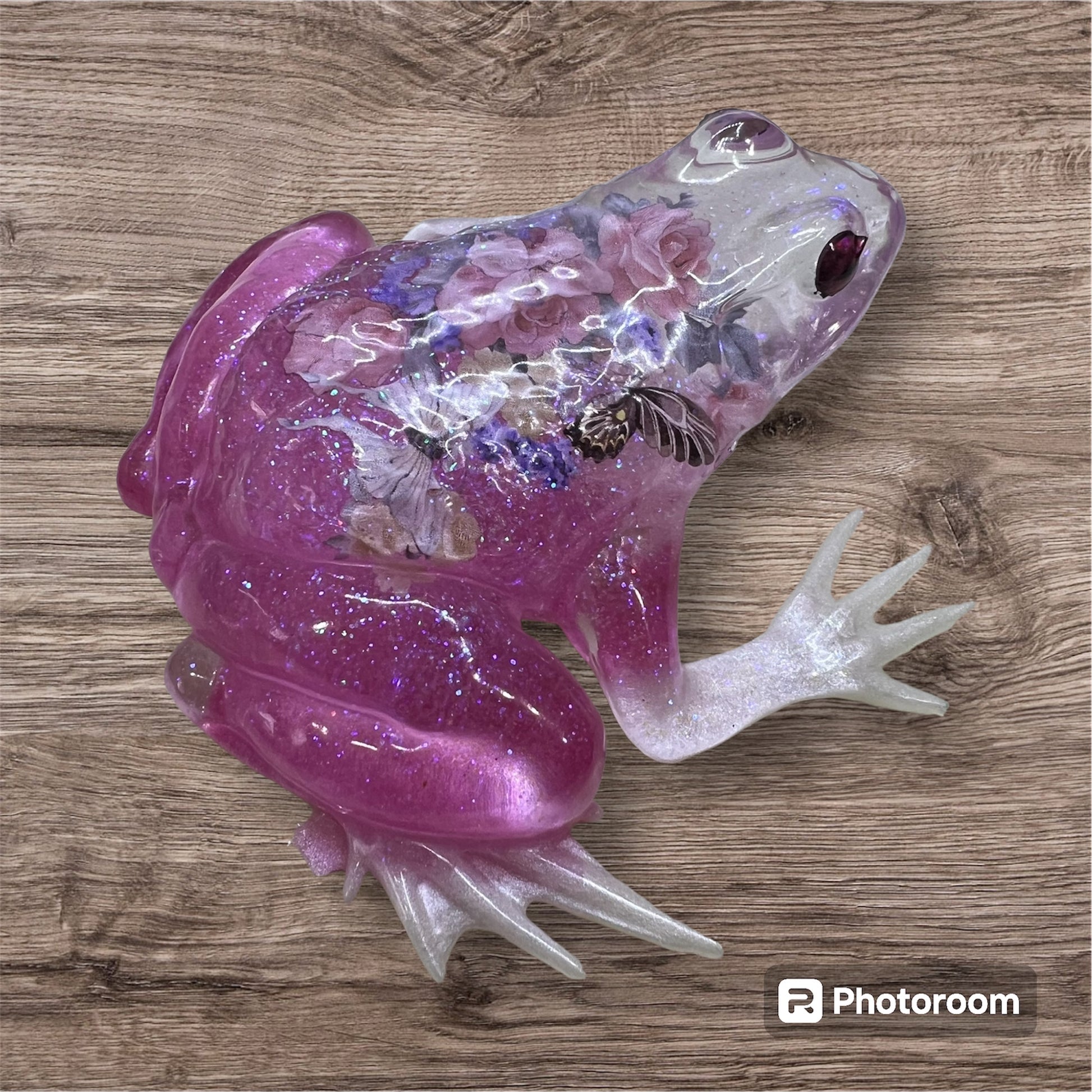 Expertly crafted with epoxy resin, this Flowered Frog showcases a unique pink design adorned with a stunning flower on its back. Its lifelike eyes and delicate white feet add a touch of charm and make it the ideal decor piece. Each one-of-a-kind creation is truly adorable and sure to be a conversation starter.