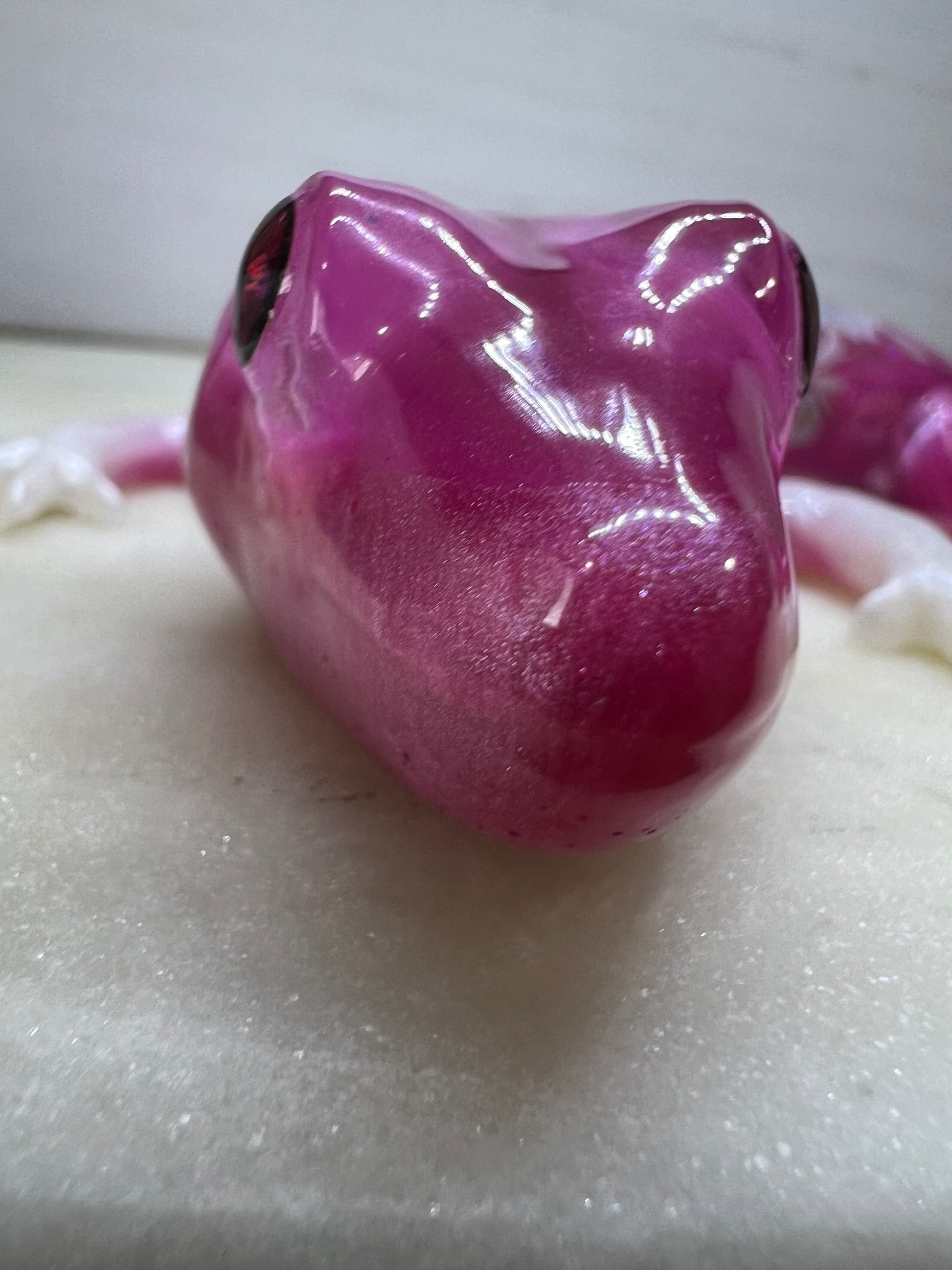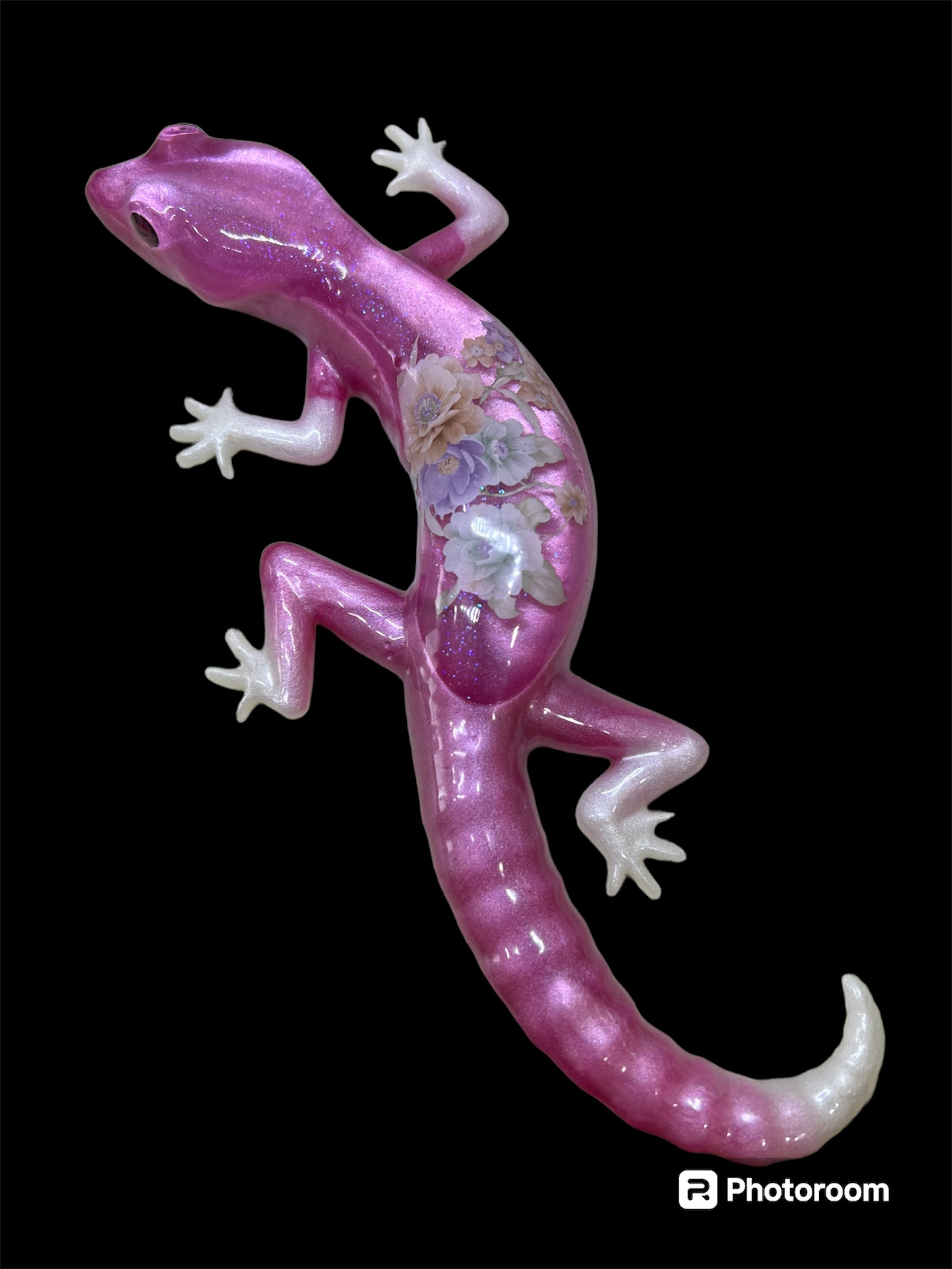 Handmade with epoxy resin, this adorable and classy lizard boasts a gorgeous pink color with pearl white feet. With beautiful flowers adorning its back, it is a one-of-a-kind piece that will add a touch of beauty and elegance to any decor. A perfect conversation starter for any room.