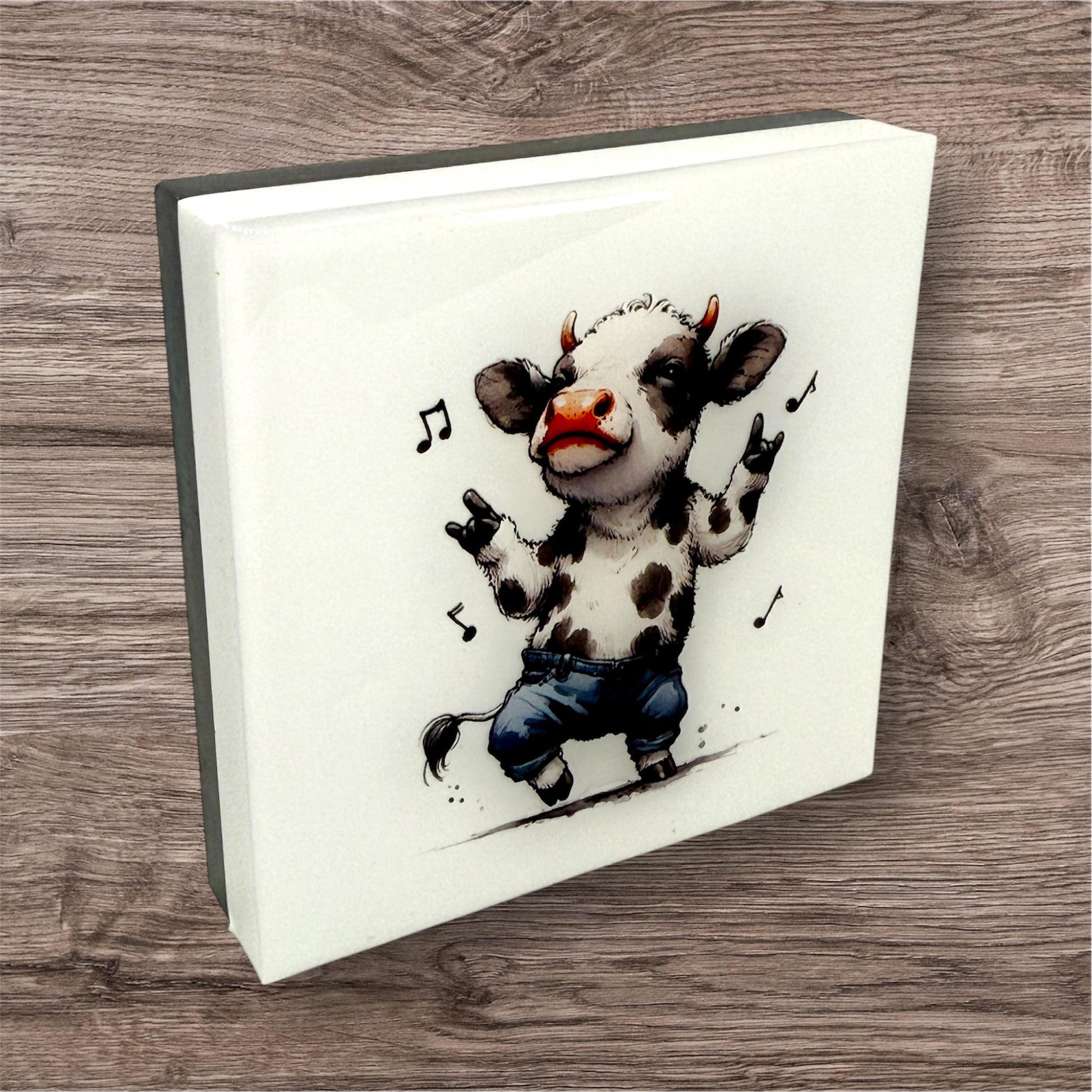 Made from high-quality epoxy resin, the Dancing Cow Coaster showcases a lively cow design that adds charm to any desk or table. This large single coaster not only protects surfaces from spills and stains but also serves as a practical paper holder, making it perfect for teachers or office environments. Its cheerful appearance is sure to brighten your day and bring a smile every time you use it.
