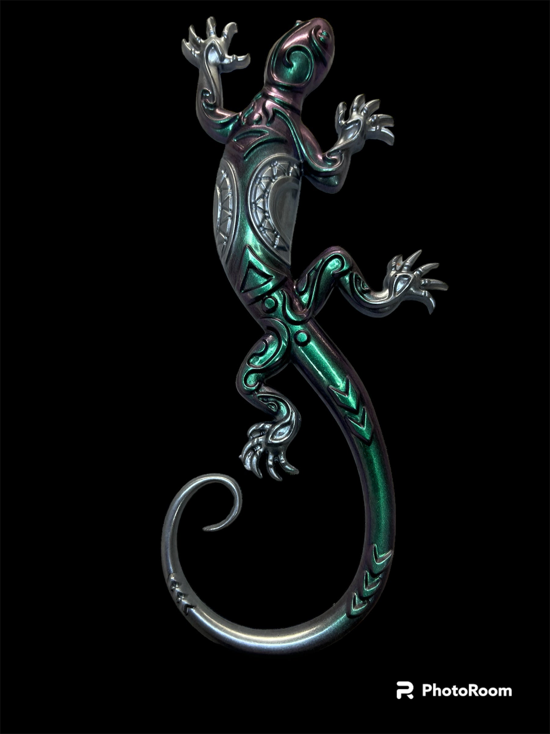 Expertly handcrafted with epoxy resin, this one-of-a-kind Gecko boasts a unique blend of greens and silver. Its adorable design makes it the perfect addition to any wall and a surefire conversation starter. Elevate your home decor with this charming Gecko.