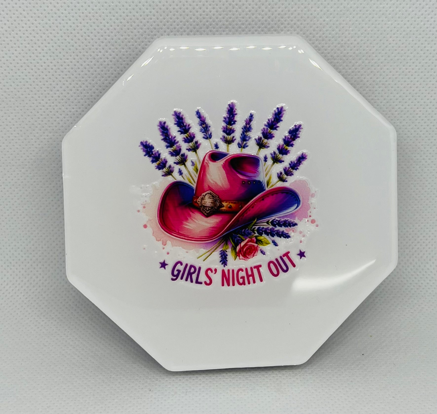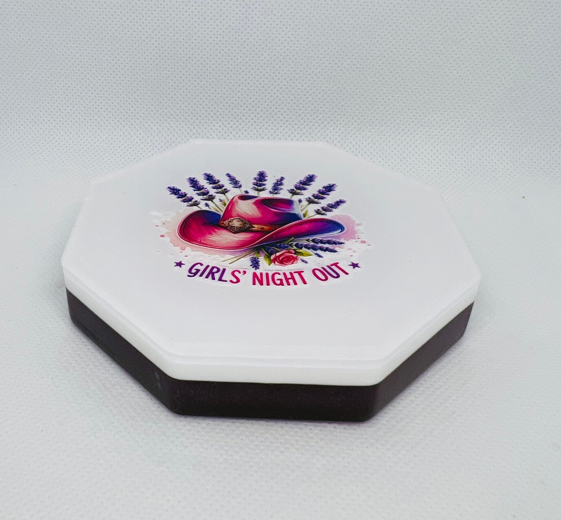Elevate your girls' night in with our one-of-a-kind coaster made with epoxy resin in white and purple. Featuring a charming cowboy hat design with the phrase "Girls Night Out," this coaster is the perfect addition to any Texas-themed decor. Say cheers to good times and great gifts.