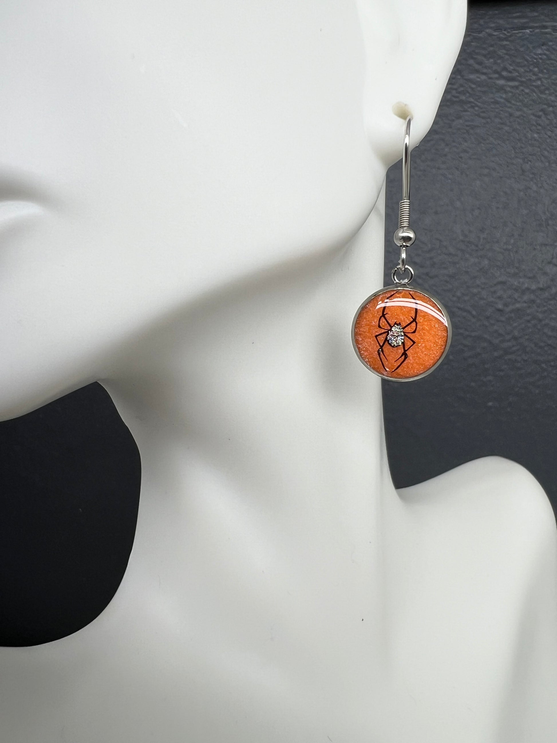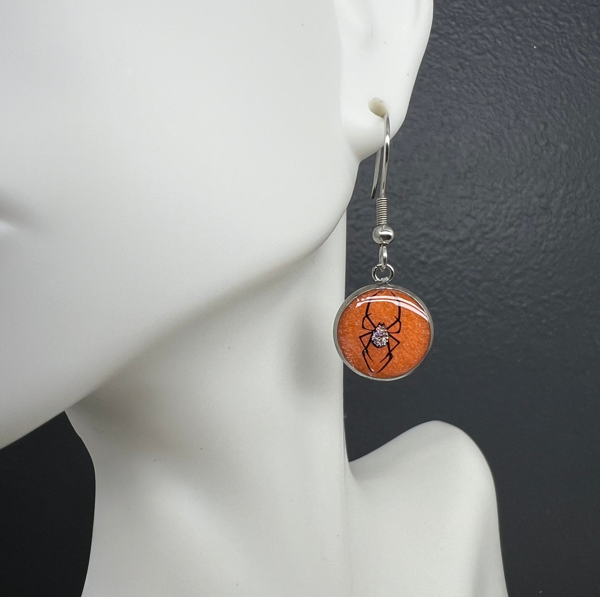 Expertly crafted from epoxy, these Halloween earrings feature adorable spiders on a vibrant orange background. Made with stainless steel, they are a must-have for any Halloween enthusiast.