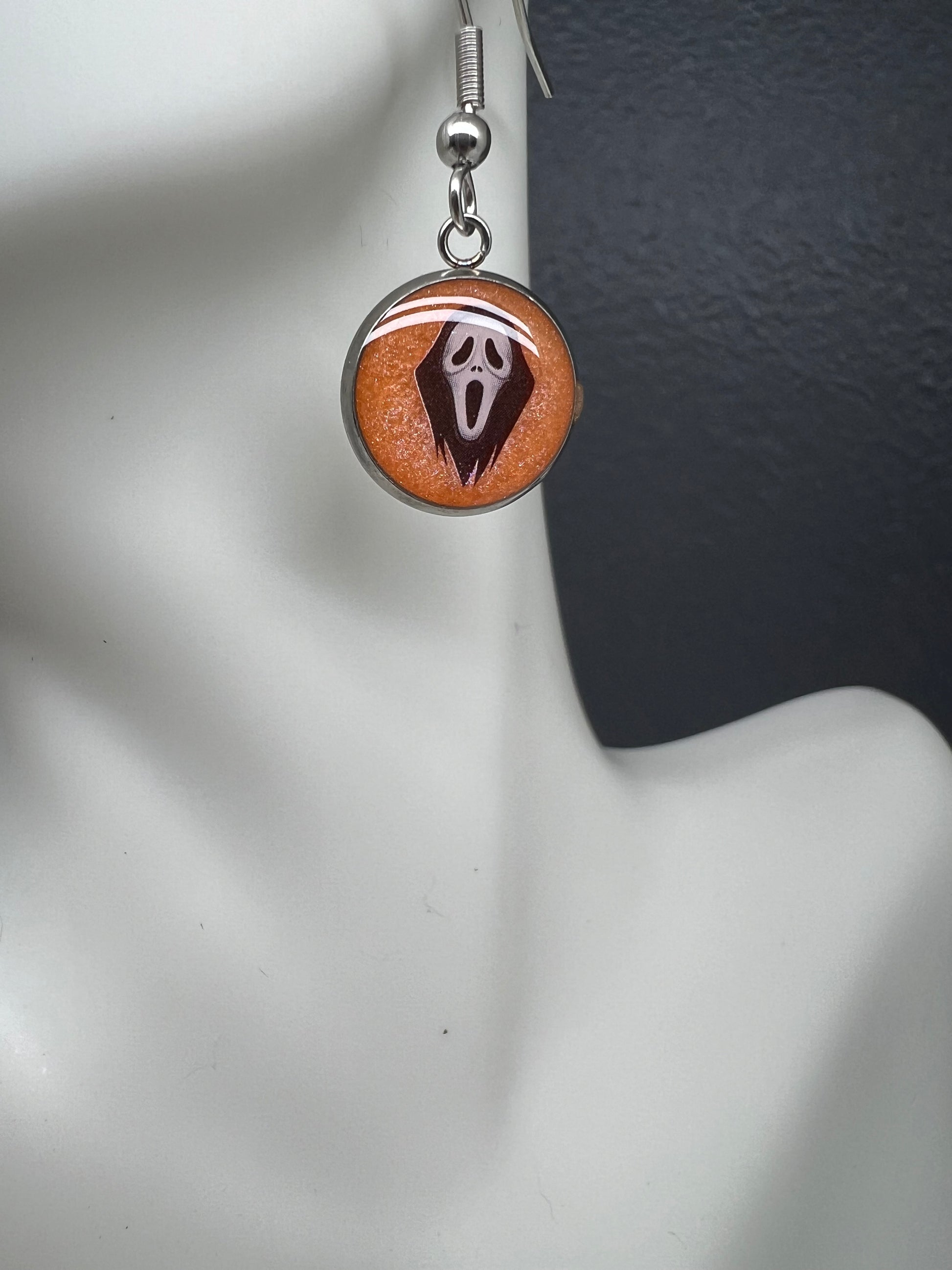 These Halloween earrings feature an adorable design with an orange background. Made with durable epoxy and stainless steel, they are perfect for adding a festive touch to your holiday outfit. Spook up your style with these fun and lightweight earrings.