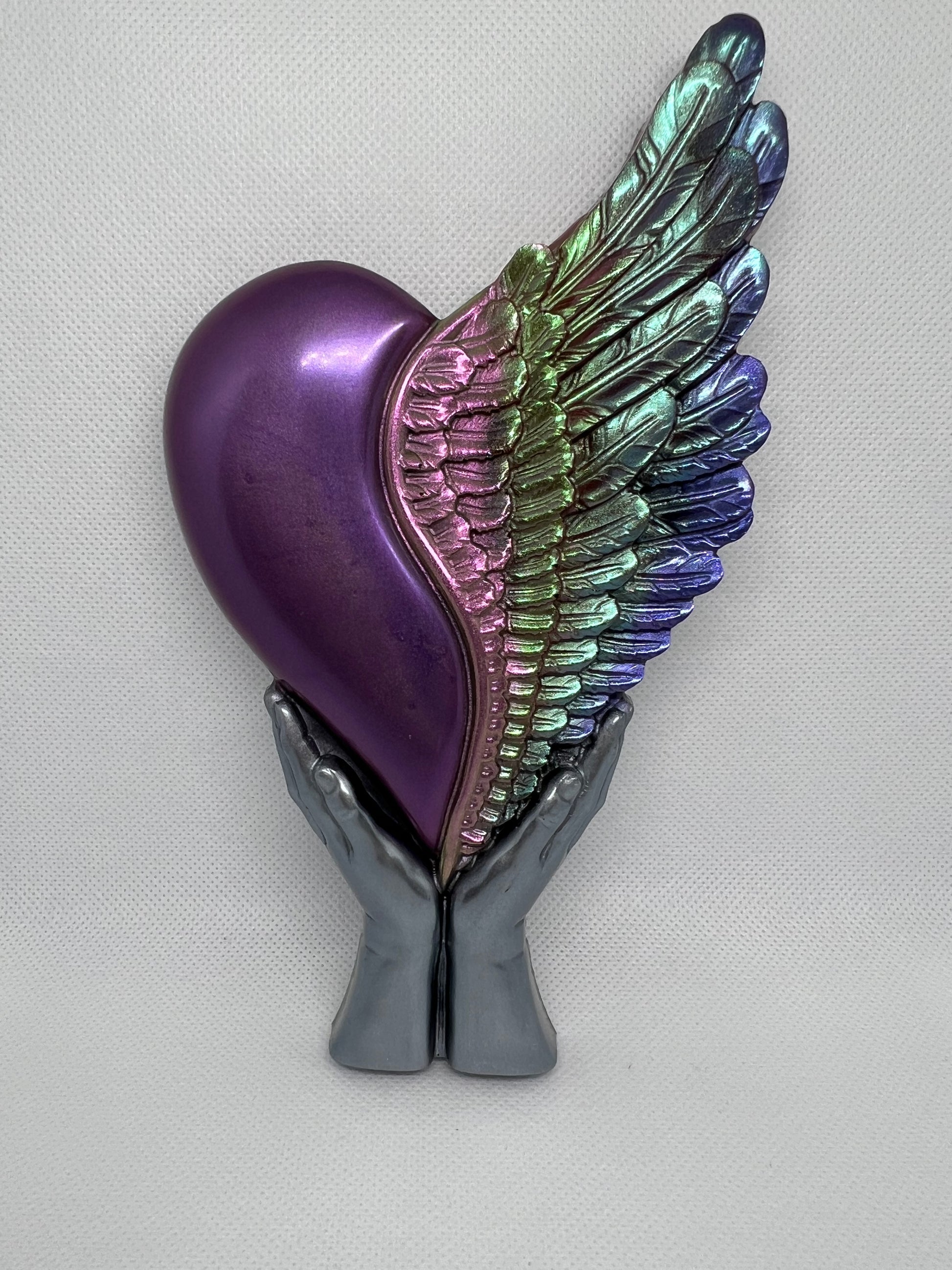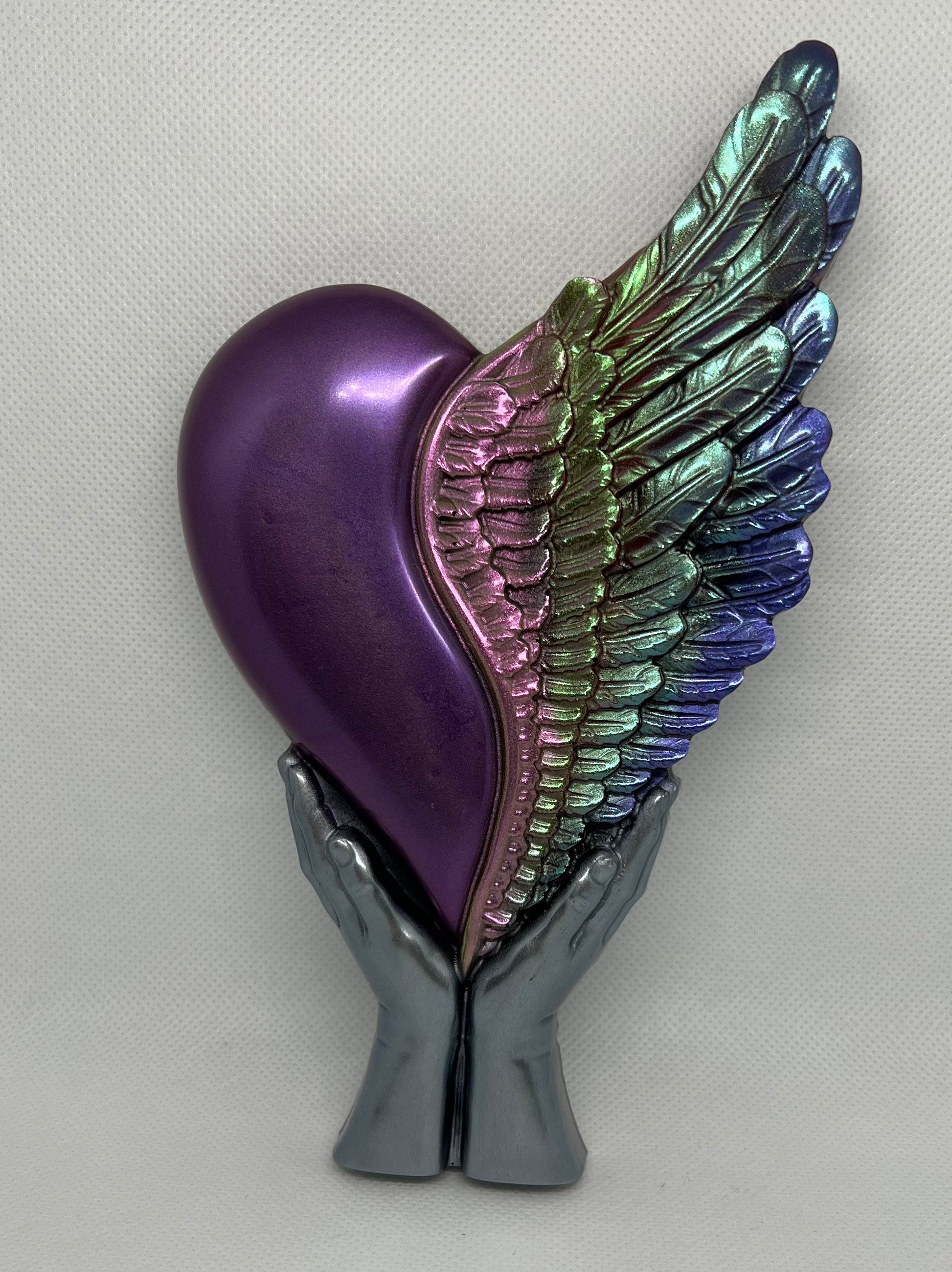 Expertly handcrafted with epoxy resin, Love Wings is a stunning home decor piece that beautifully expresses pure love. Featuring delicate hands holding a heart with ethereal wings, it serves as a perfect addition to any living space or a heartfelt memorial. A true testament of love, represented with precision and care.