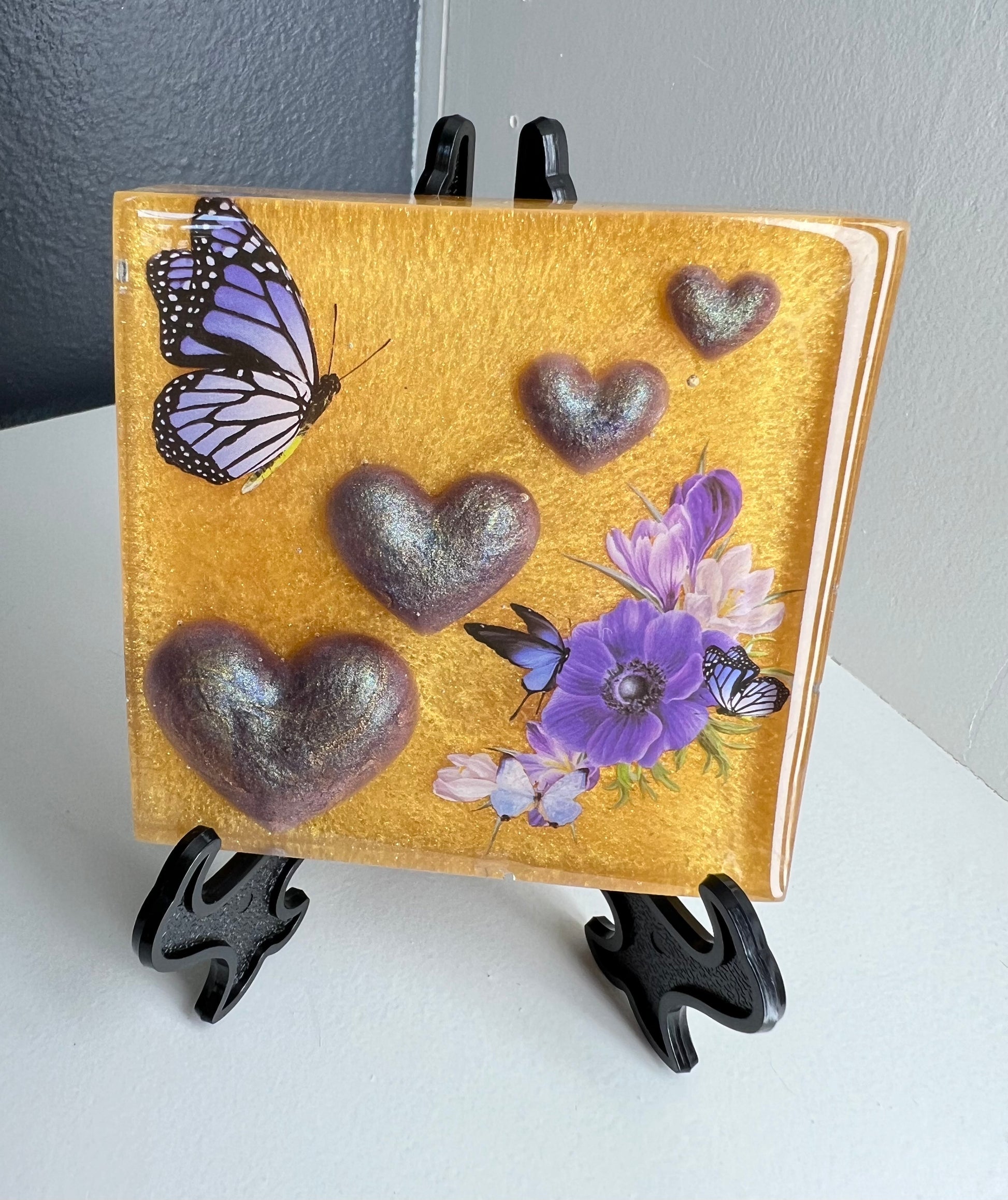This small Heart Butterfly Picture is a stunning addition to any home or office. Made out of epoxy, it features beautiful hearts with butterflies and comes with a stand for easy display. Add a touch of beauty and elegance to your space with this gorgeous piece.