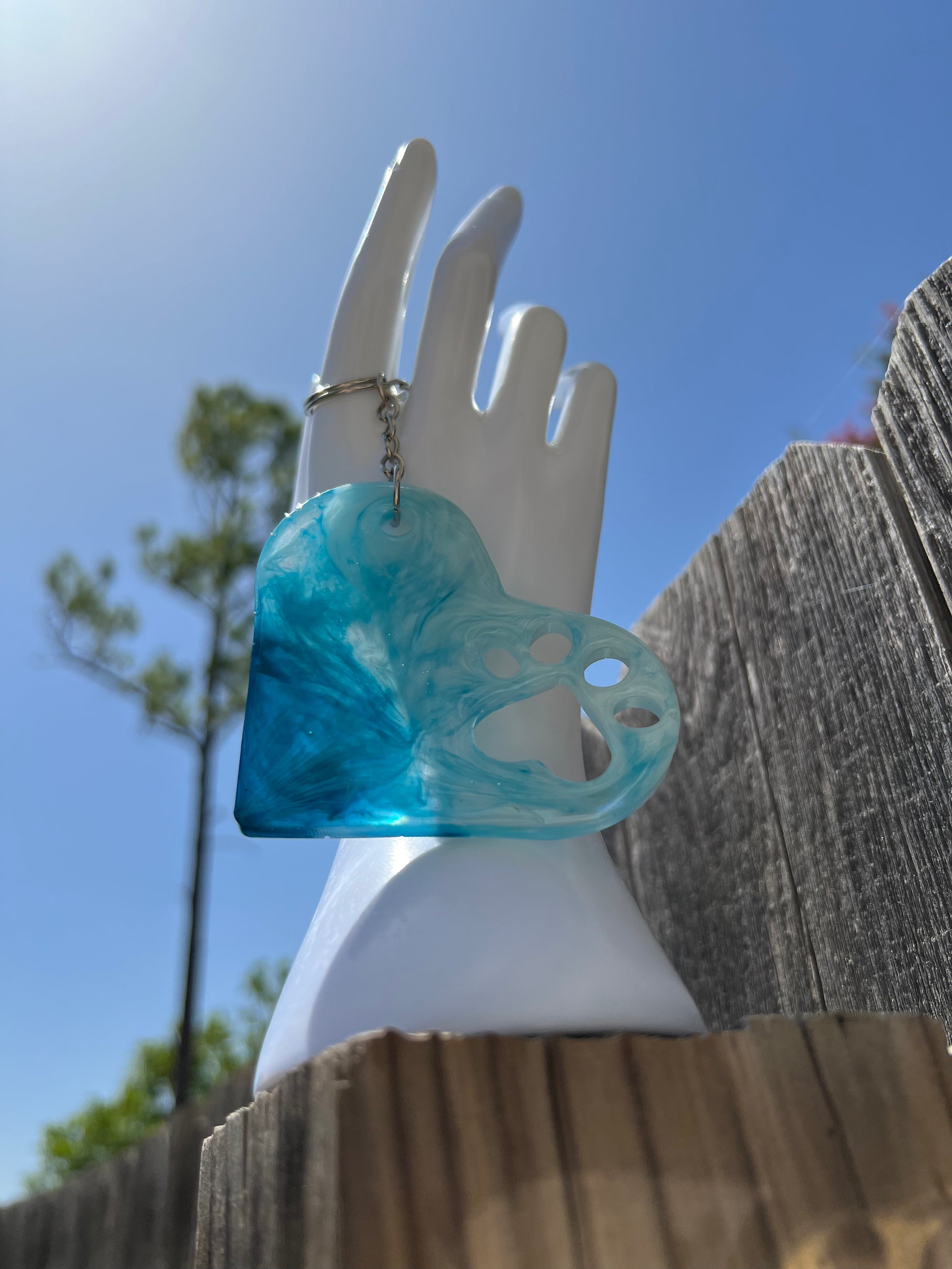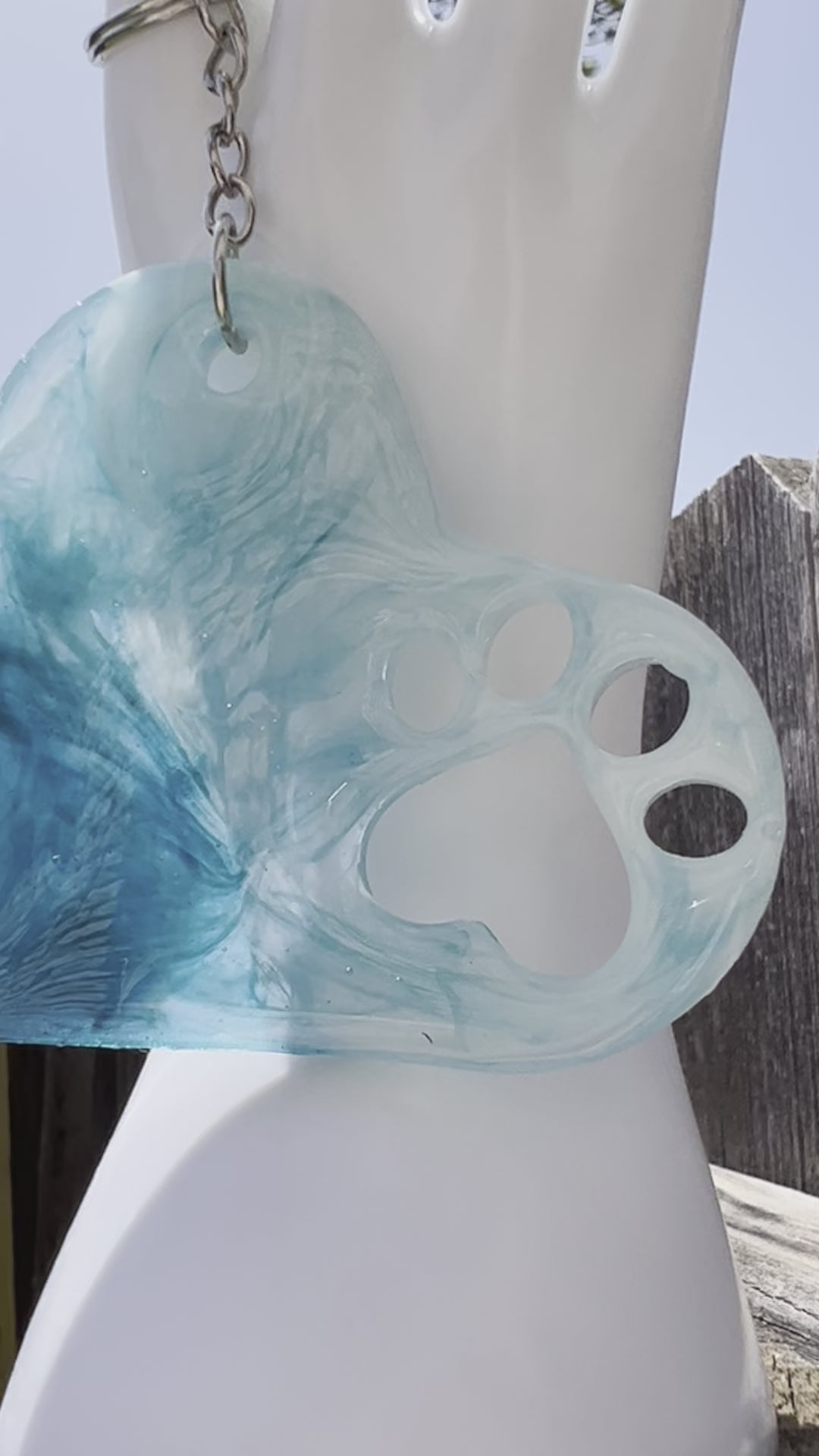 This unique keychain features a paw design in a beautiful emerald green and blue mixture. Expertly handmade with durable epoxy, this is a keychain that you can rely on to last.