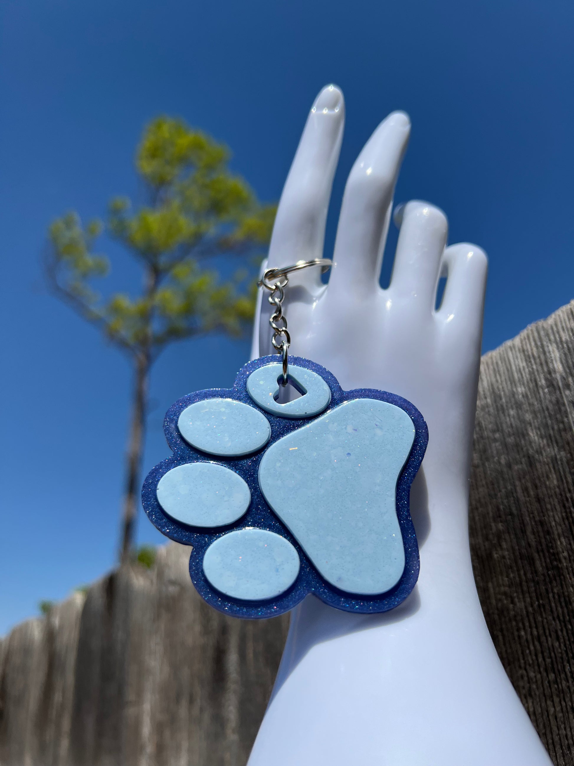 This handmade keychain is the perfect way to keep your keys organized. Crafted from dark mica blue with light blue accent, the paw-shaped design adds a touch of style to any set of keys. Epoxy resin ensures durability, making this keychain the perfect accessory for every day use.