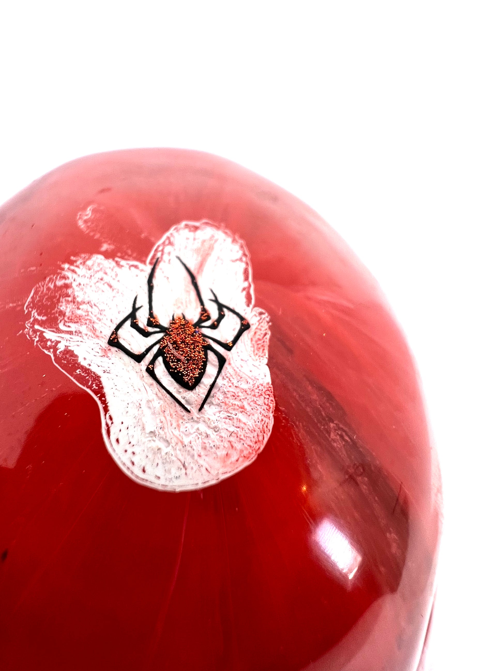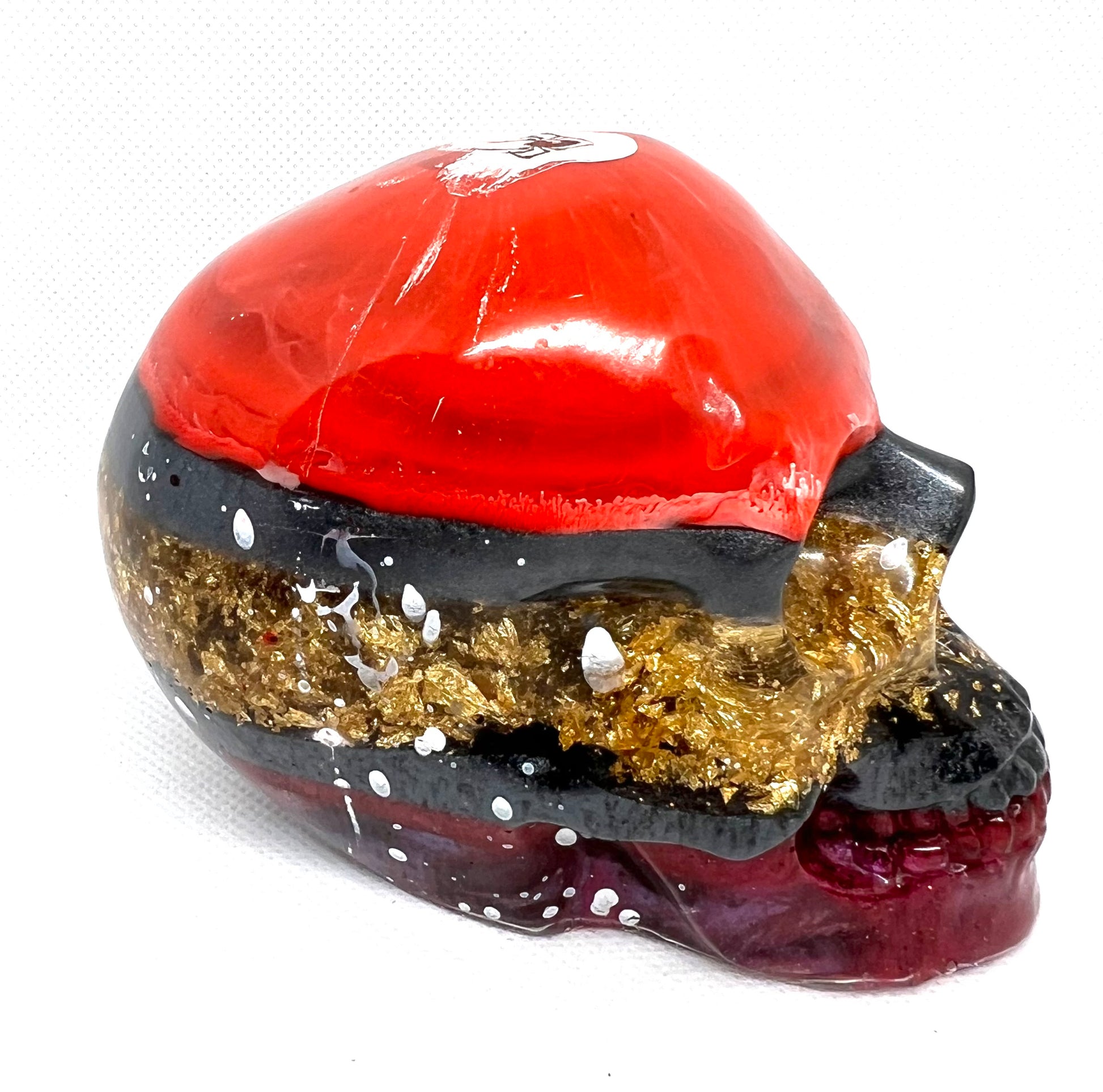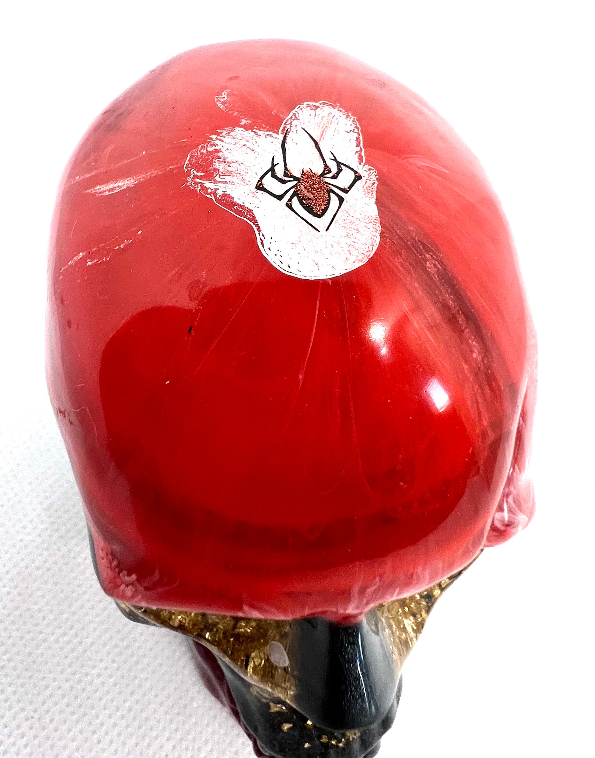 Introducing our Large Decorative Skull - a unique statement piece for Halloween lovers. Handcrafted with epoxy resin, this one-of-a-kind skull features a colorful design of red, black, and gold flakes, with a spooky spider on top. Perfect for adding a touch of Halloween spirit to any space.