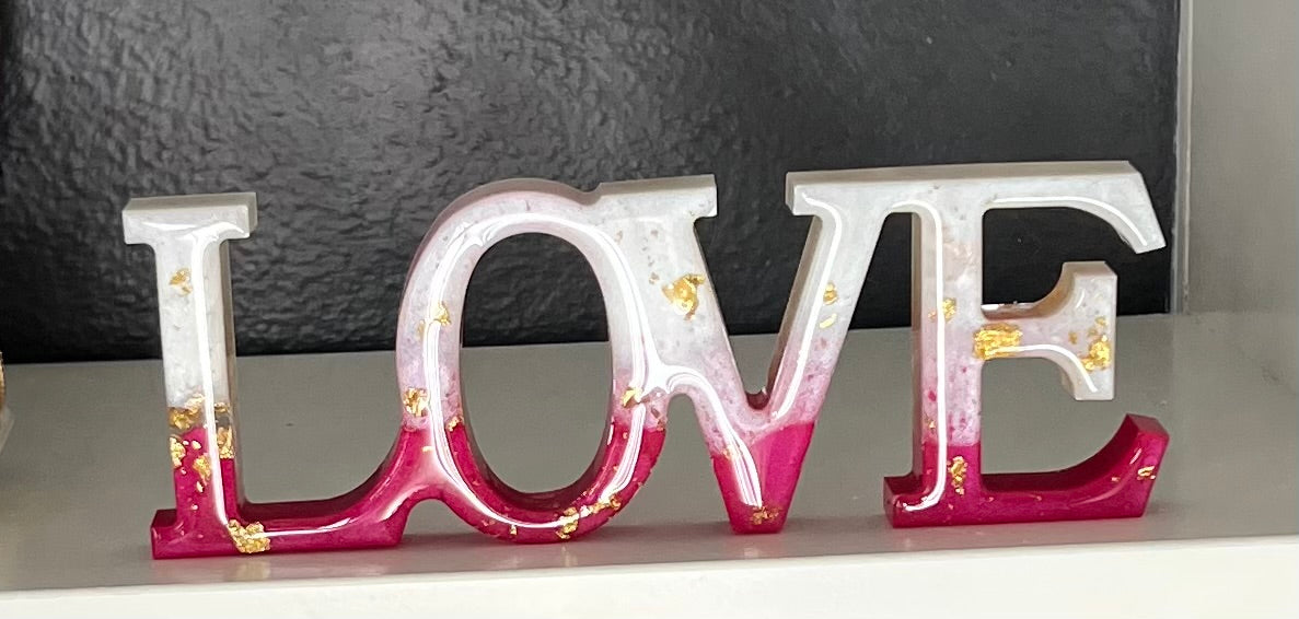 Express your love in a unique way with our handmade LOVE sign. Made with gorgeous red, pearl, and clear epoxy, and accented with gold flakes, each piece is one of a kind. Show your love this Valentine's Day with this stunning decorative piece.