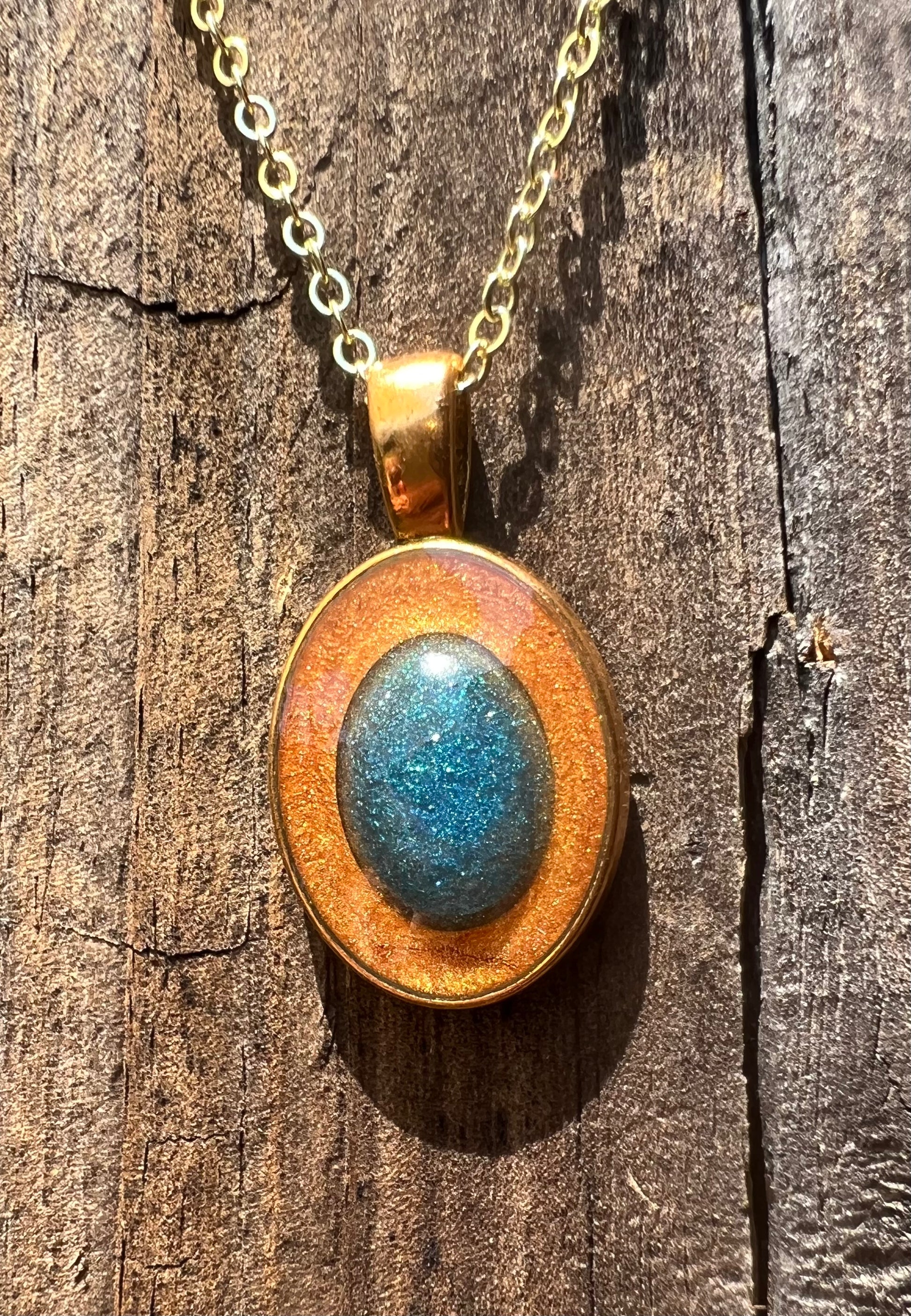 These one of a kind beauties will catch others eyes as it gleams around your neck! Each necklace is made with high quality epoxy resin and gorgeous mica powder. It is designed to be comfortable and a lightweight feel. The pendant bezel is made of a durable metal alloy, with electroplating silver and bronze on top.