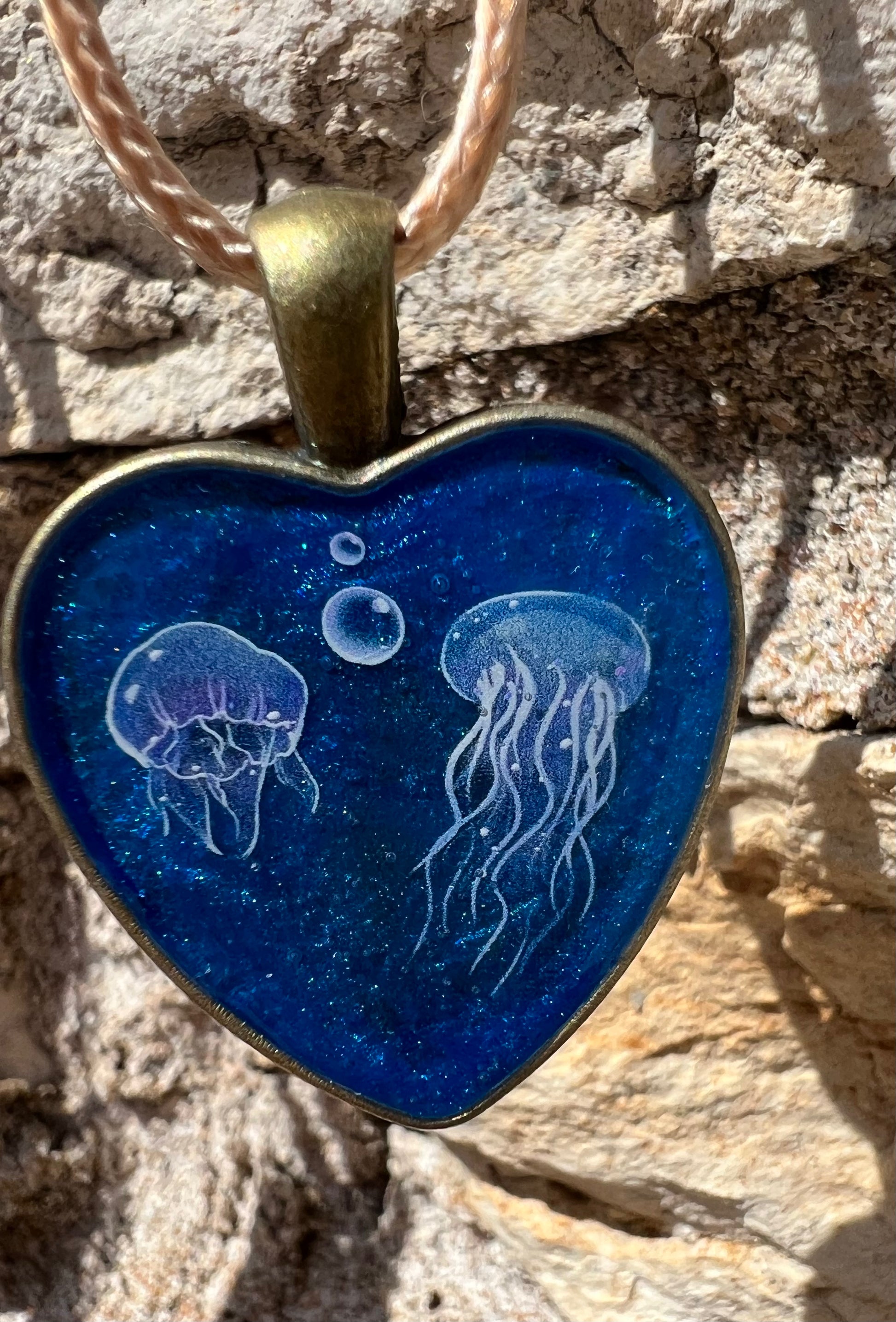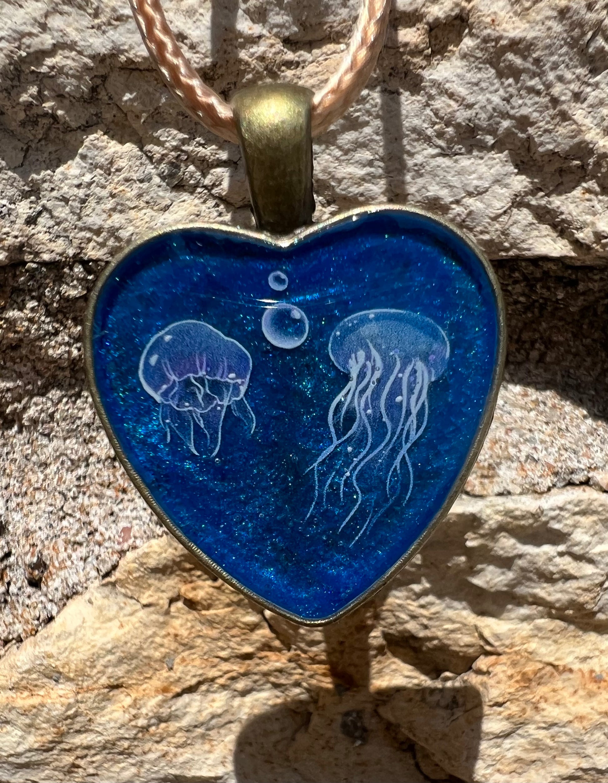 The stunning 3-D affect that these jellyfish bring to this pendant is amazing! Bring the the ocean to your heart as you wear this and catch others eyes as it gleams around your neck! Each necklace is made with quality epoxy resin and gorgeous mica powder. The pendant bezel is made out of a durable metal alloy, with electroplating silver and bronze on top.