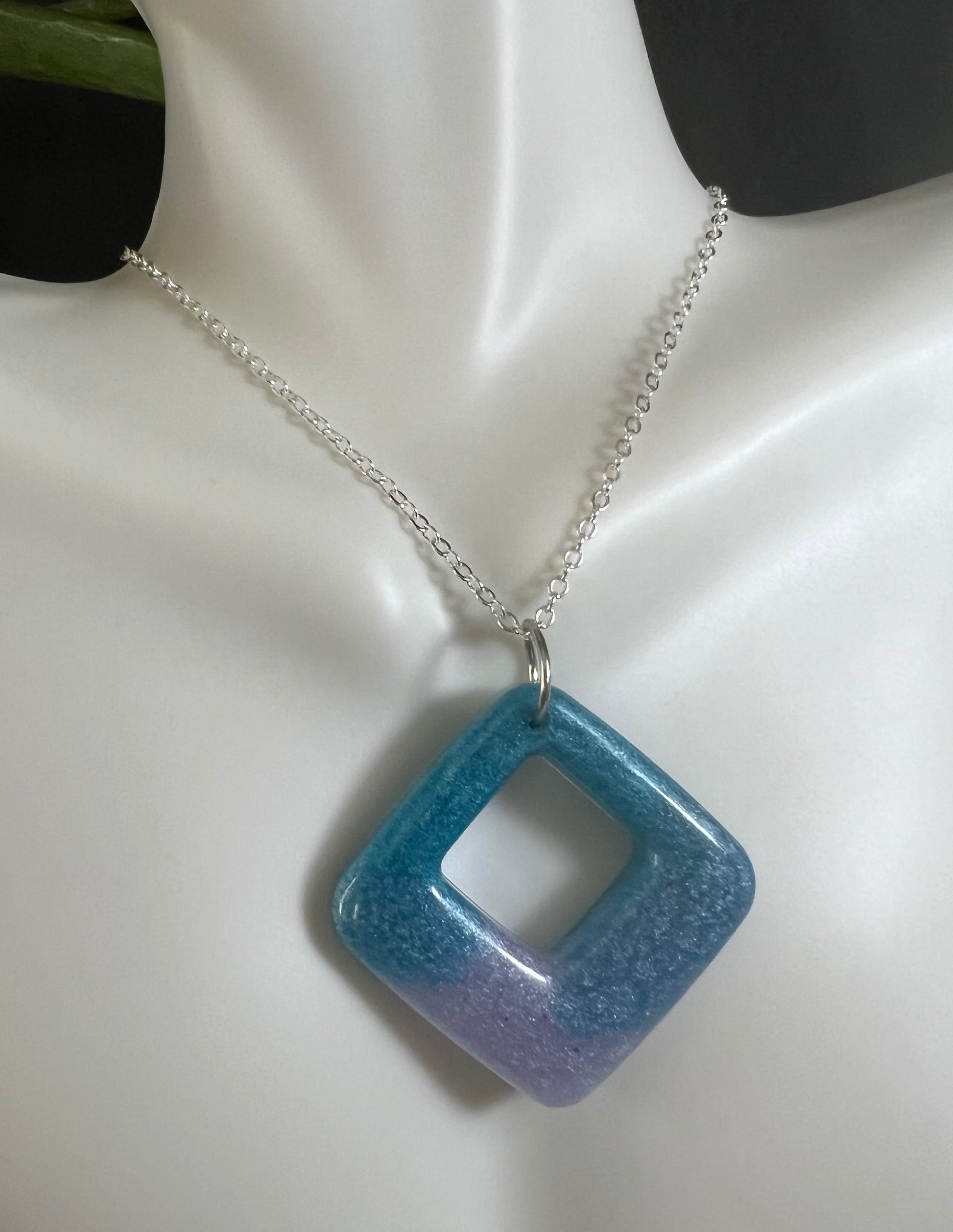 This epoxy necklace has an eye-catching mix of light glittery blue and soft pink for a unique statement piece. Its effortless combination of colors will add a touch of flair to any look.