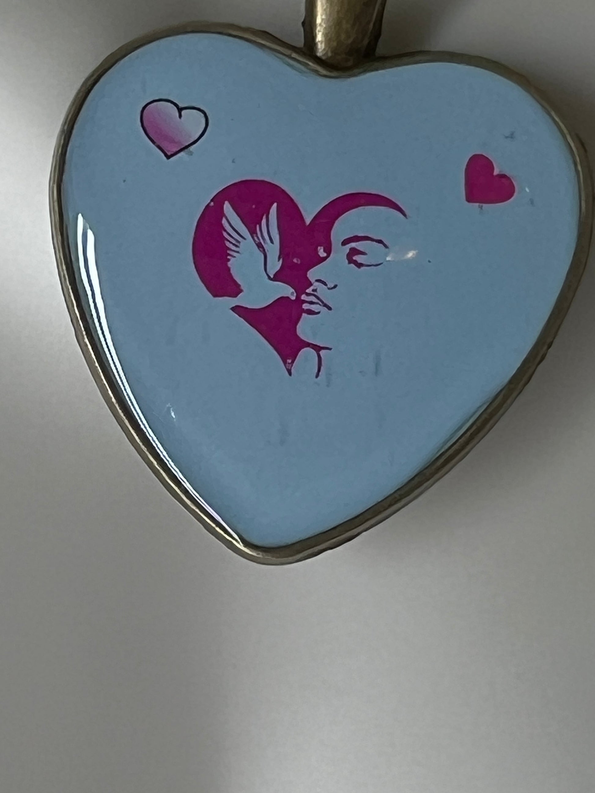 This heart shaped necklace features a light blue epoxy adorned with pink hearts, symbolizing breast cancer awareness. Make a statement and support a cause by wearing it. 50% of the profits will be donated to breast cancer awareness.