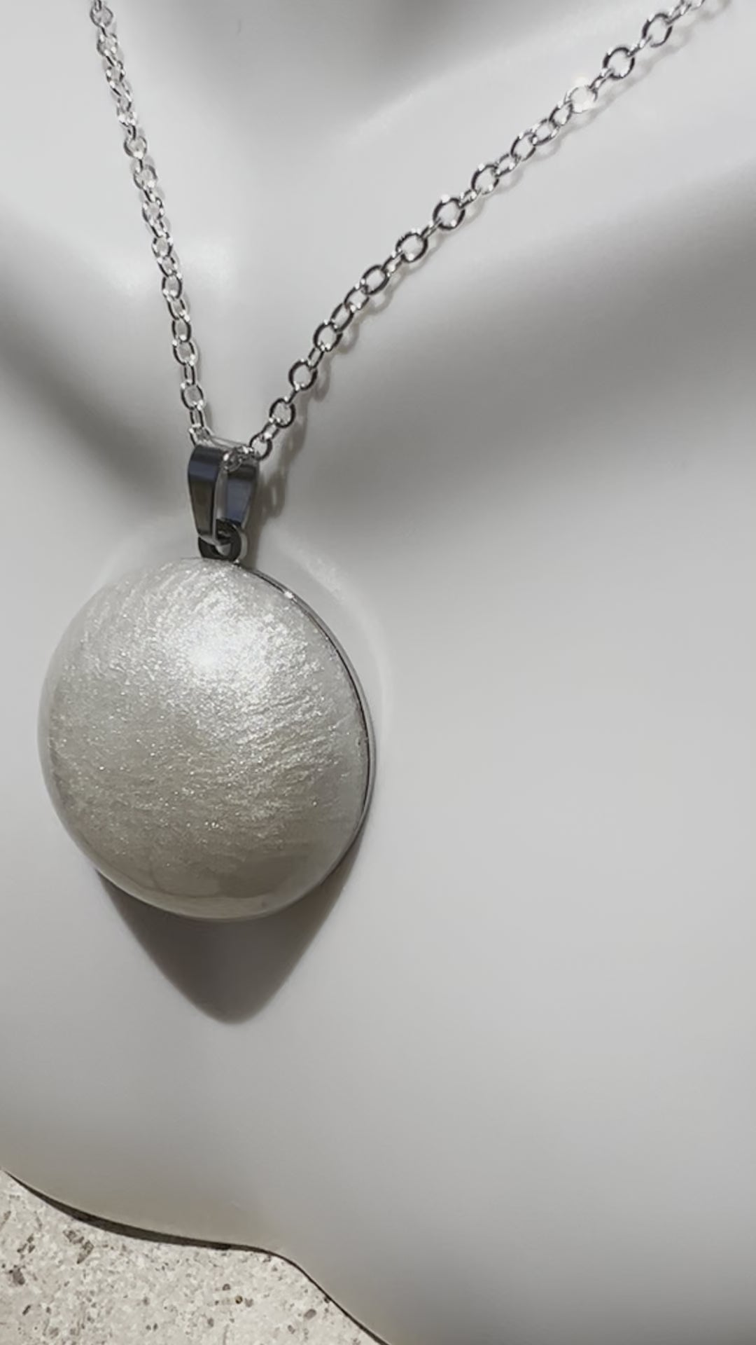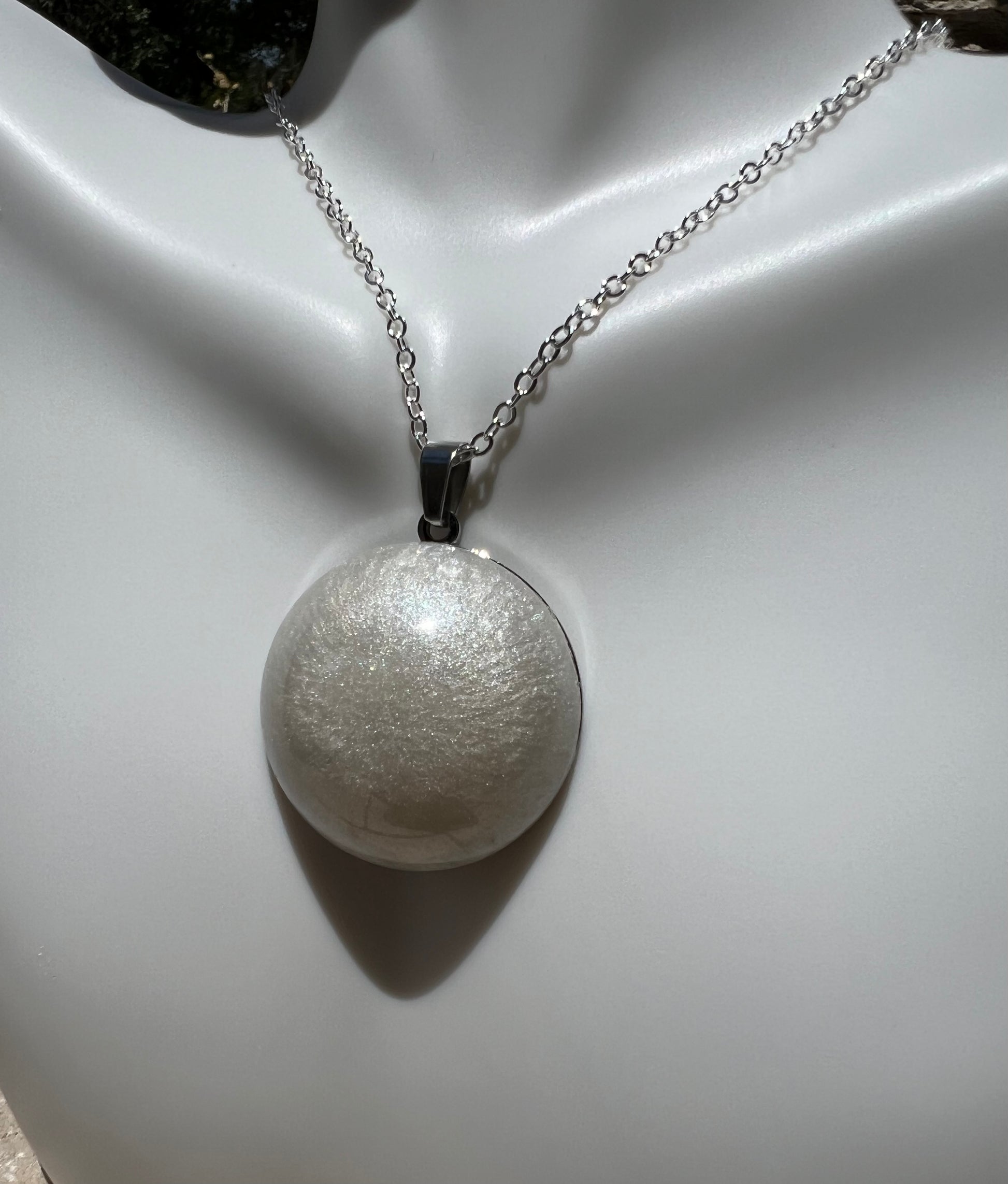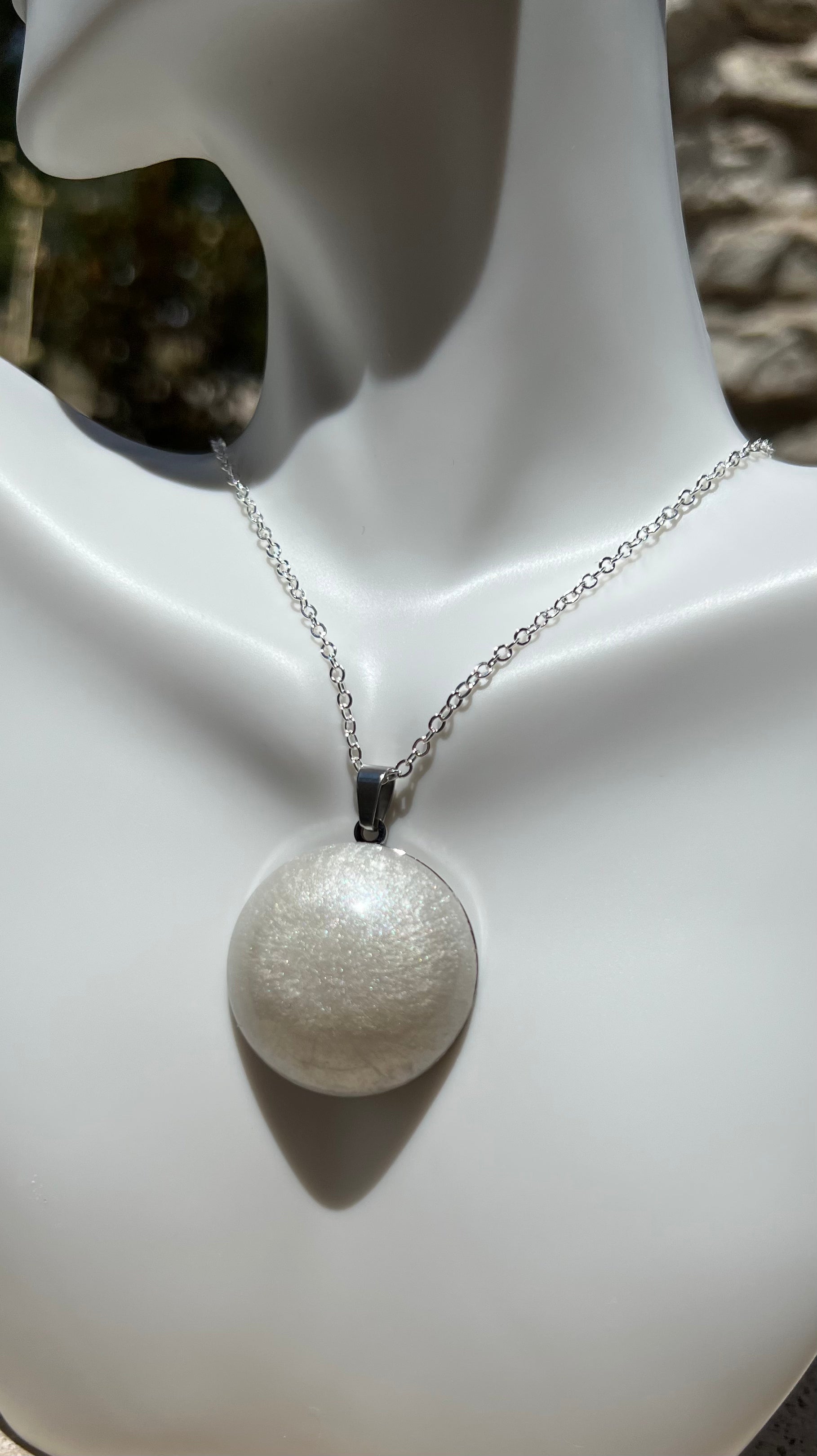 This necklace is the perfect accessory for any outfit. Handmade with a unique pendant featuring epoxy and mica to create a dazzling sparkle, this necklace will give you a stylish and classy look.