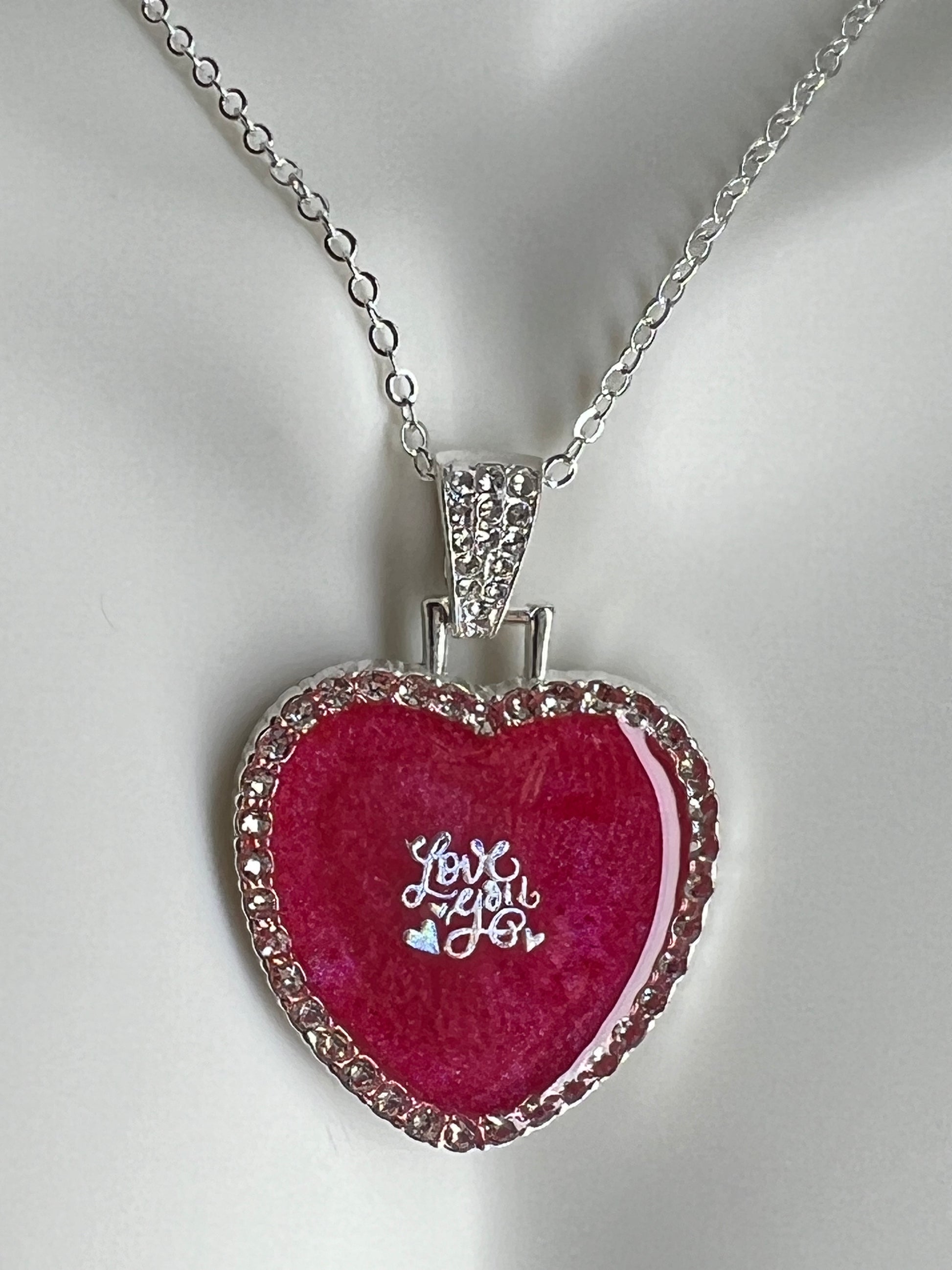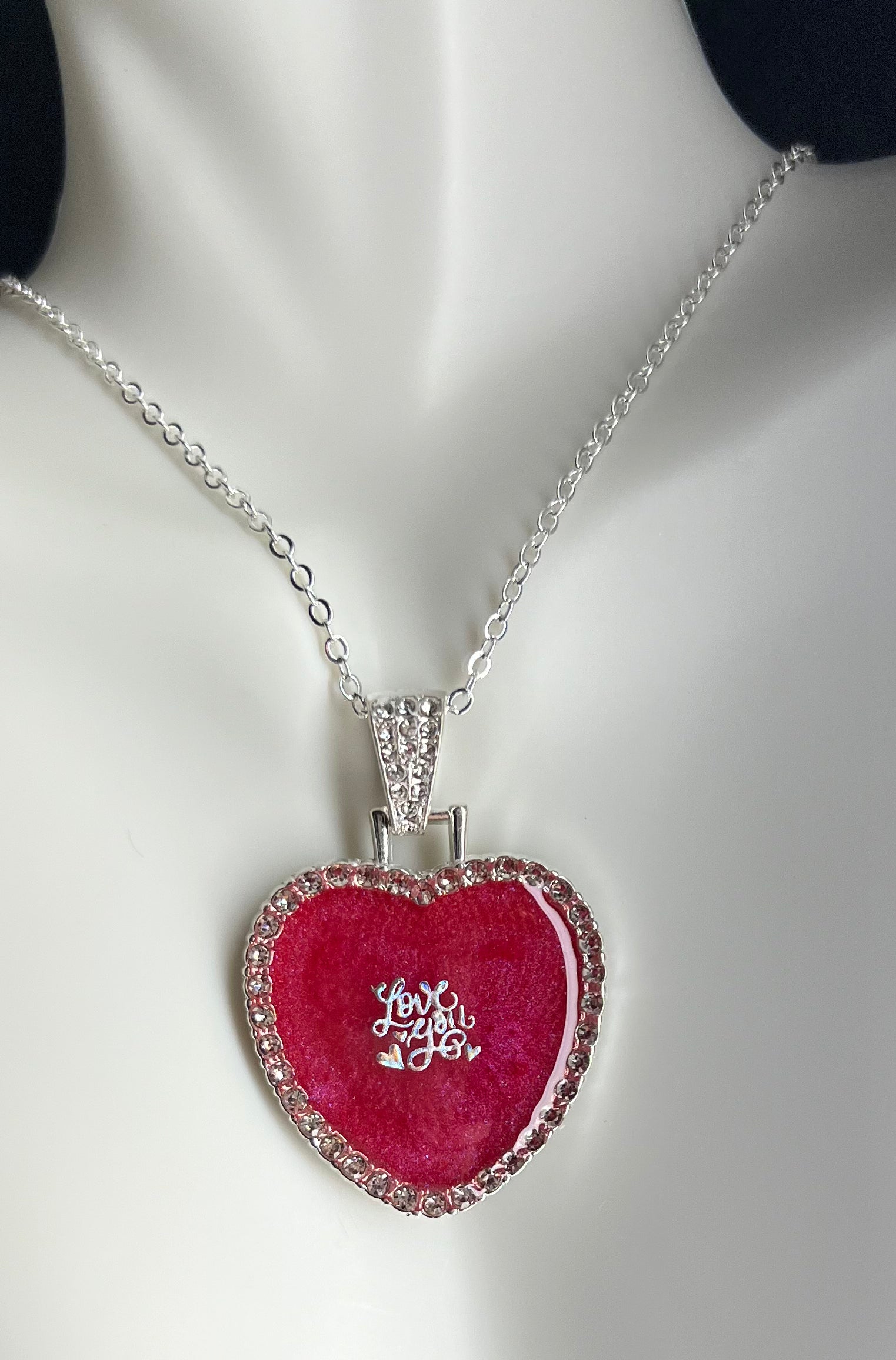This elegant necklace features a stunning heart-shaped pendant made with red epoxy and adorned with sparkling rhinestones. Perfect for any occasion, it adds a touch of romance and sophistication to any outfit. Display your love and style with this beautiful Valentine's necklace.