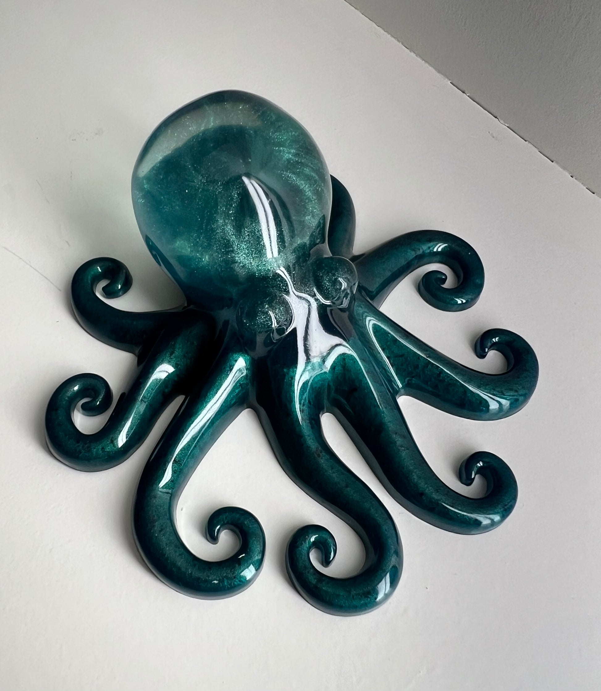 This unique Octopus is handcrafted using durable epoxy, resulting in an adorable little creature that is both visually stunning and conversation-worthy. With its gorgeous deep green color, this piece is the perfect addition to any decor. Crafted with expert precision, it's sure to impress.