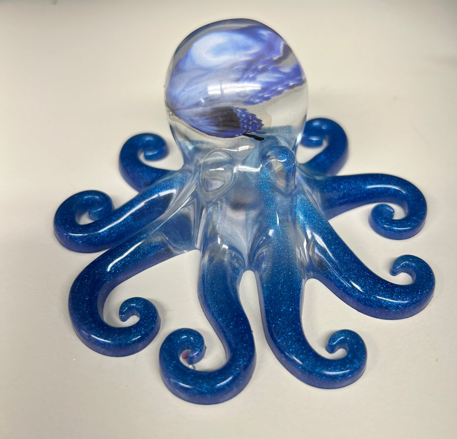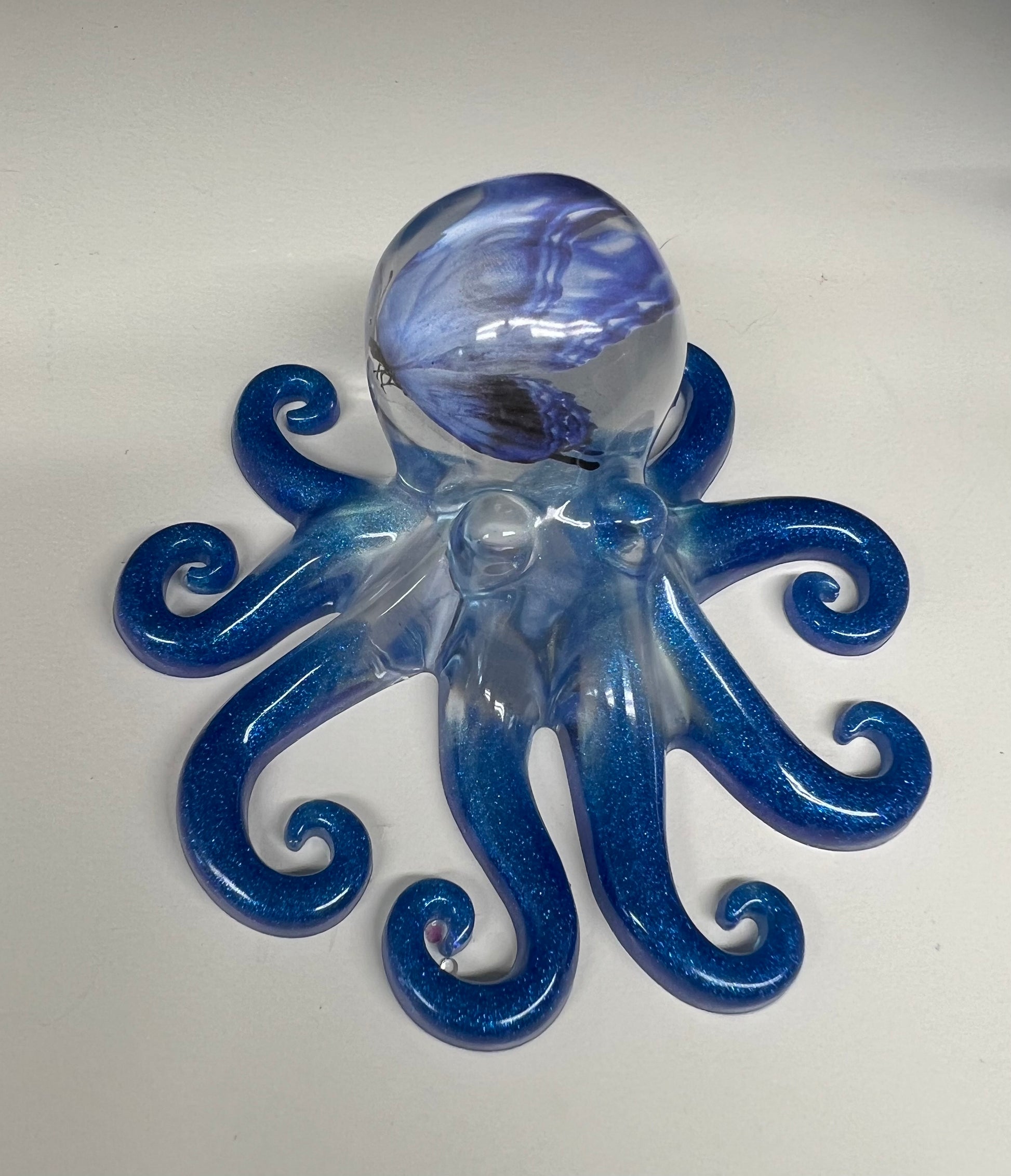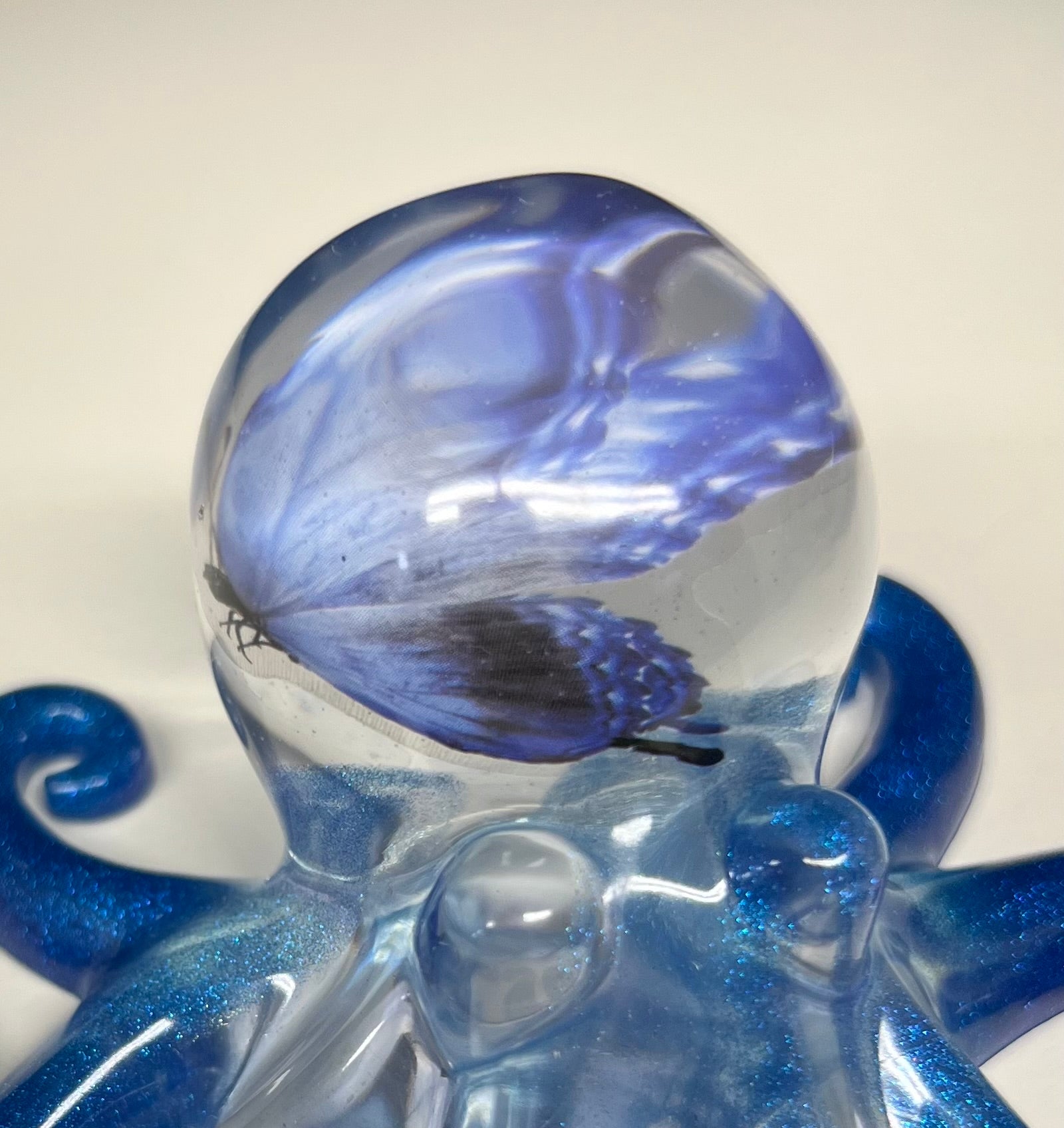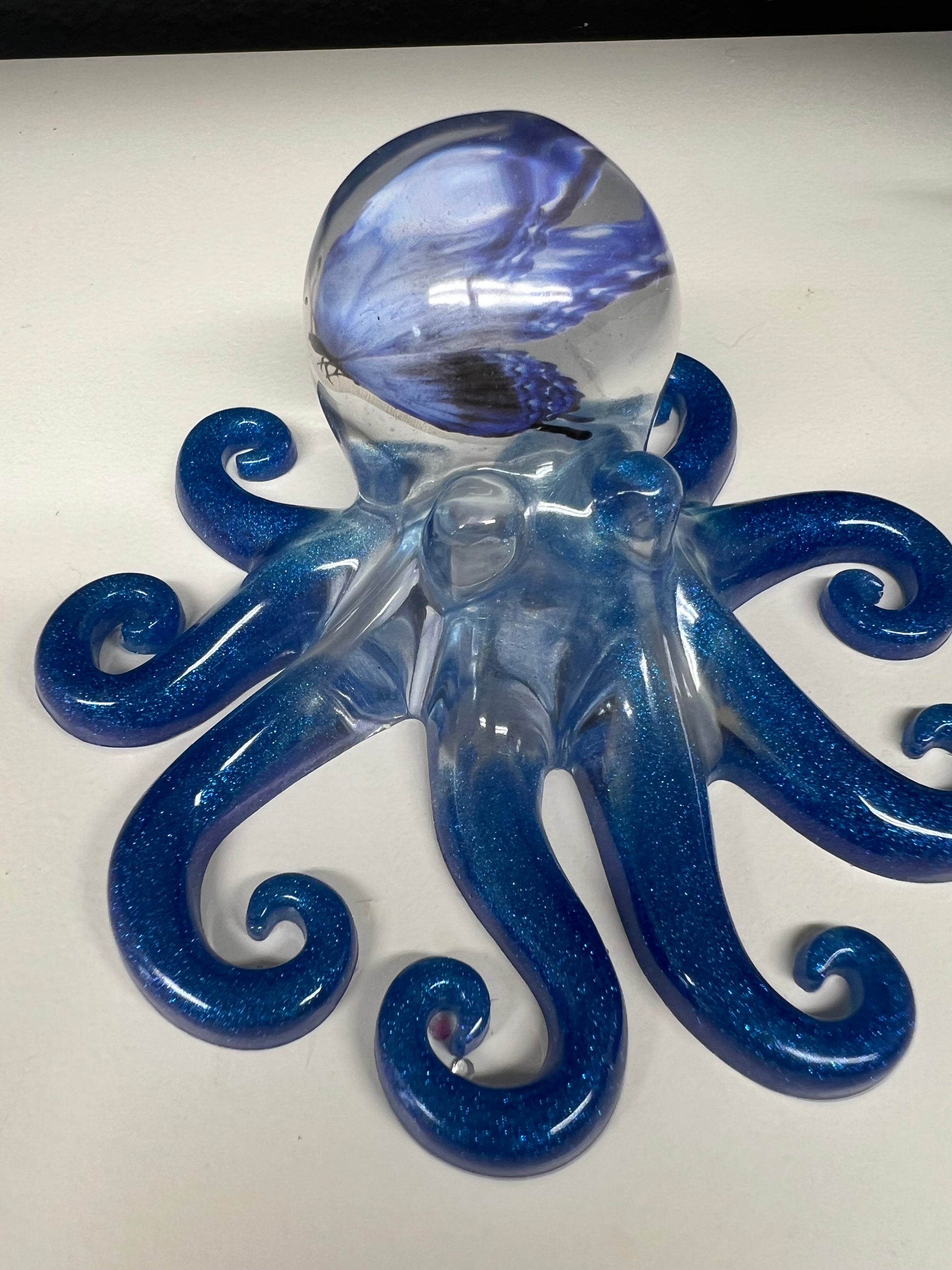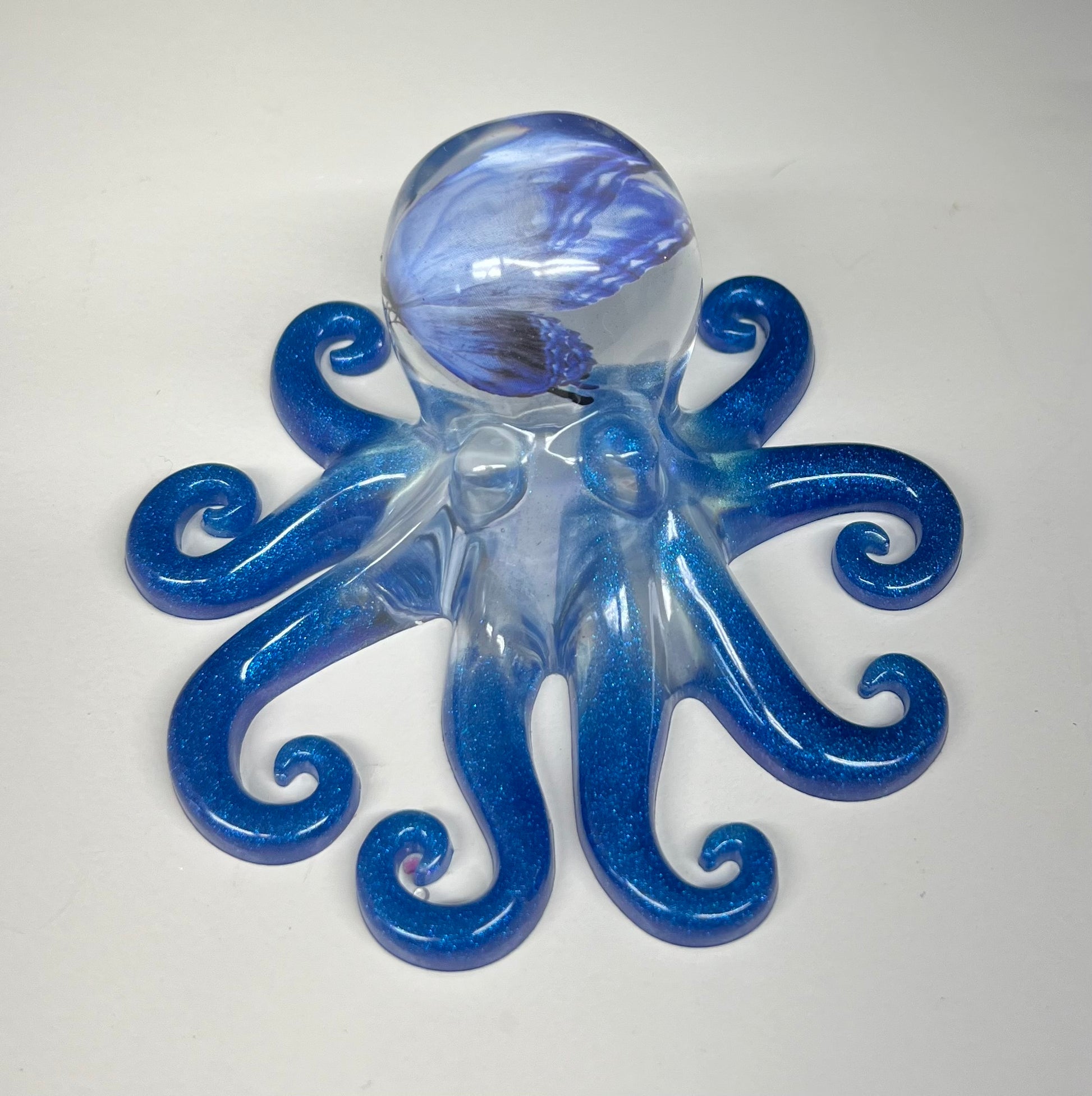 Discover the captivating charm of the ocean through our exquisite Octopus with blue butterfly. Meticulously crafted from epoxy resin, this distinctive piece showcases vibrant blue tones, making it an exceptional accent for your home or office. Elevate your environment with this elegant and nature-inspired artwork.