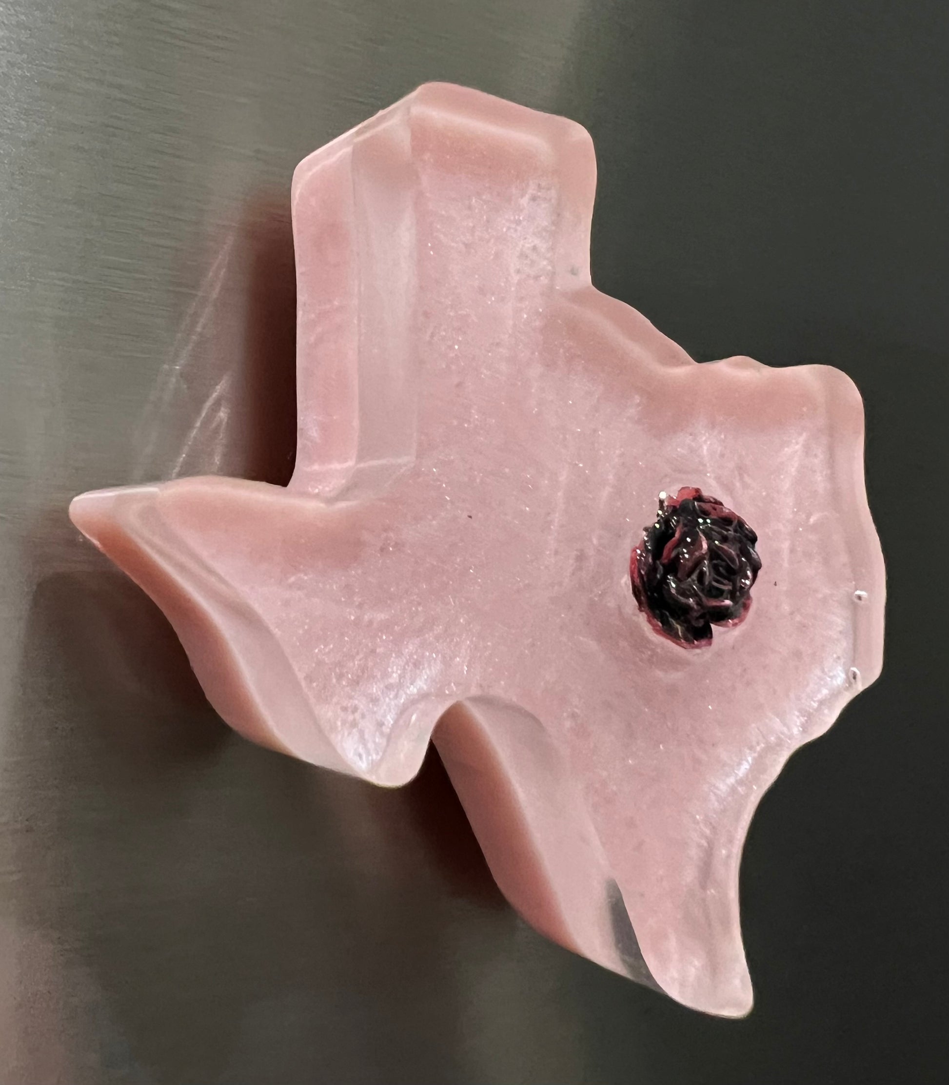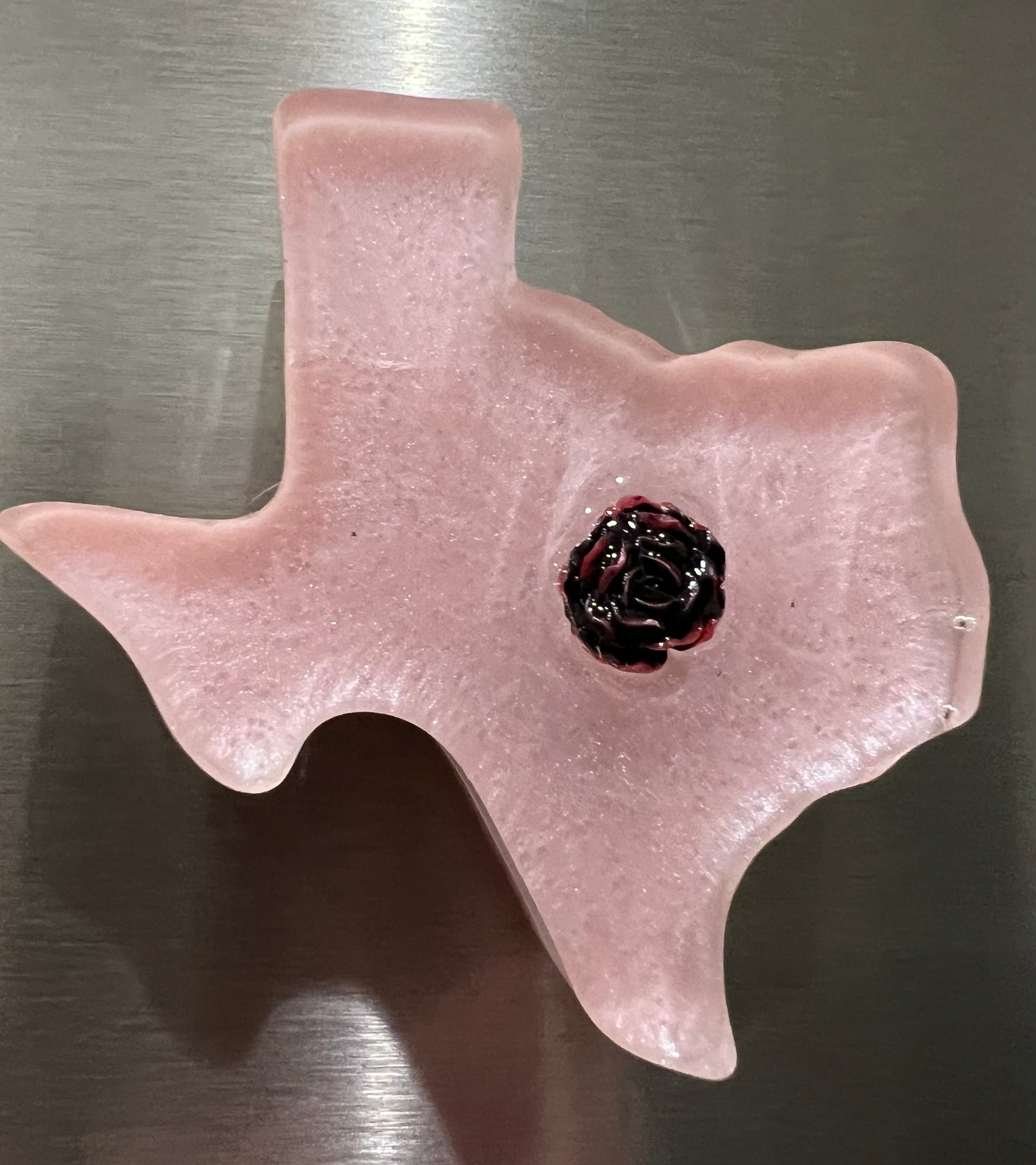 The Pink Texas Magnet with Rose is a unique and stunning addition to any collection. Crafted in the shape of the state of Texas, the soft pink magnet showcases a vibrant red rose, symbolizing the capital. Expertly designed, this magnet is truly one of a kind.