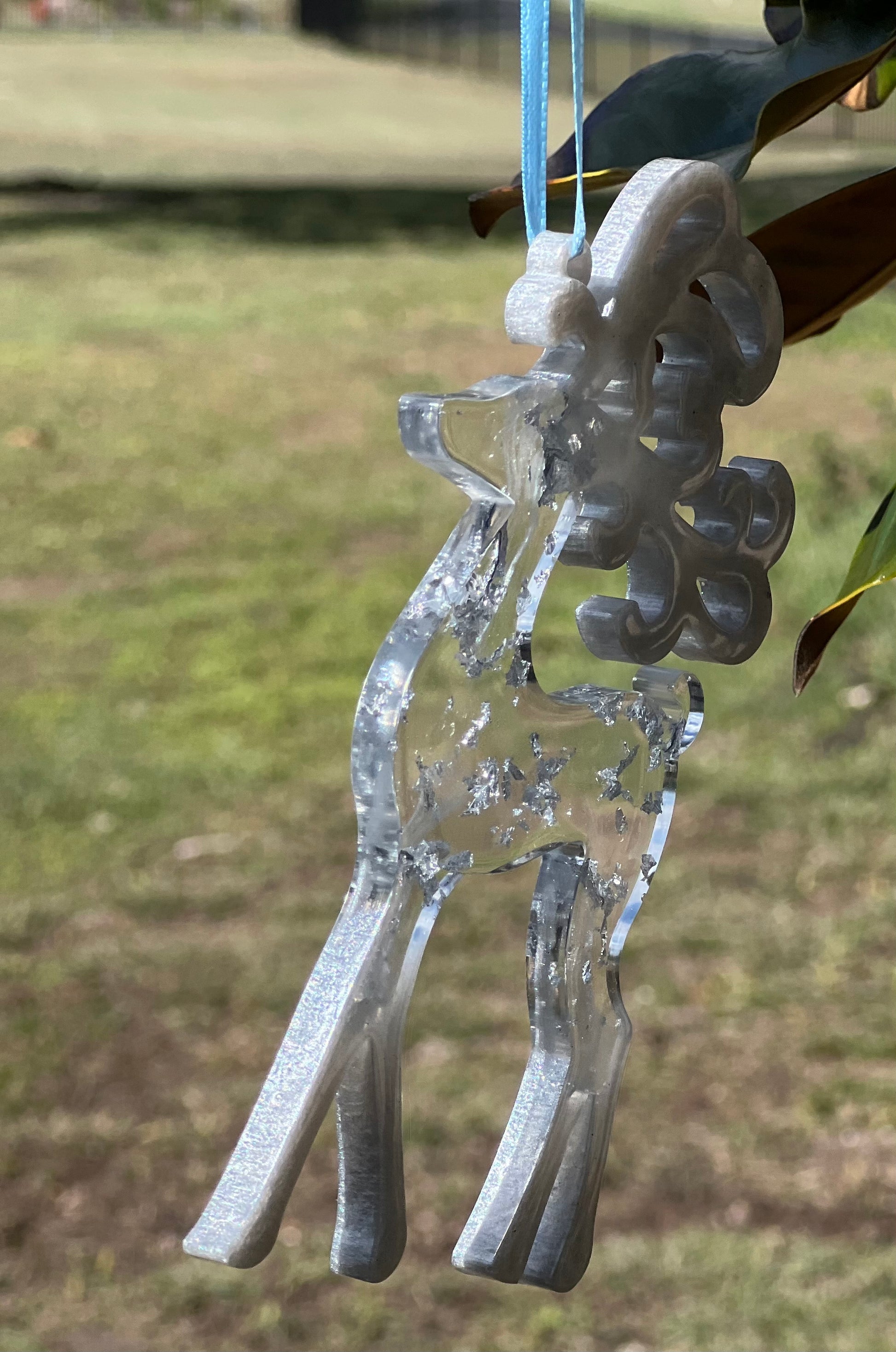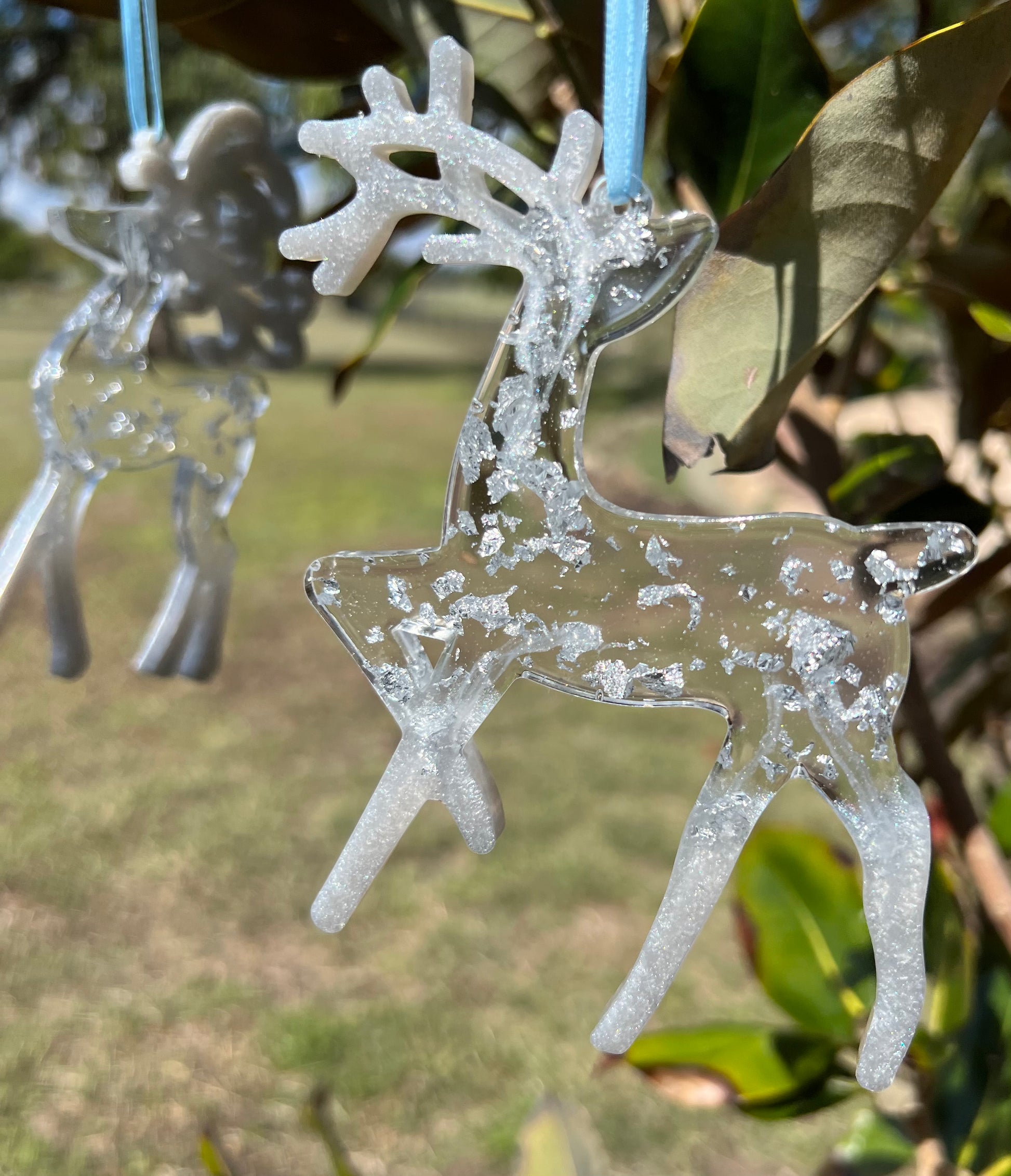 This pair of Reindeer Ornaments are handmade with epoxy resin and silver flakes, creating a unique look that sparkles elegantly. These ornaments are sure to add an exquisite touch to any holiday home decor. These come as a pair.