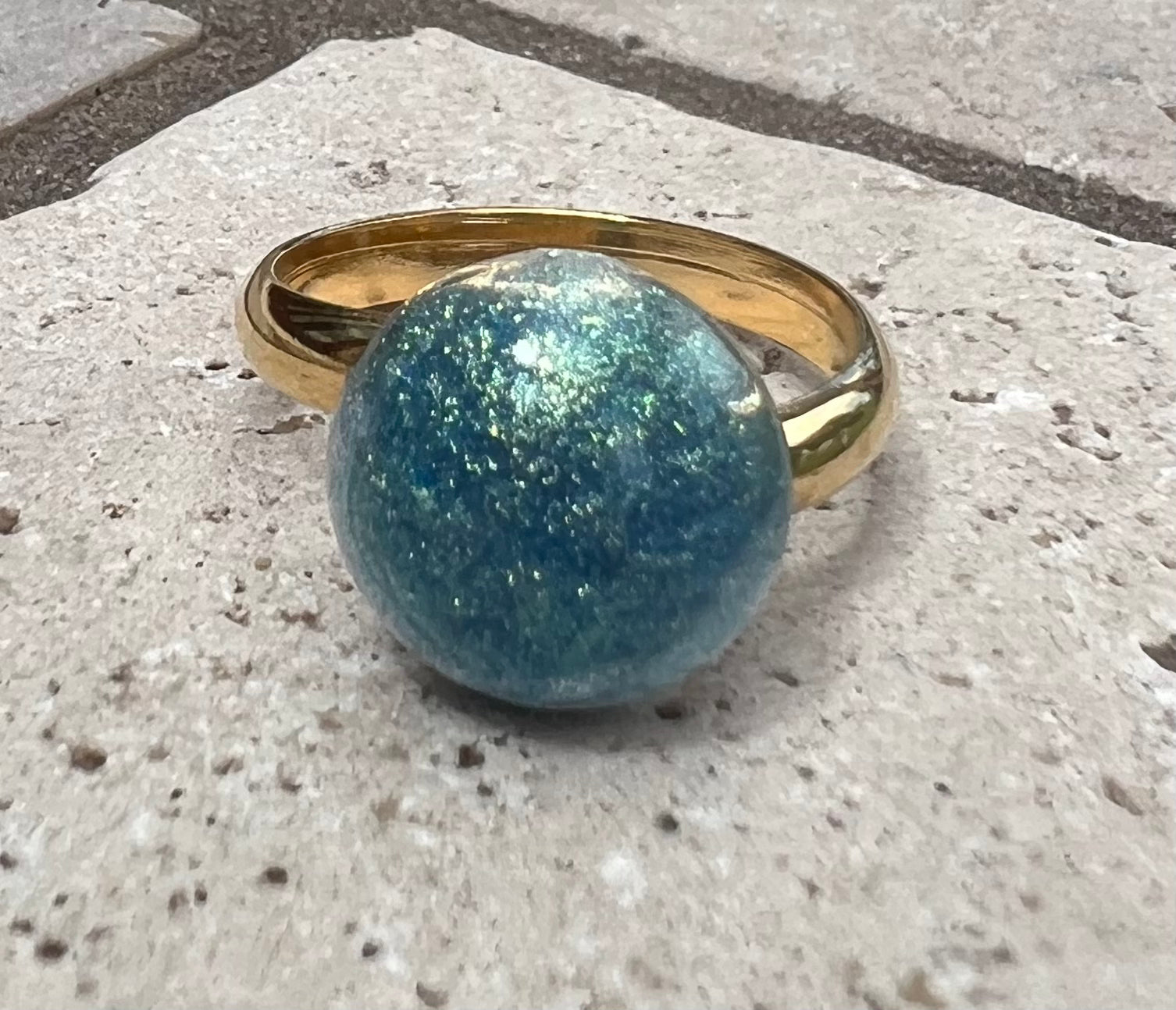 These charming rings raise your spirits as it shines on your finger! Each one is handmade with high quality epoxy resin and mica powder. The adjustable rings are 17mm in diameter and can expand to other fitting size. The ring is stainless steel and gold plated.