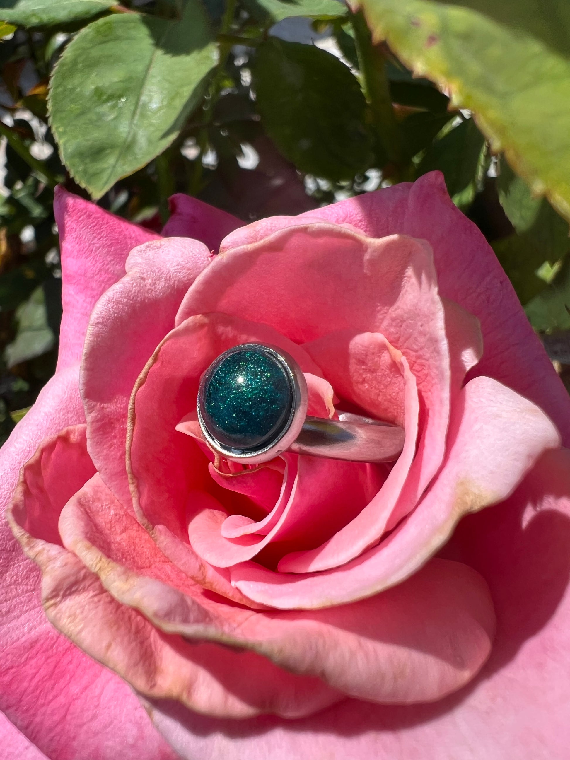This silver ring is perfect for adding a touch of classic elegance to your look. Its unique emerald green gem is handmade using epoxy and captures the light beautifully. Enjoy the sophistication of this exquisite piece for any special occasion.